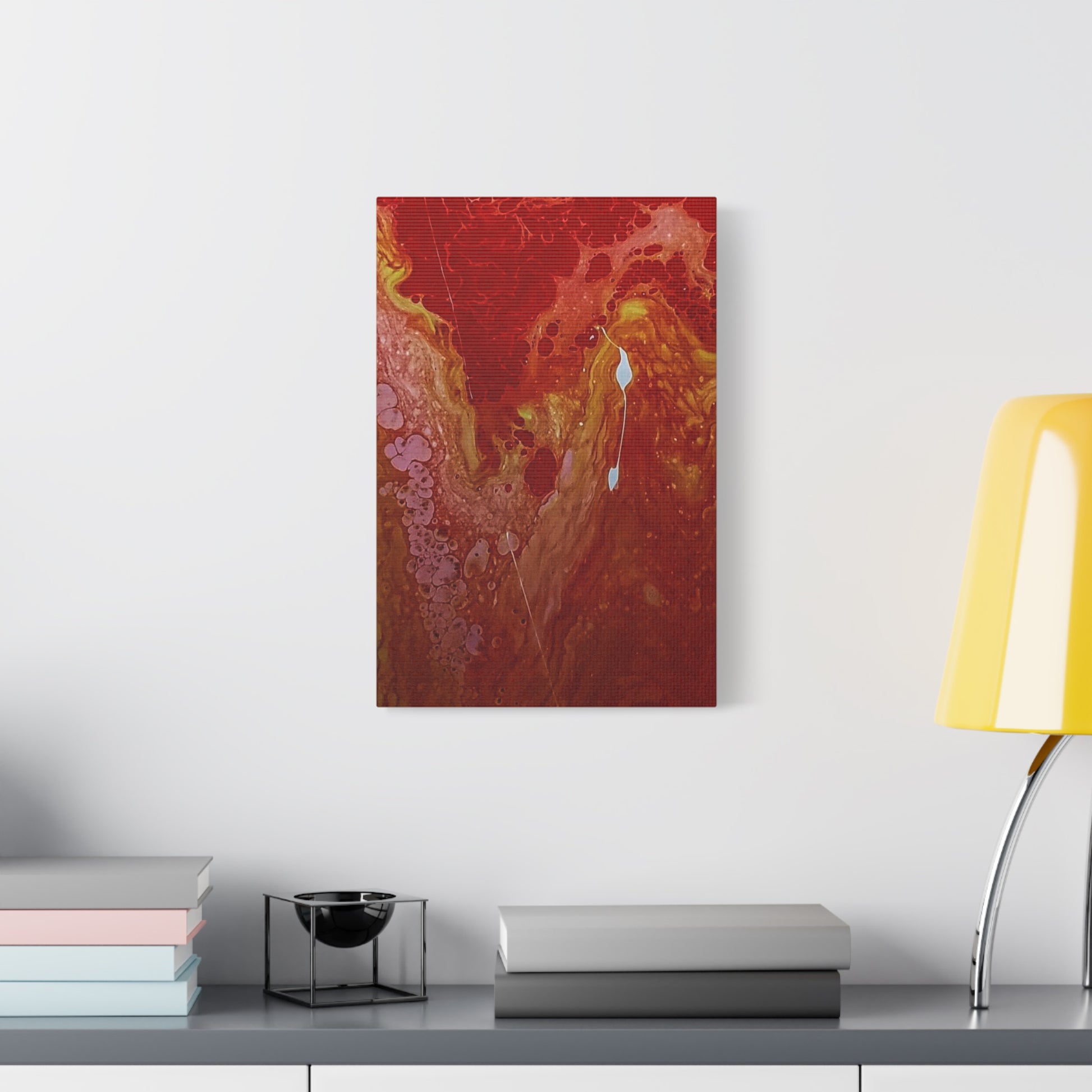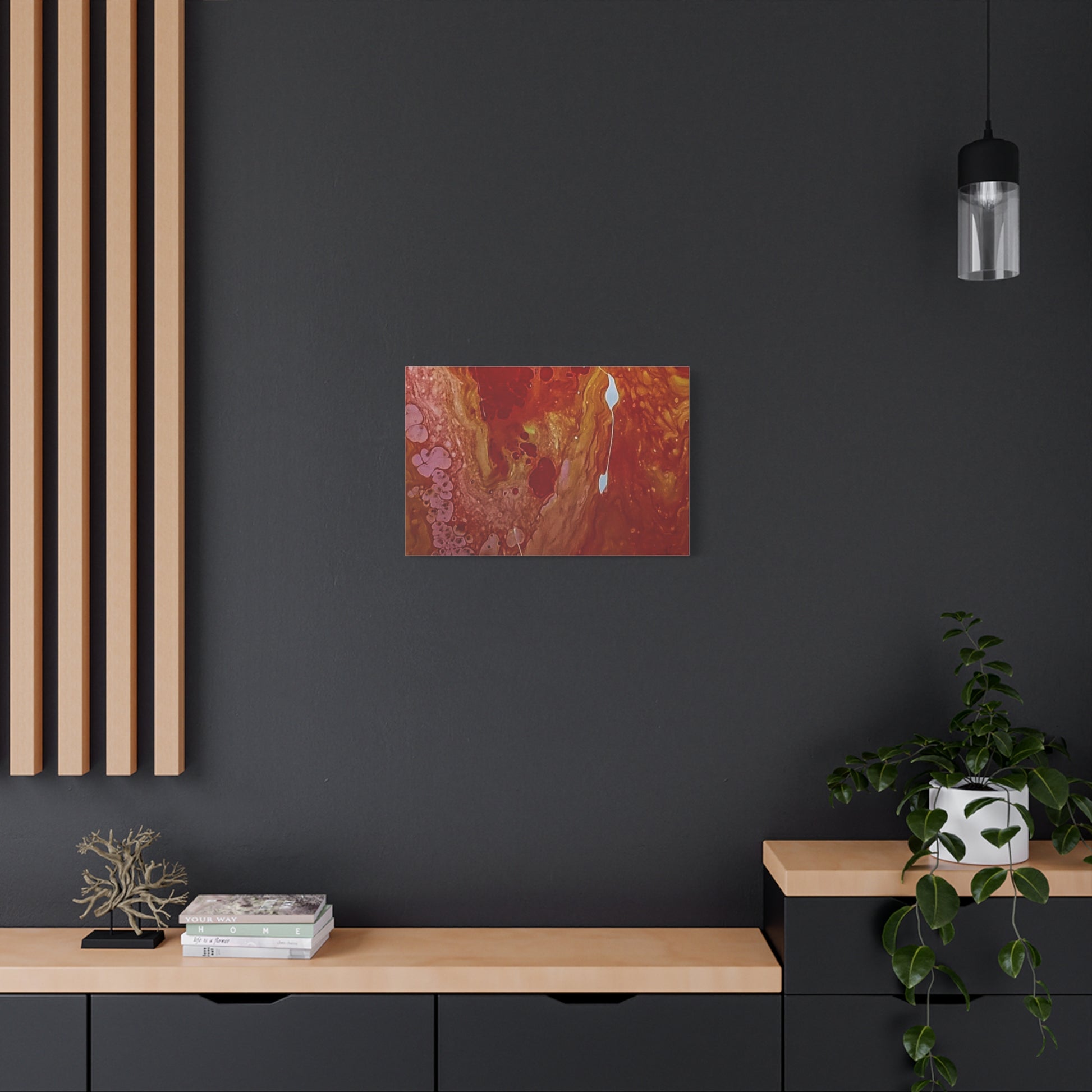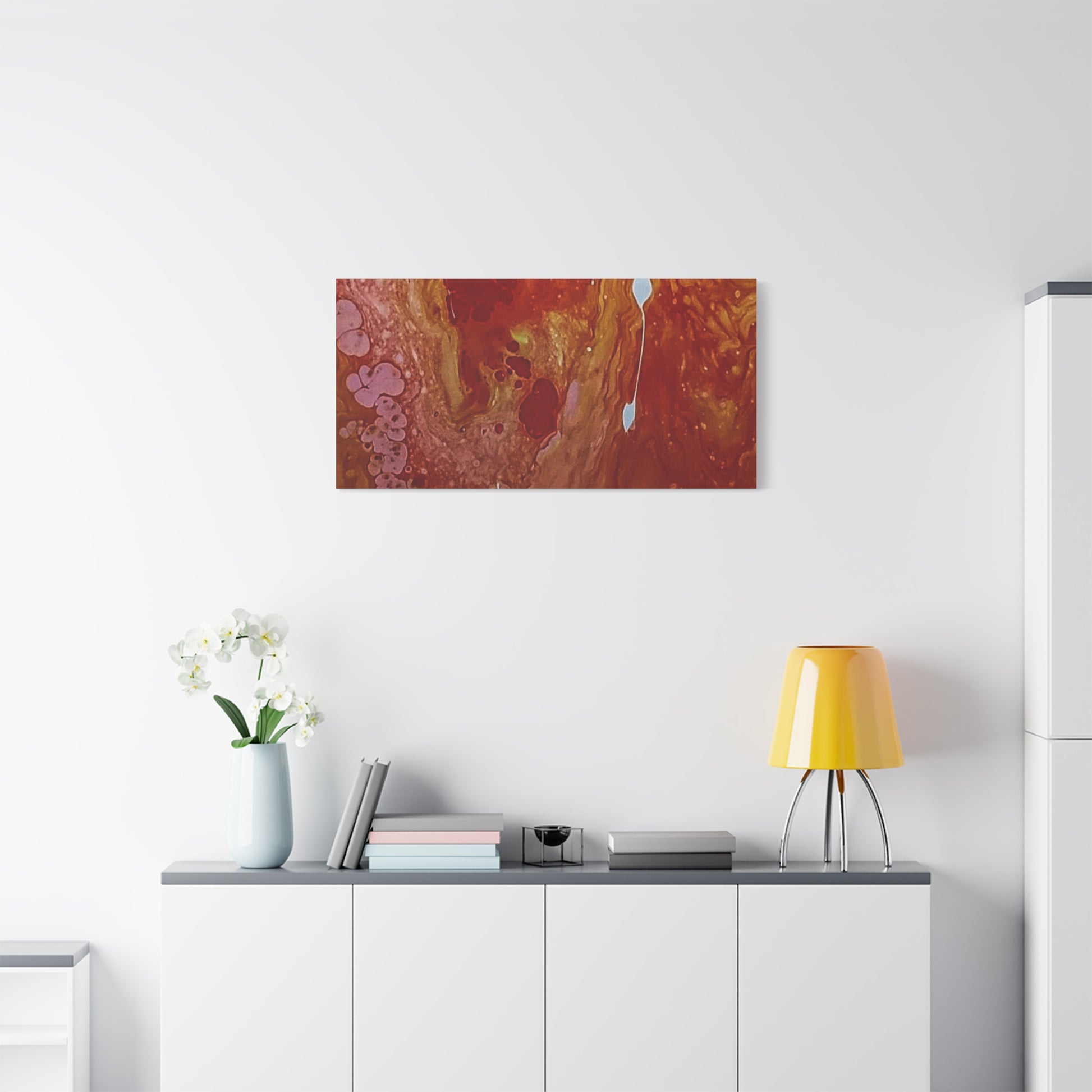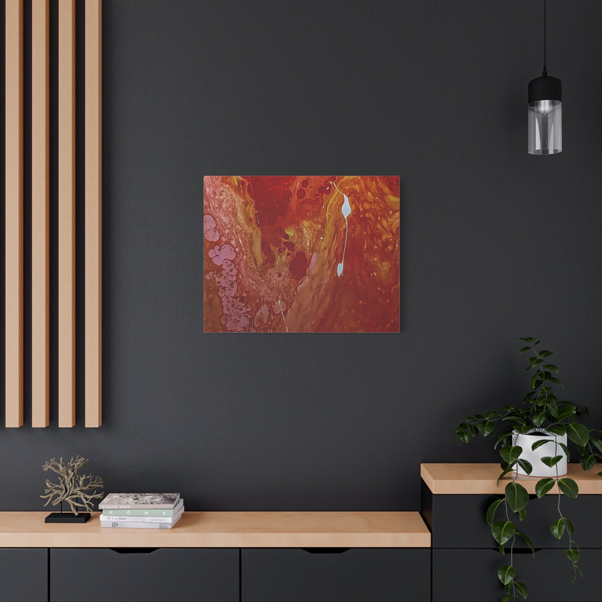 This stretched matte canvas brings a warm, tactile presence to any room. Deep reds, burnt oranges and subtle pinks flow together in an abstract, fluid composition that feels like liquid light frozen mid-motion. The 1.25" depth and hand-stretched pine frame give a gallery-ready silhouette that sits confidently on a wall without a separate frame. Hang it above a mantel, lean it on a shelf, or use it to anchor a cozy reading corner — it draws the eye and adds a layered, intimate atmosphere to spaces that value color, texture, and quiet drama.