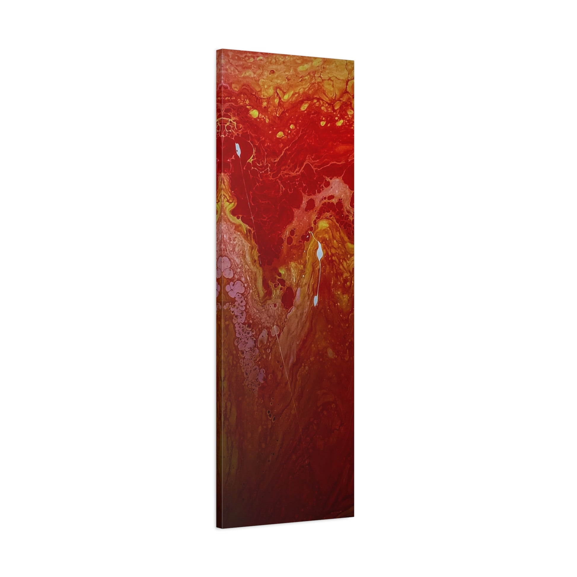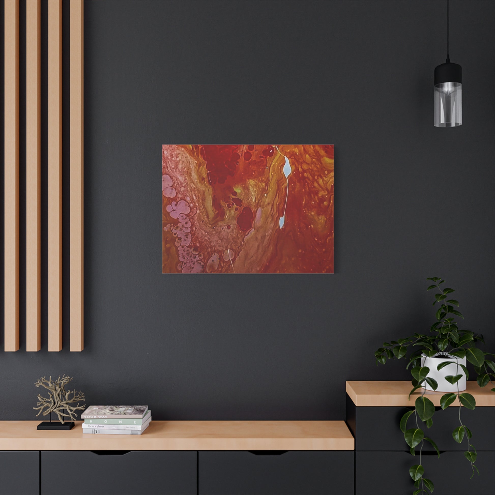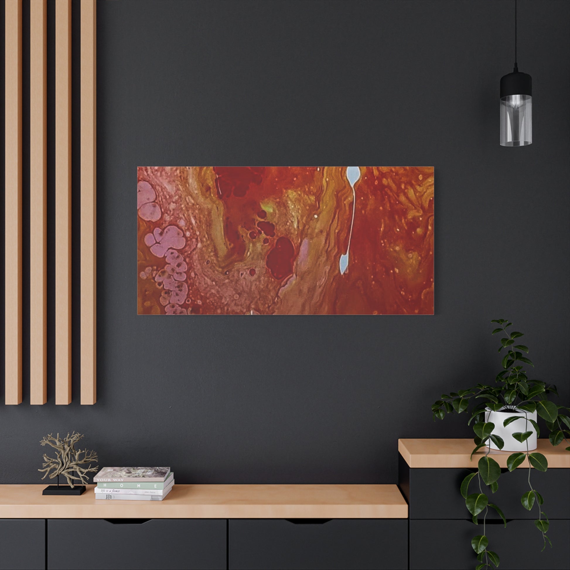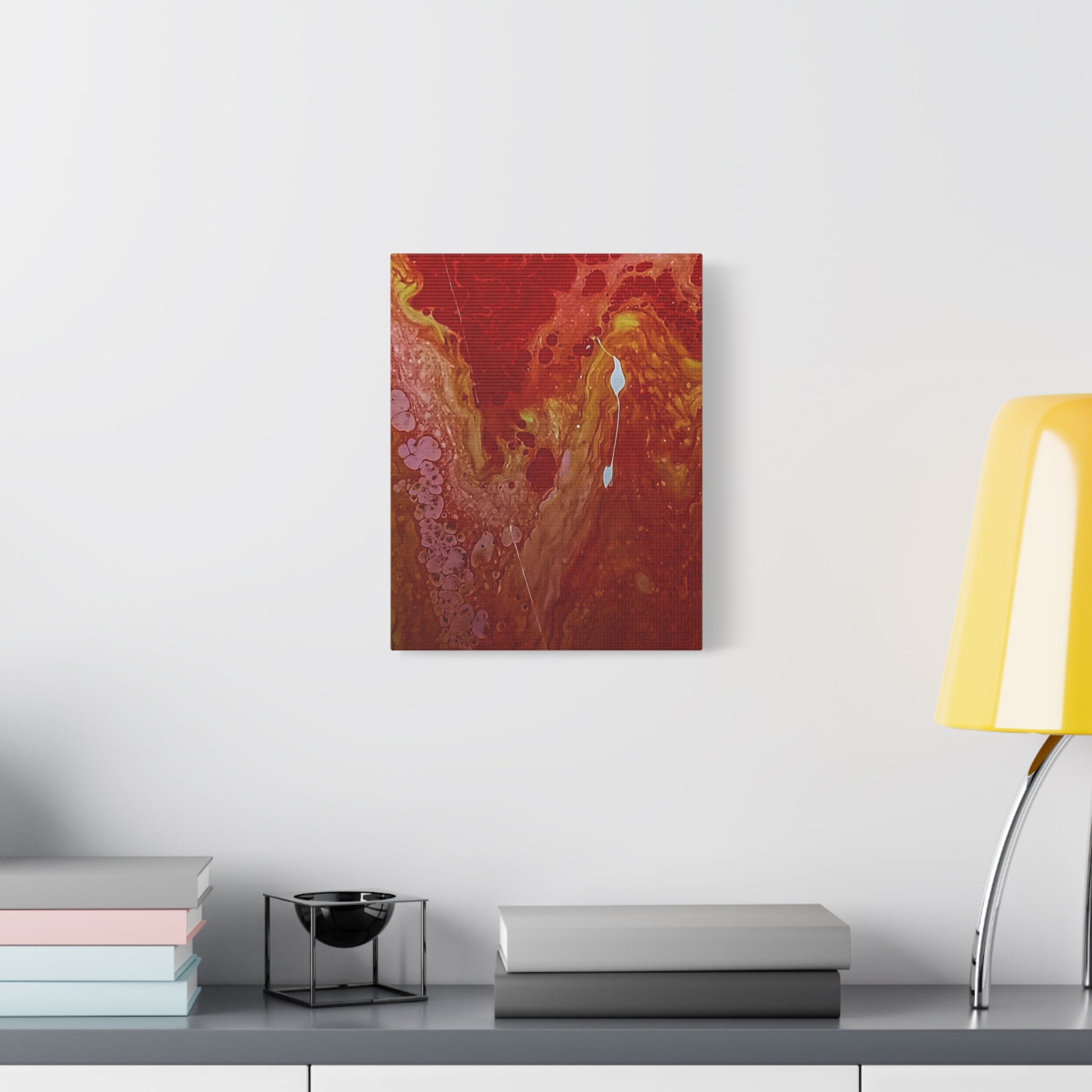 This stretched matte canvas brings a warm, tactile presence to any room. Deep reds, burnt oranges and subtle pinks flow together in an abstract, fluid composition that feels like liquid light frozen mid-motion. The 1.25" depth and hand-stretched pine frame give a gallery-ready silhouette that sits confidently on a wall without a separate frame. Hang it above a mantel, lean it on a shelf, or use it to anchor a cozy reading corner — it draws the eye and adds a layered, intimate atmosphere to spaces that value color, texture, and quiet drama.
