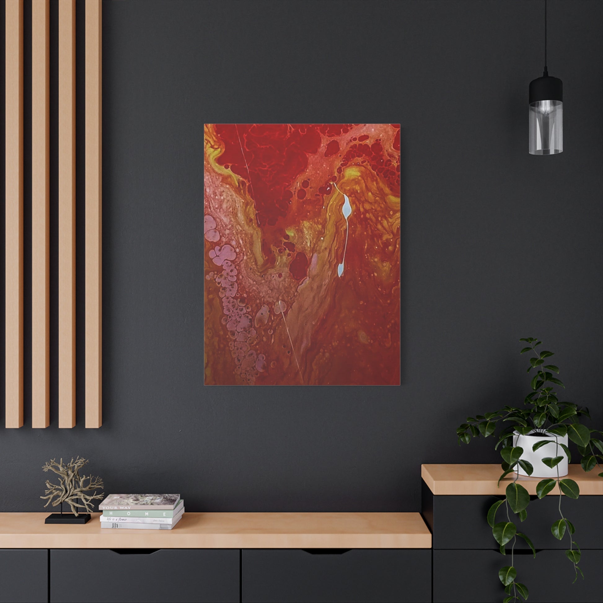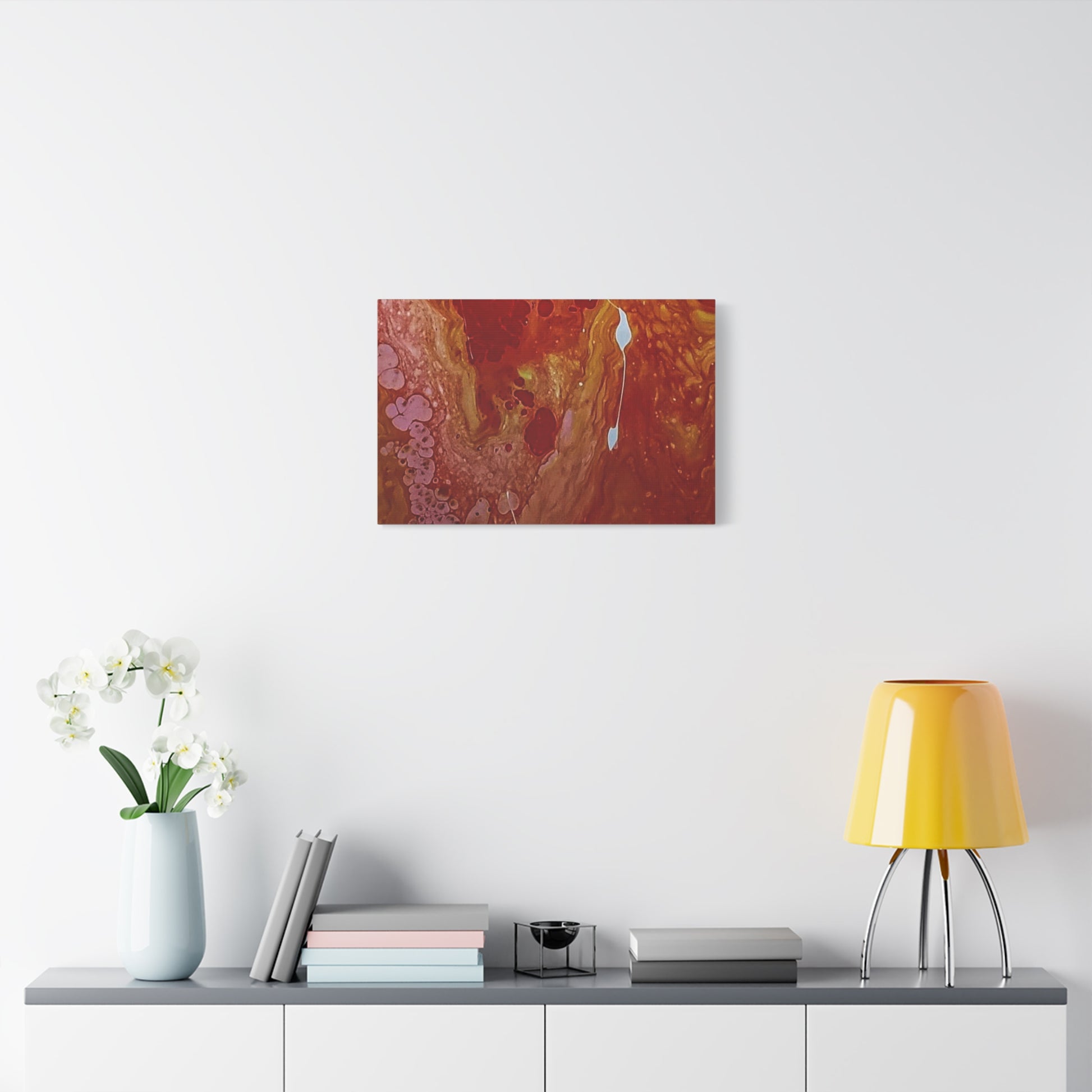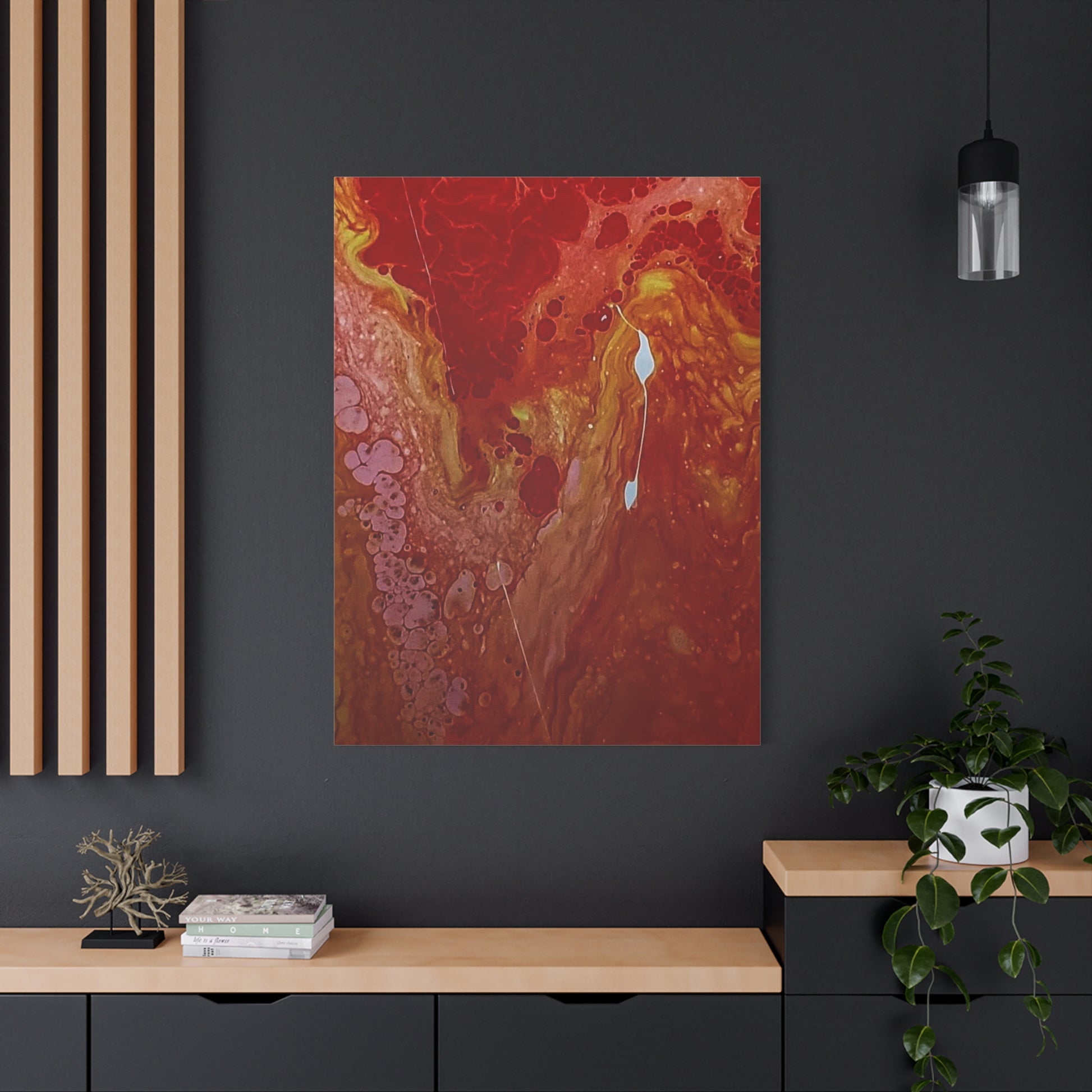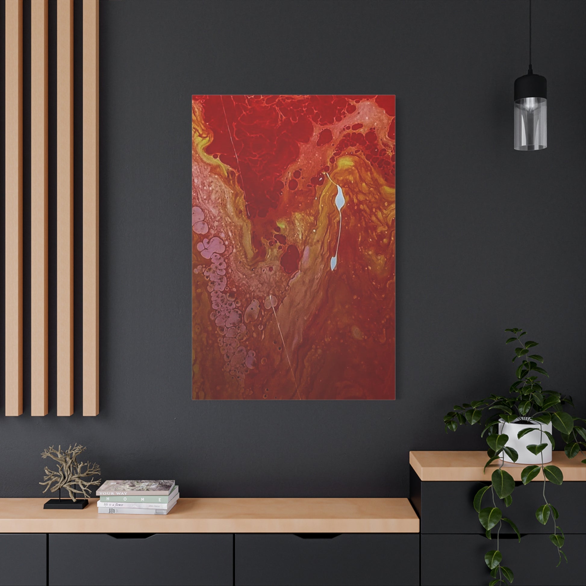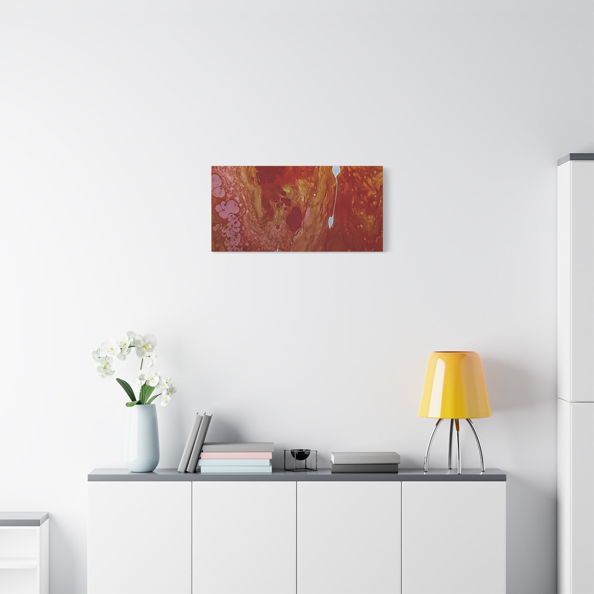 This stretched matte canvas brings a warm, tactile presence to any room. Deep reds, burnt oranges and subtle pinks flow together in an abstract, fluid composition that feels like liquid light frozen mid-motion. The 1.25" depth and hand-stretched pine frame give a gallery-ready silhouette that sits confidently on a wall without a separate frame. Hang it above a mantel, lean it on a shelf, or use it to anchor a cozy reading corner — it draws the eye and adds a layered, intimate atmosphere to spaces that value color, texture, and quiet drama.