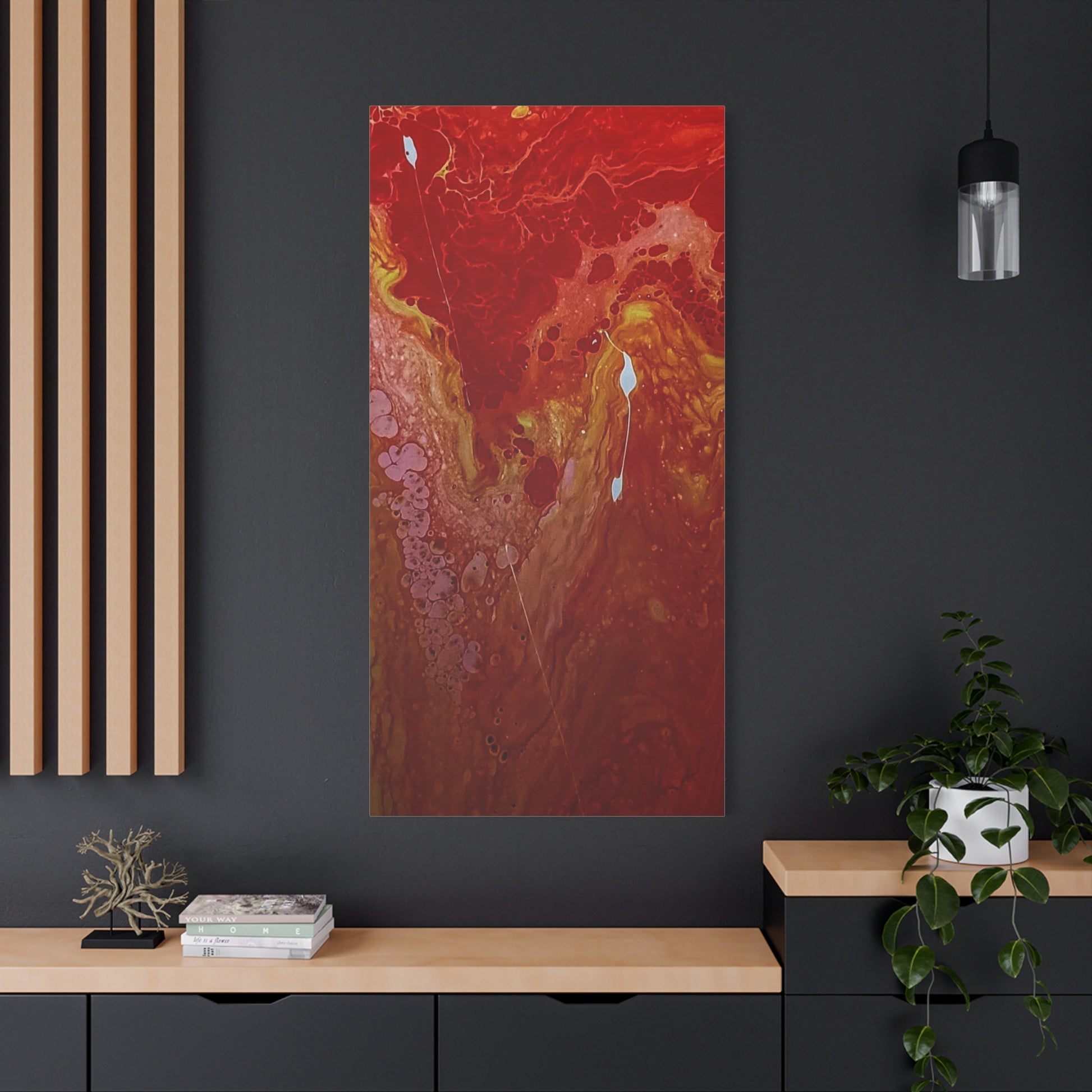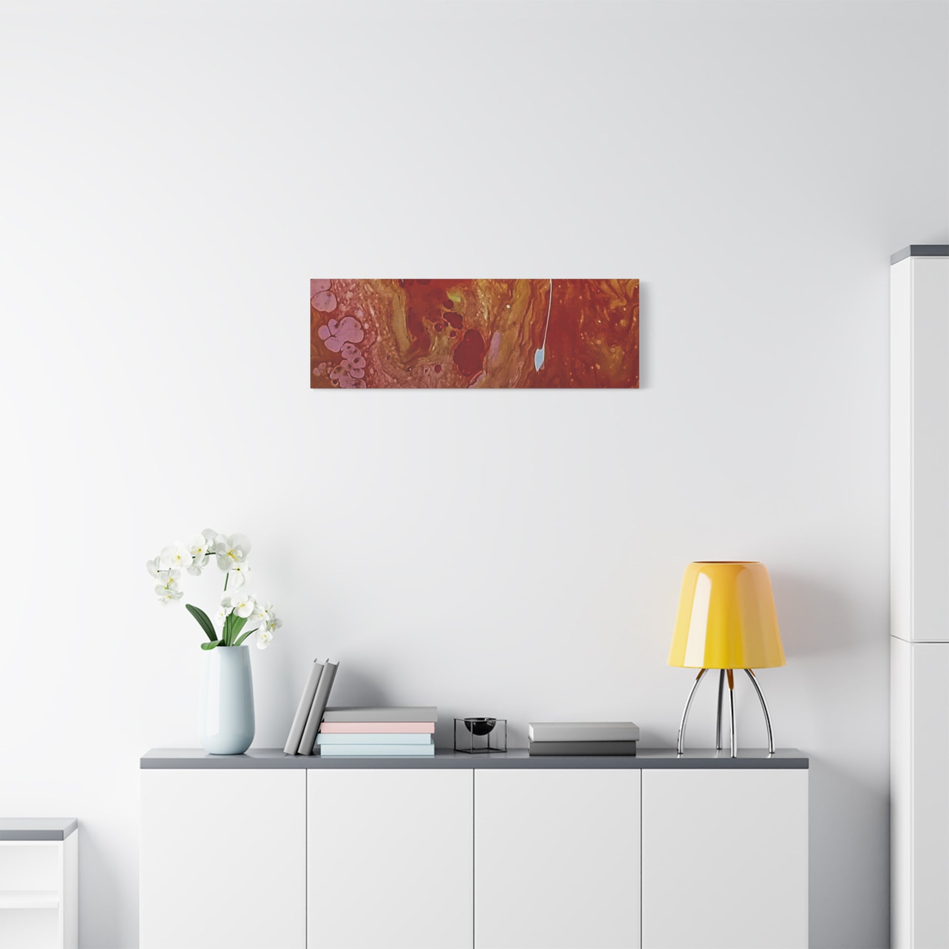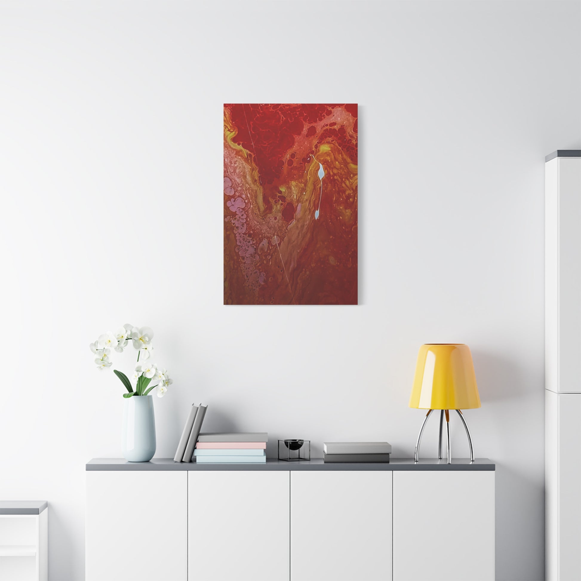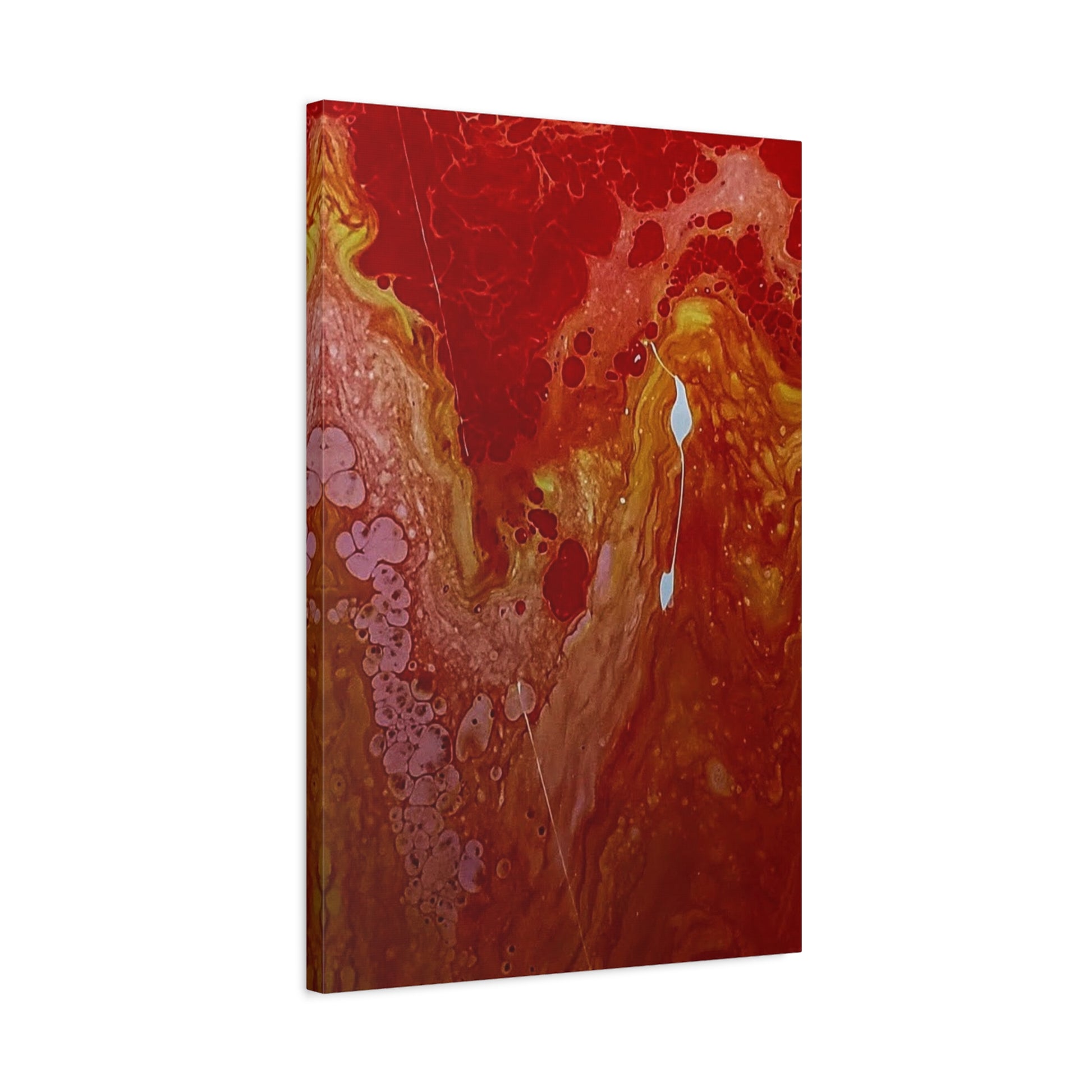 This stretched matte canvas brings a warm, tactile presence to any room. Deep reds, burnt oranges and subtle pinks flow together in an abstract, fluid composition that feels like liquid light frozen mid-motion. The 1.25" depth and hand-stretched pine frame give a gallery-ready silhouette that sits confidently on a wall without a separate frame. Hang it above a mantel, lean it on a shelf, or use it to anchor a cozy reading corner — it draws the eye and adds a layered, intimate atmosphere to spaces that value color, texture, and quiet drama.