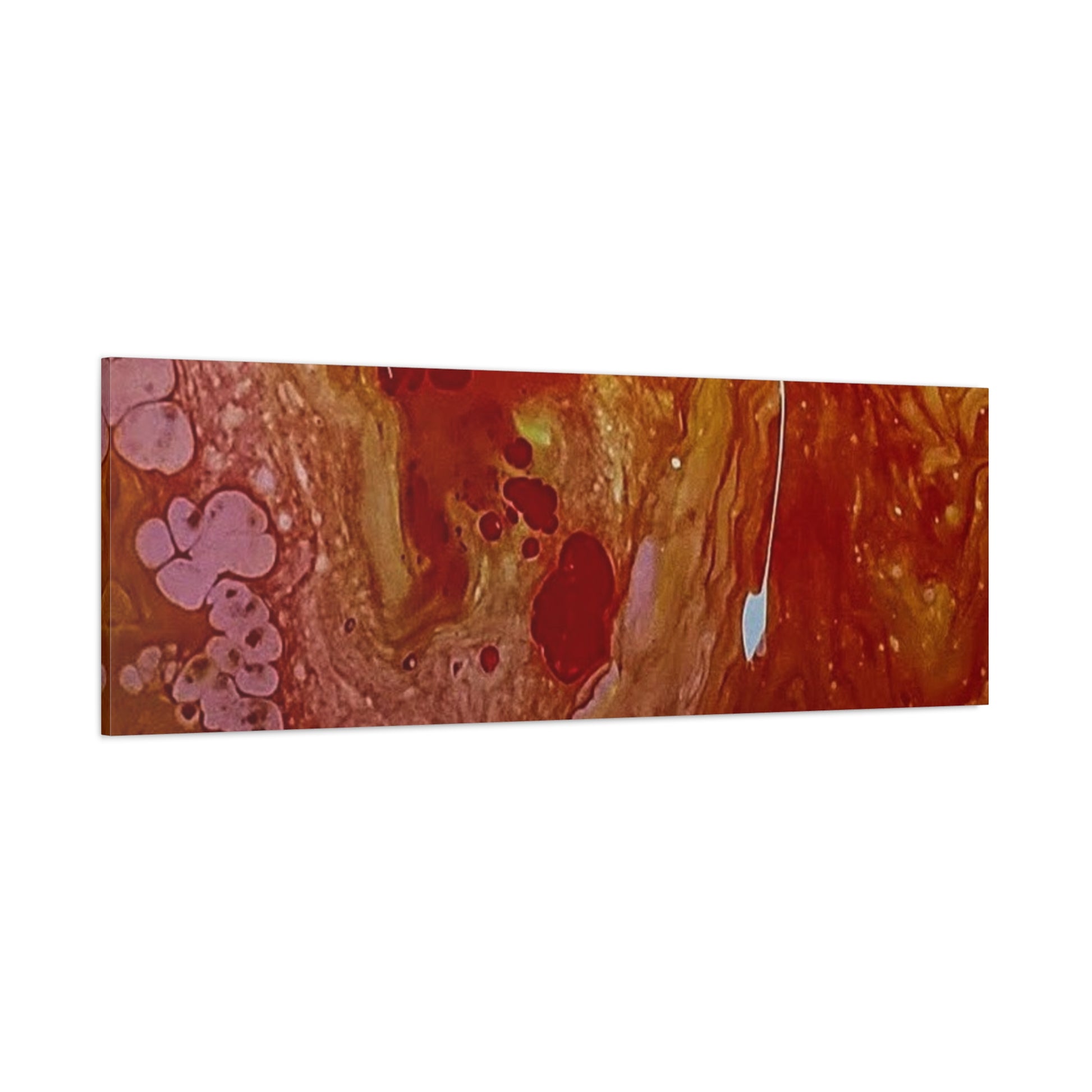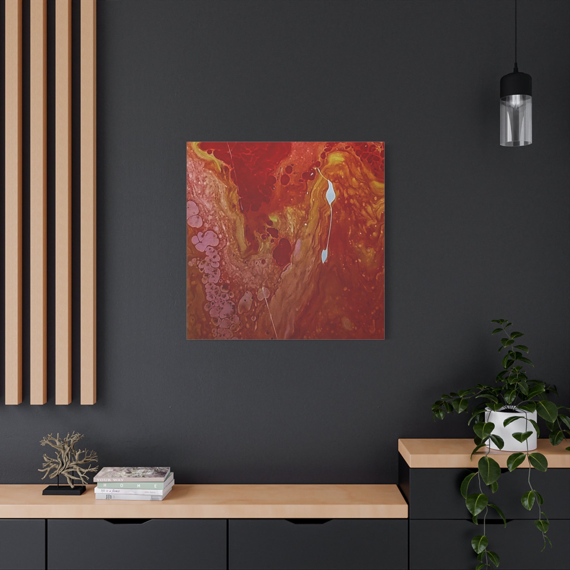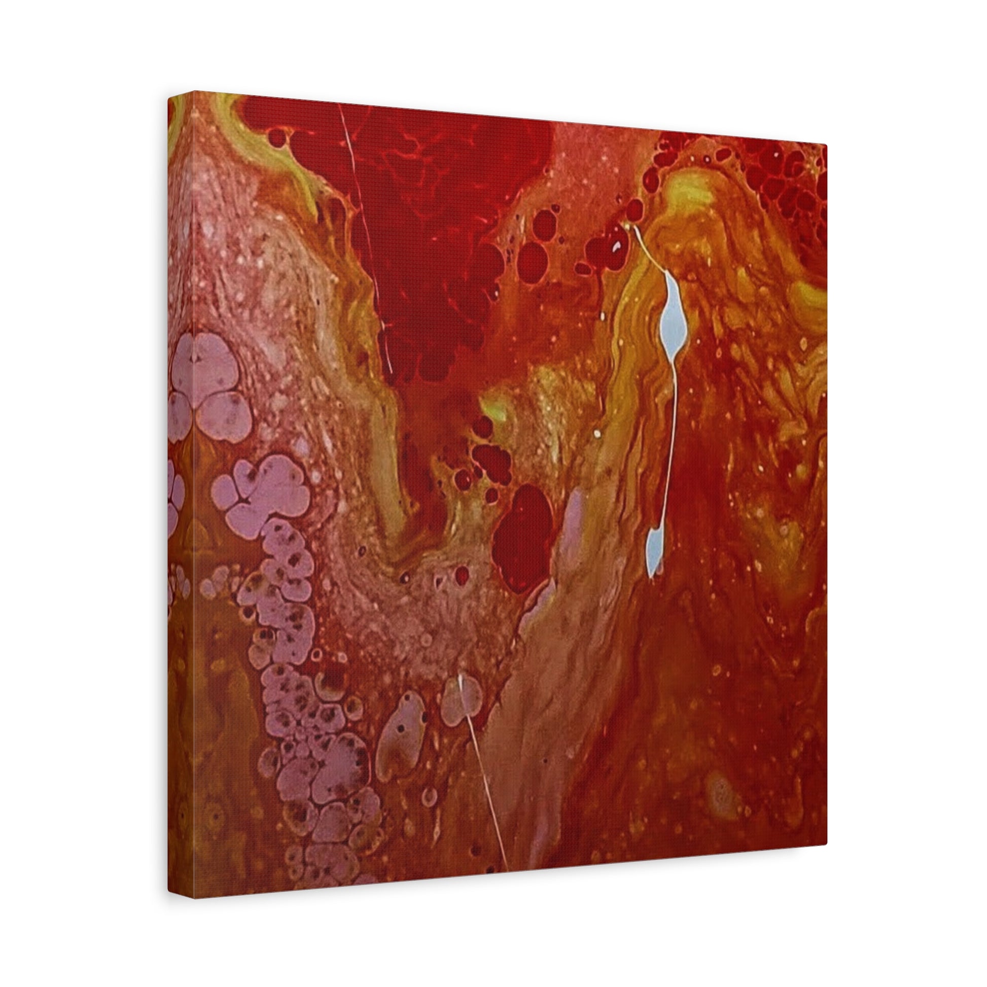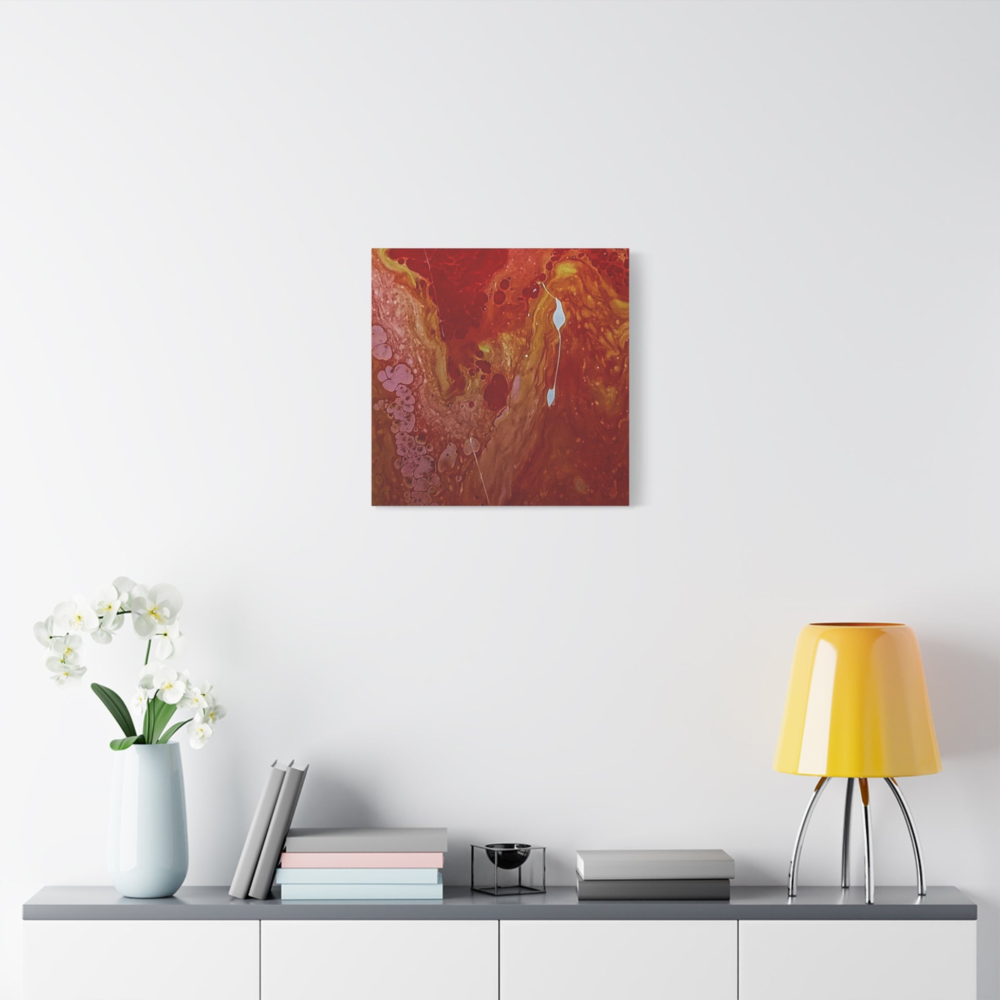 This stretched matte canvas brings a warm, tactile presence to any room. Deep reds, burnt oranges and subtle pinks flow together in an abstract, fluid composition that feels like liquid light frozen mid-motion. The 1.25" depth and hand-stretched pine frame give a gallery-ready silhouette that sits confidently on a wall without a separate frame. Hang it above a mantel, lean it on a shelf, or use it to anchor a cozy reading corner — it draws the eye and adds a layered, intimate atmosphere to spaces that value color, texture, and quiet drama.