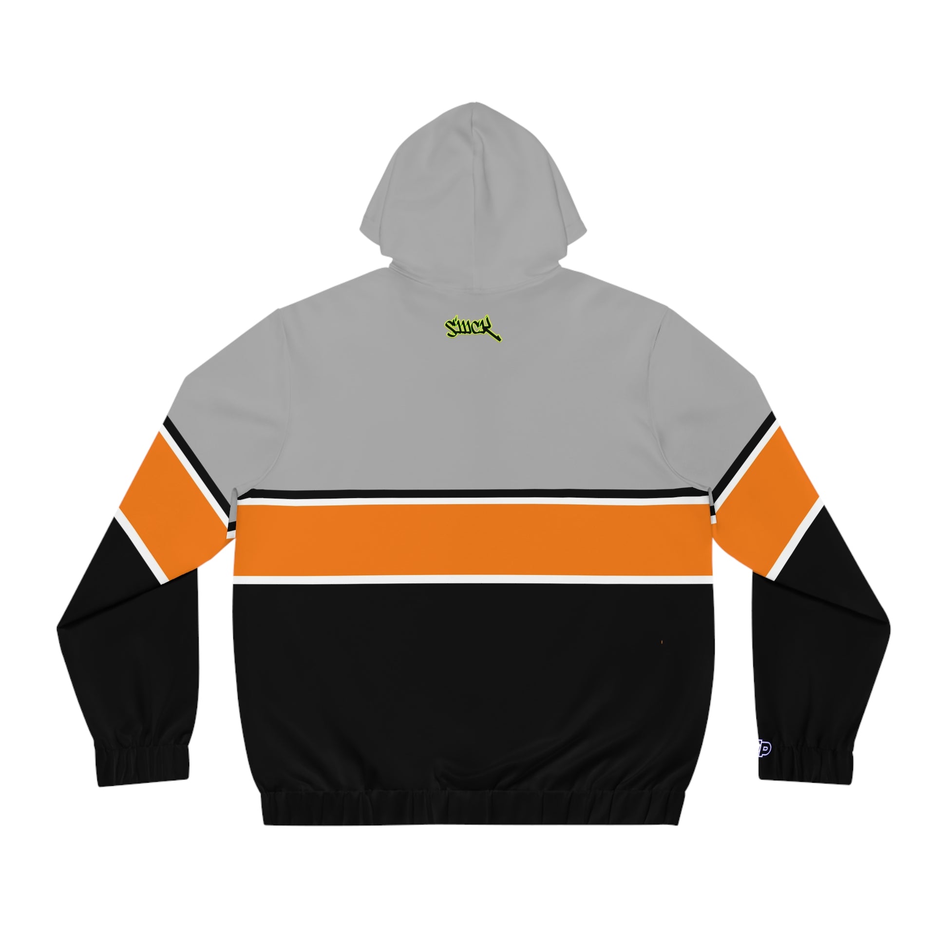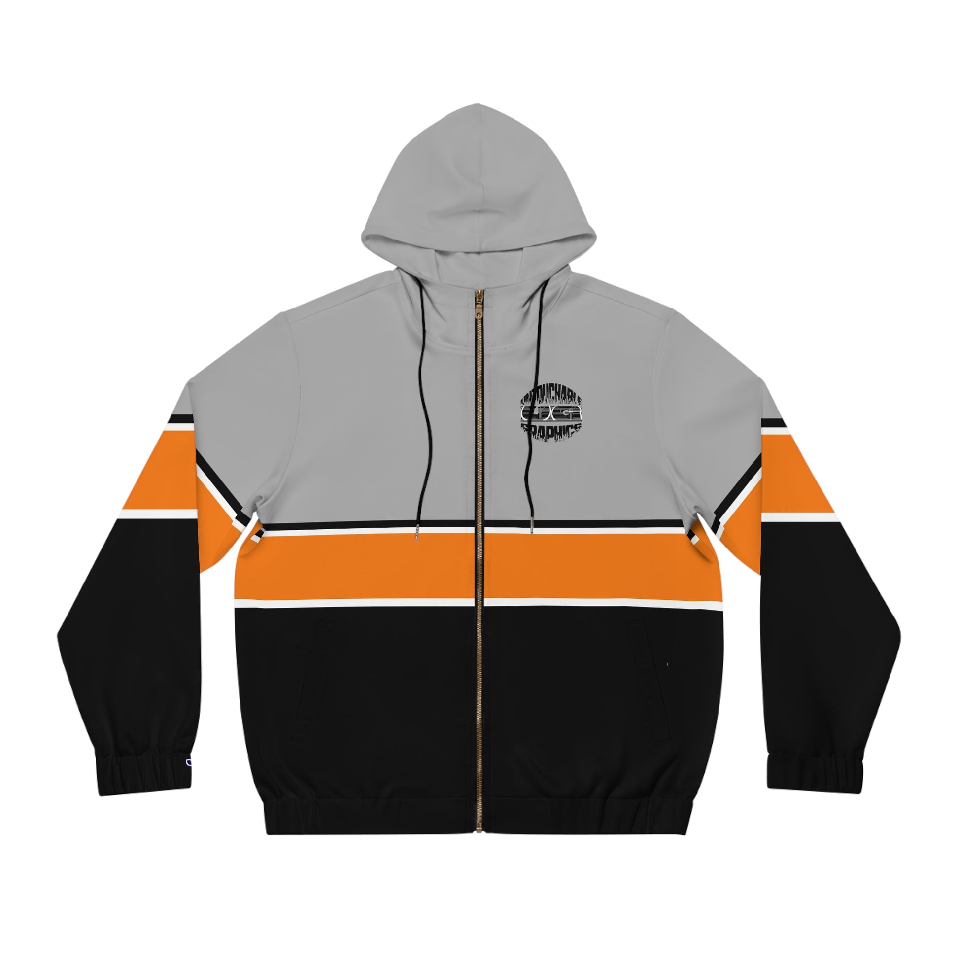 A lightweight, full-zip hoodie that feels like a chill evening on the porch after a long day. The color-blocked design—soft gray above, bold orange band across the chest, and deep black below—reads modern and low-key at the same time. Subtle details like the small leaf emblem on the chest and a neon logo on the upper back add personality without shouting. The gold-colored metal zipper and woven drawstrings give a slightly elevated look, while elastic cuffs and hem keep the silhouette tidy. Wear it zipped up between sets or layered over a tee for weekend runs, coffee runs, or cooler nights by the fire. It moves with you: stretchy knit, two angled pockets for hands or essentials, and reinforced neck and shoulder tape so it keeps its shape through many wears.