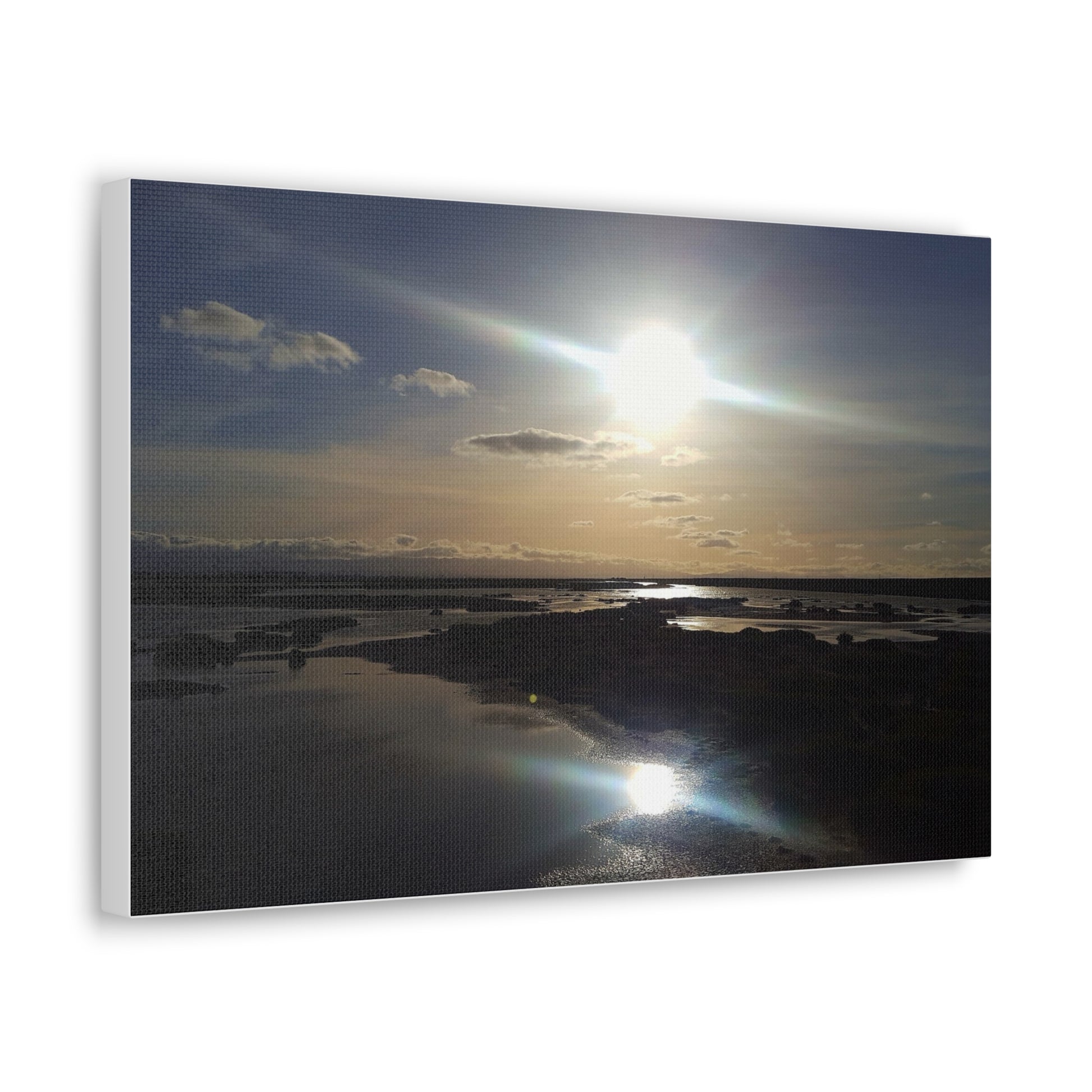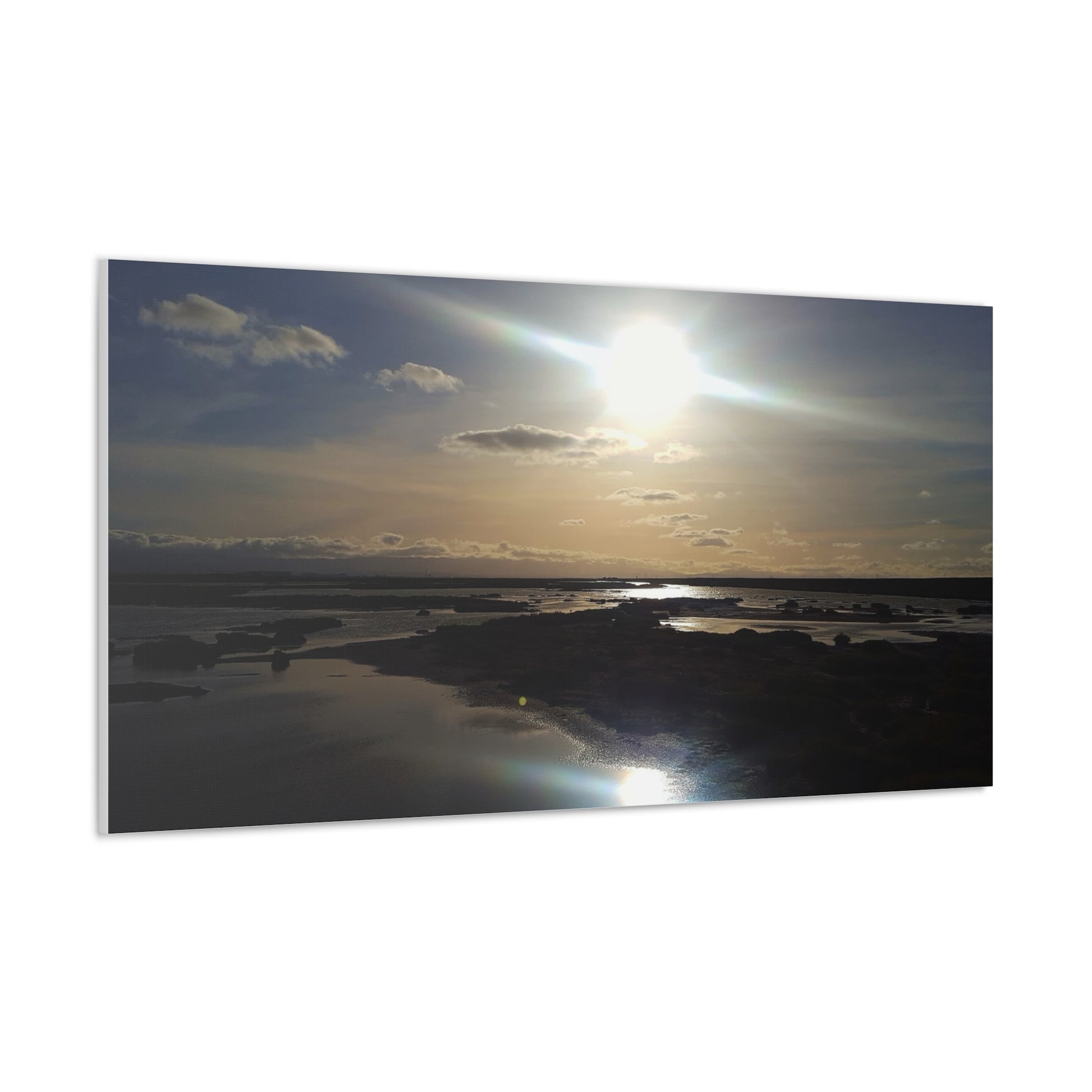 A calm coastal scene captured on semi-gloss satin canvas. The low sun scatters across tidal pools, throwing soft flares and reflective light that double the horizon. Printed on high-quality polycotton, the image keeps its deep shadows and warm highlights without losing fine detail. Mounted on a New Zealand pine frame, the piece arrives ready to hang with a simple self-assembly kit so you can bring a quiet, contemplative shoreline into a living room, hallway, or office. The wide-format print and vivid Epson-driven colors hold up in both horizontal and square compositions, making it a subtle focal point that invites pause and slow breaths.