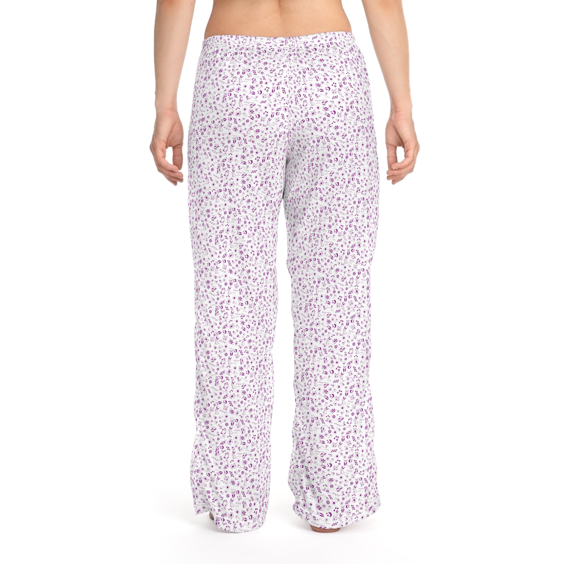 Lightweight pajama pants patterned with a soft, tiny floral print in lavender tones. These relaxed-fit lounge pants sit comfortably at the waist with a back elastic and flat black drawstring, delivering easy movement around the house or gentle rest at bedtime. The all-over print keeps the look cohesive and feminine while double-needle stitched seams add durability for many cozy evenings. Breathable polyester jersey maintains bright, crisp color and a silky handfeel that glides against the skin.