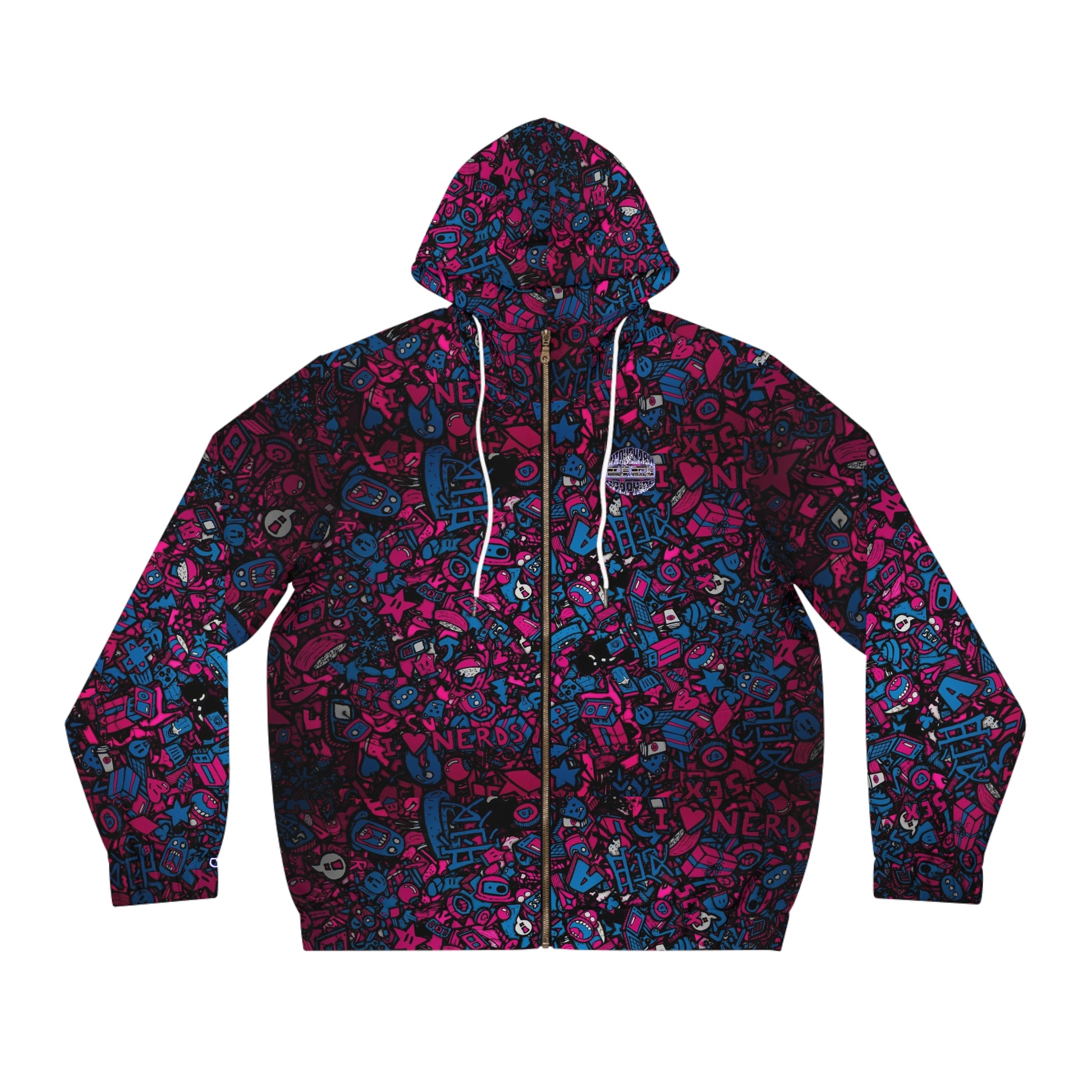 This full-zip hoodie brings bold, playful energy to everyday wear. A vibrant all-over pattern mixes neon pinks, blues, and deep purples into a densely packed doodle scene — little icons, characters, and hand-drawn lettering that read like a secret visual language. The gold-colored metal zipper and woven drawstring add tactile contrast, while the soft polyester-spandex knit keeps the fit light and flexible for movement. Wear it zipped up for a striking, layered look or open over a tee when you want the pattern to pop. It feels like slipping into a mobile mural: lively, confident, and a touch rebellious—made for people who want their clothes to start conversations and carry personality through the day.