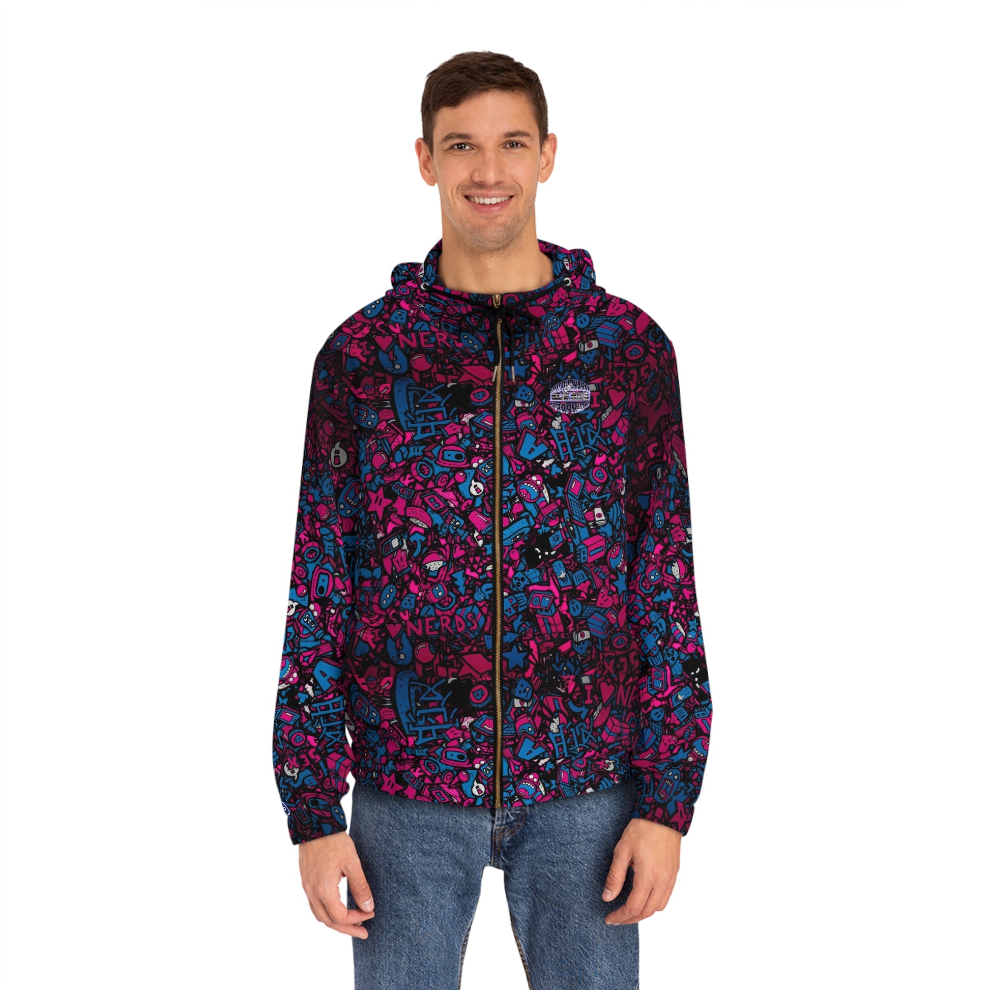 Men's Doodle Graphic Full‑Zip Hoodie — Neon Pink & Blue All‑Over Print
