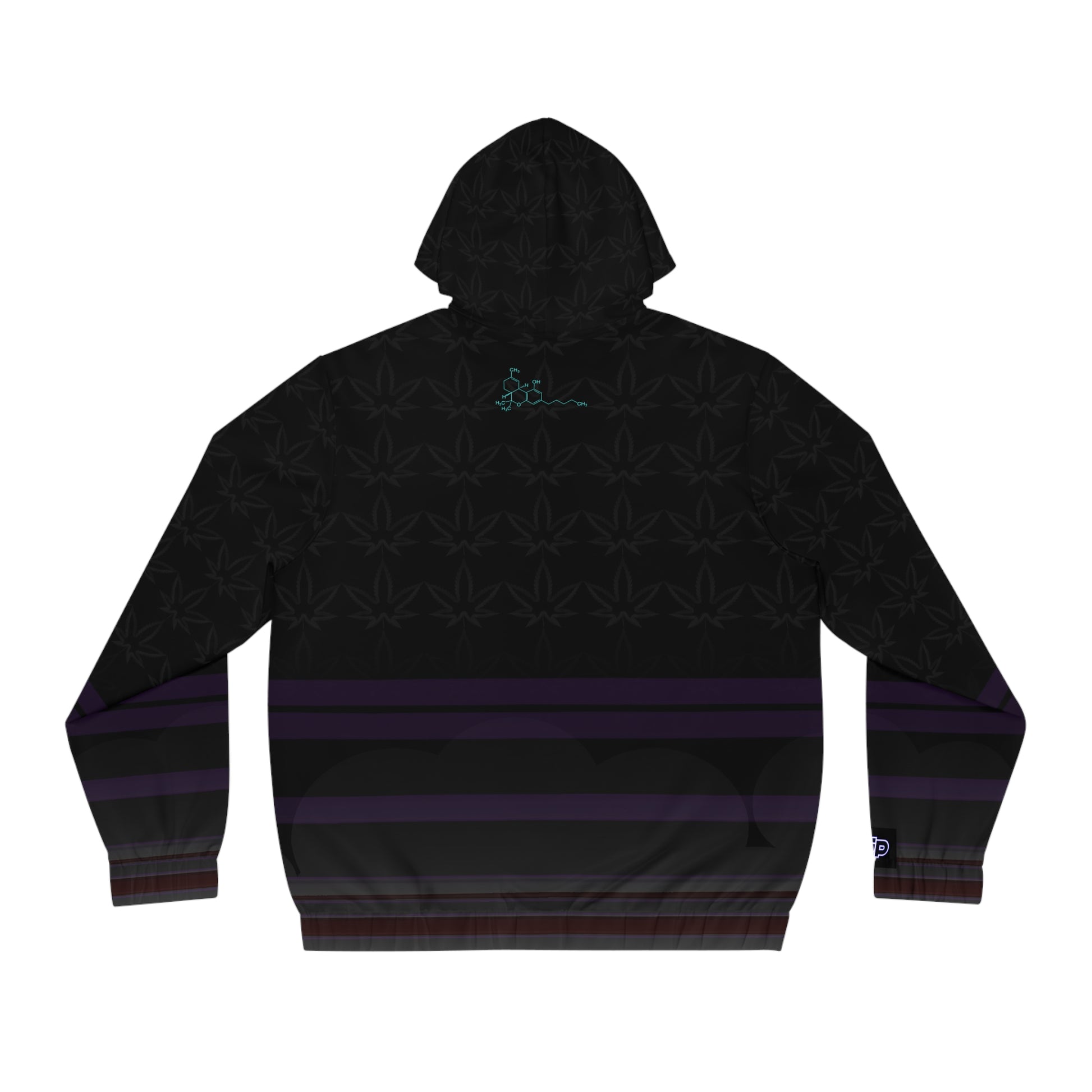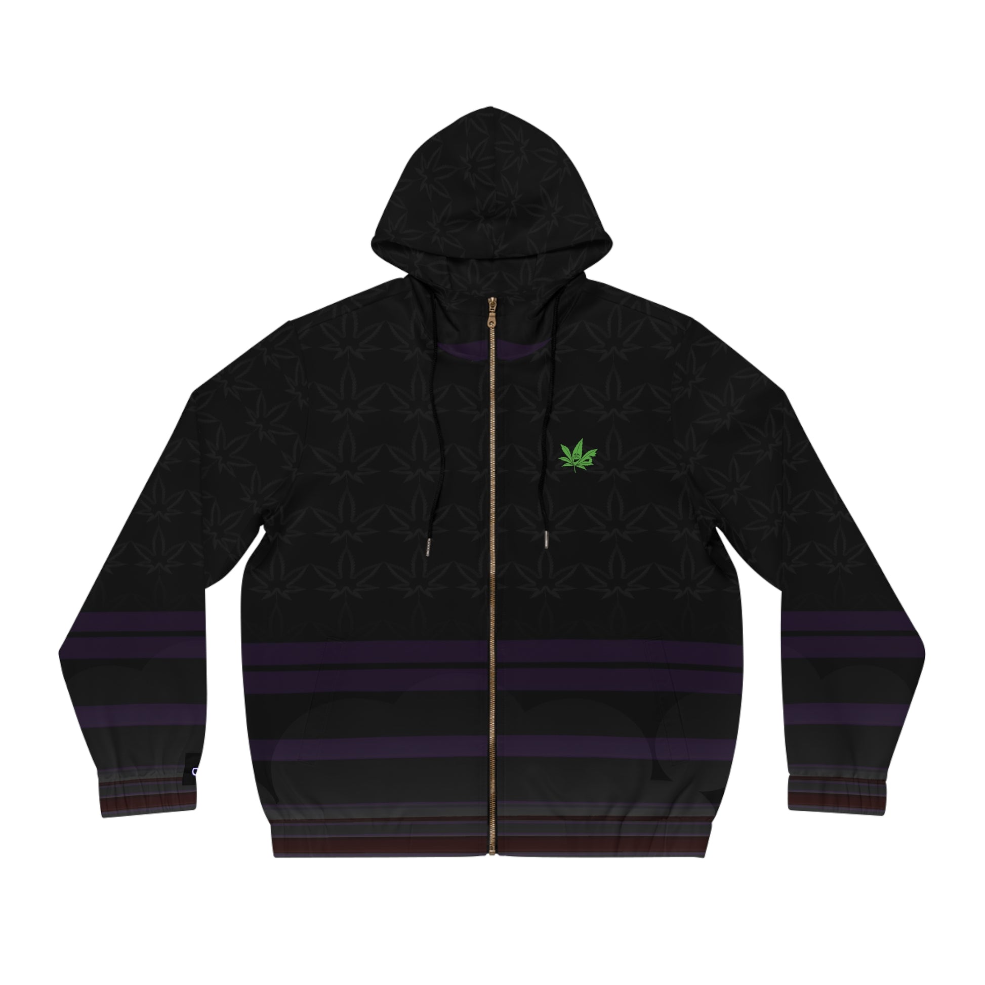 Men's Full-Zip Hoodie – Black Subtle Leaf Pattern with Purple Stripes & Green Emblem