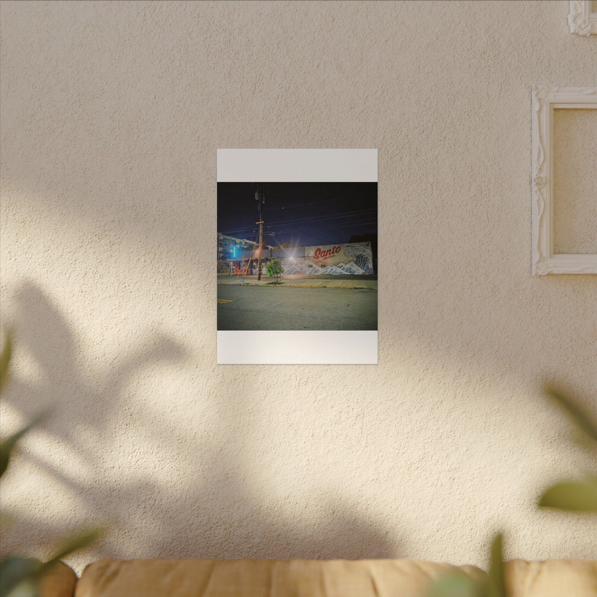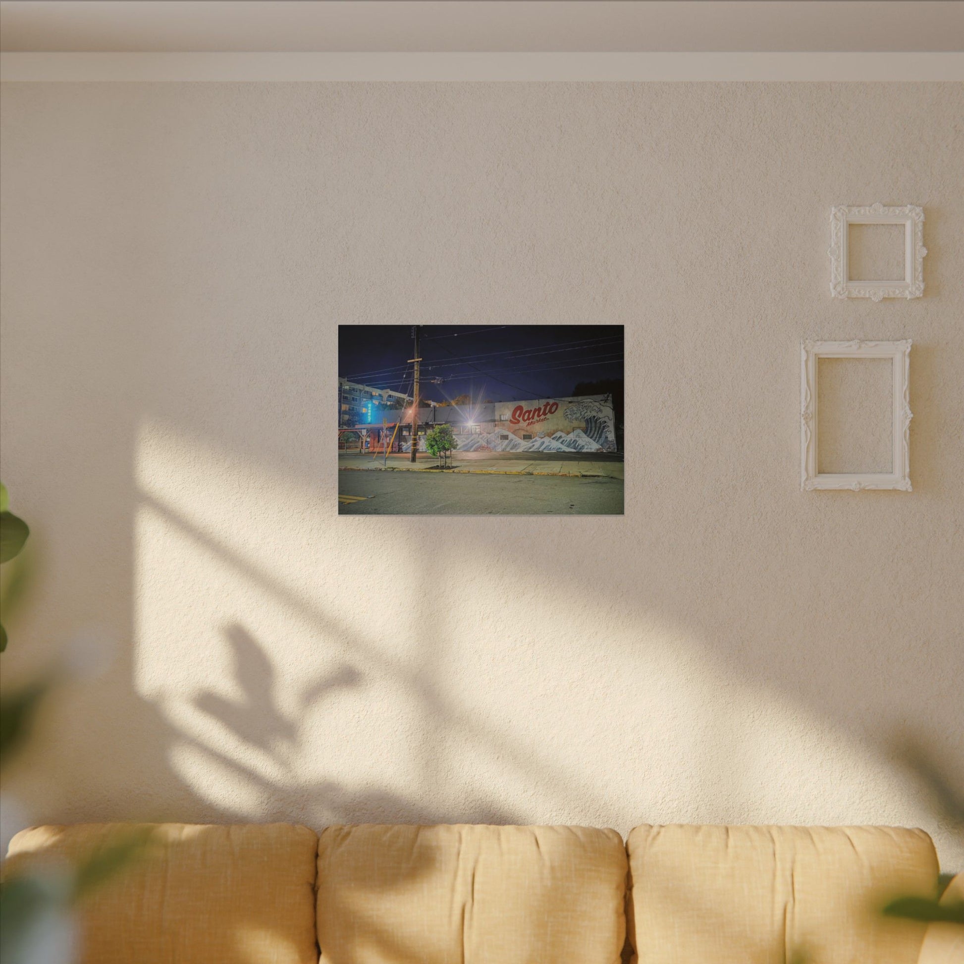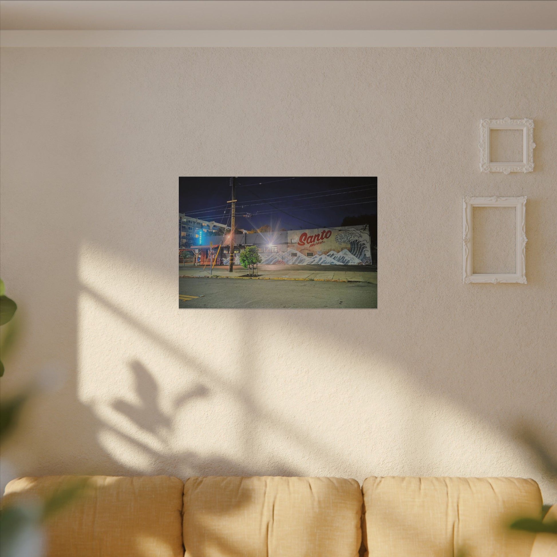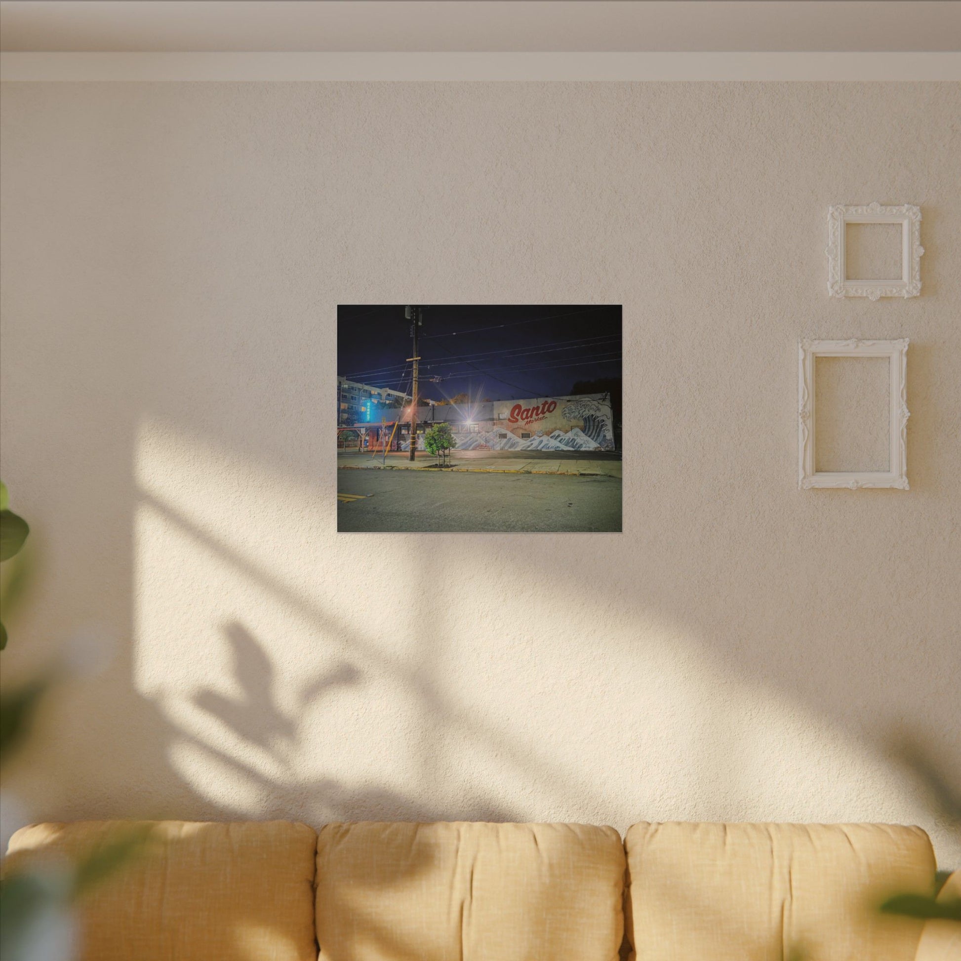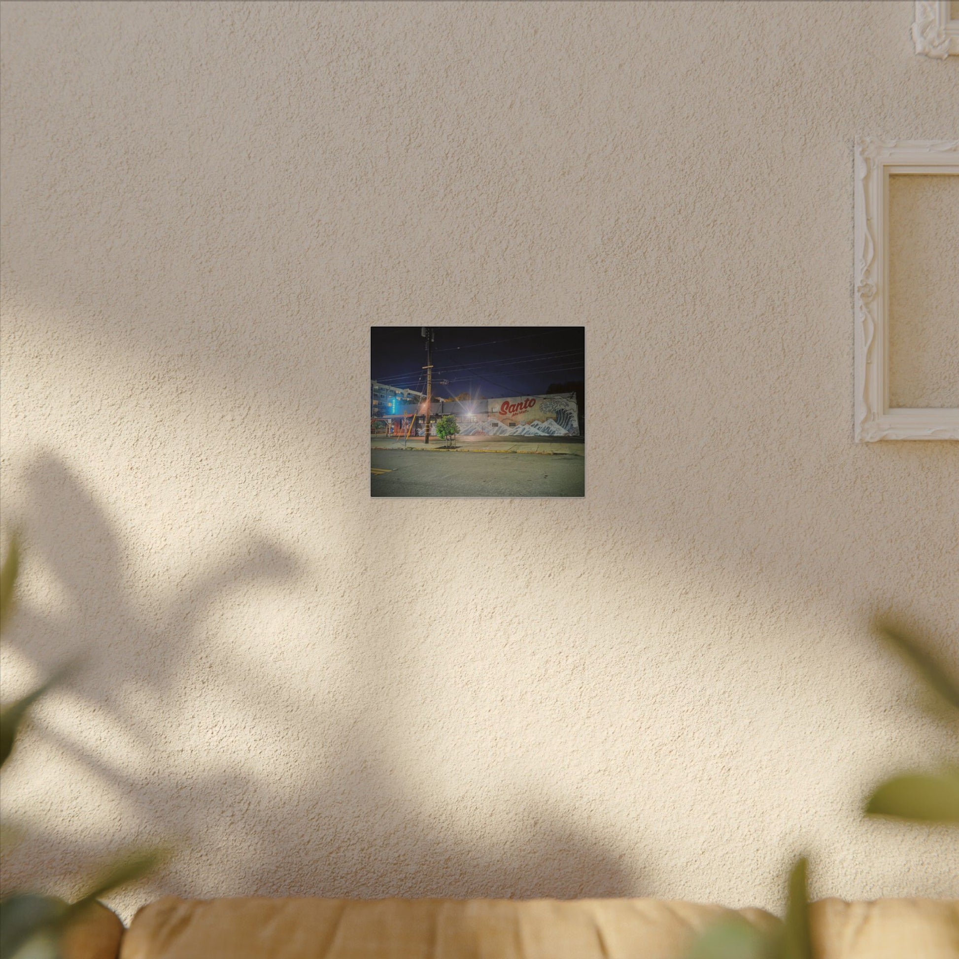 This stretched matte canvas brings a quiet-city-at-night mural into your space with rich, lasting color and a subtle textured finish. The photograph captures a nighttime street scene — neon glows, a mural reading “Santo,” and soft reflections across pavement — translated onto a high-quality cotton/poly canvas with a low-sheen matte coating. It hangs flush and steady on the wall, the slim 0.75" profile keeping the image front-and-center without bulk. Use it to ground a living room wall, add character to a studio, or create a moody focal point in an office. Each print is produced with eco-conscious materials and inks, so it looks vibrant while keeping sustainability in mind.