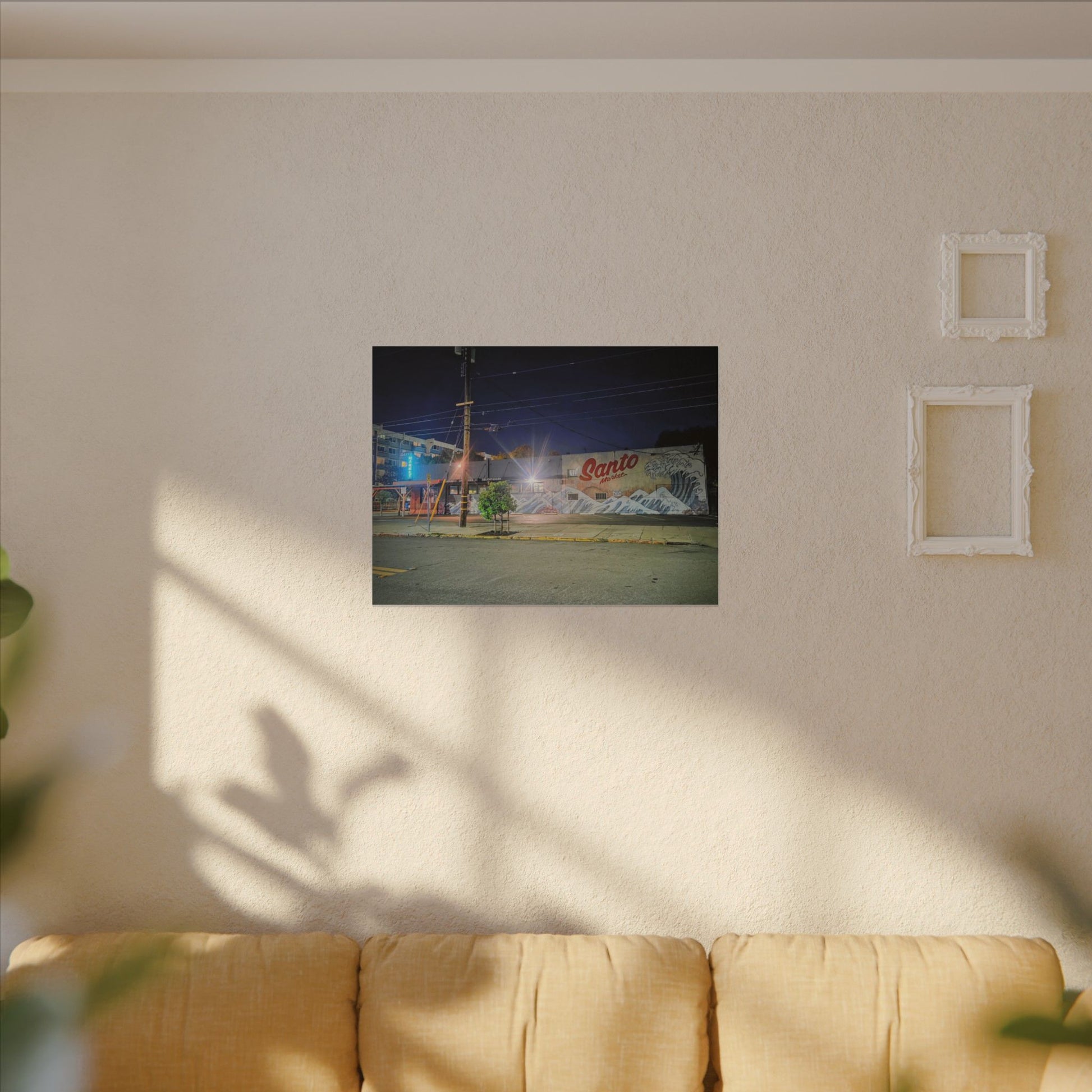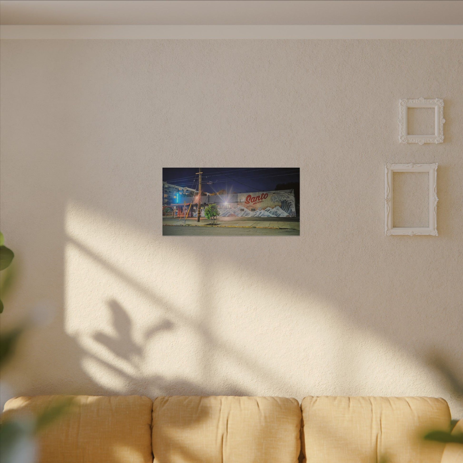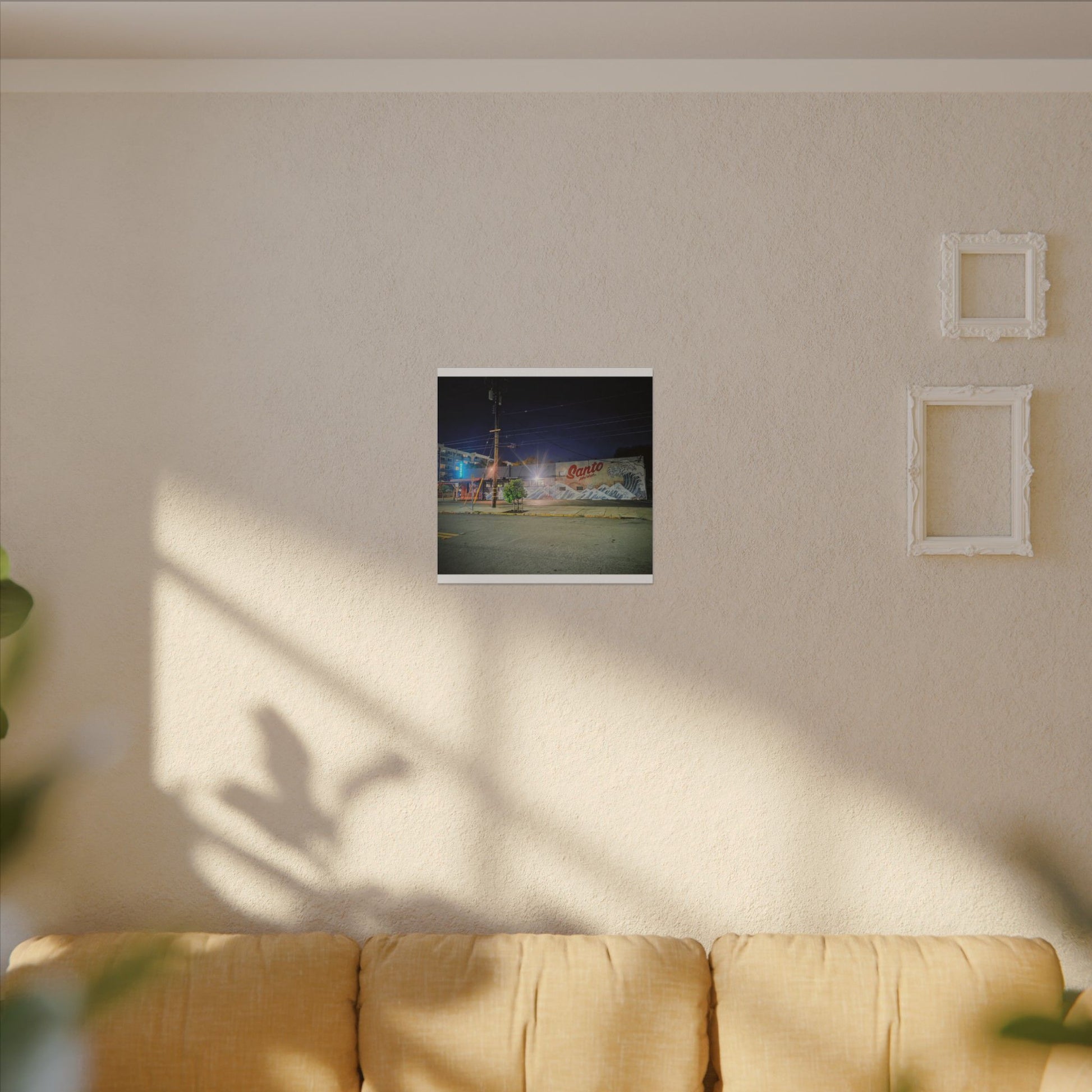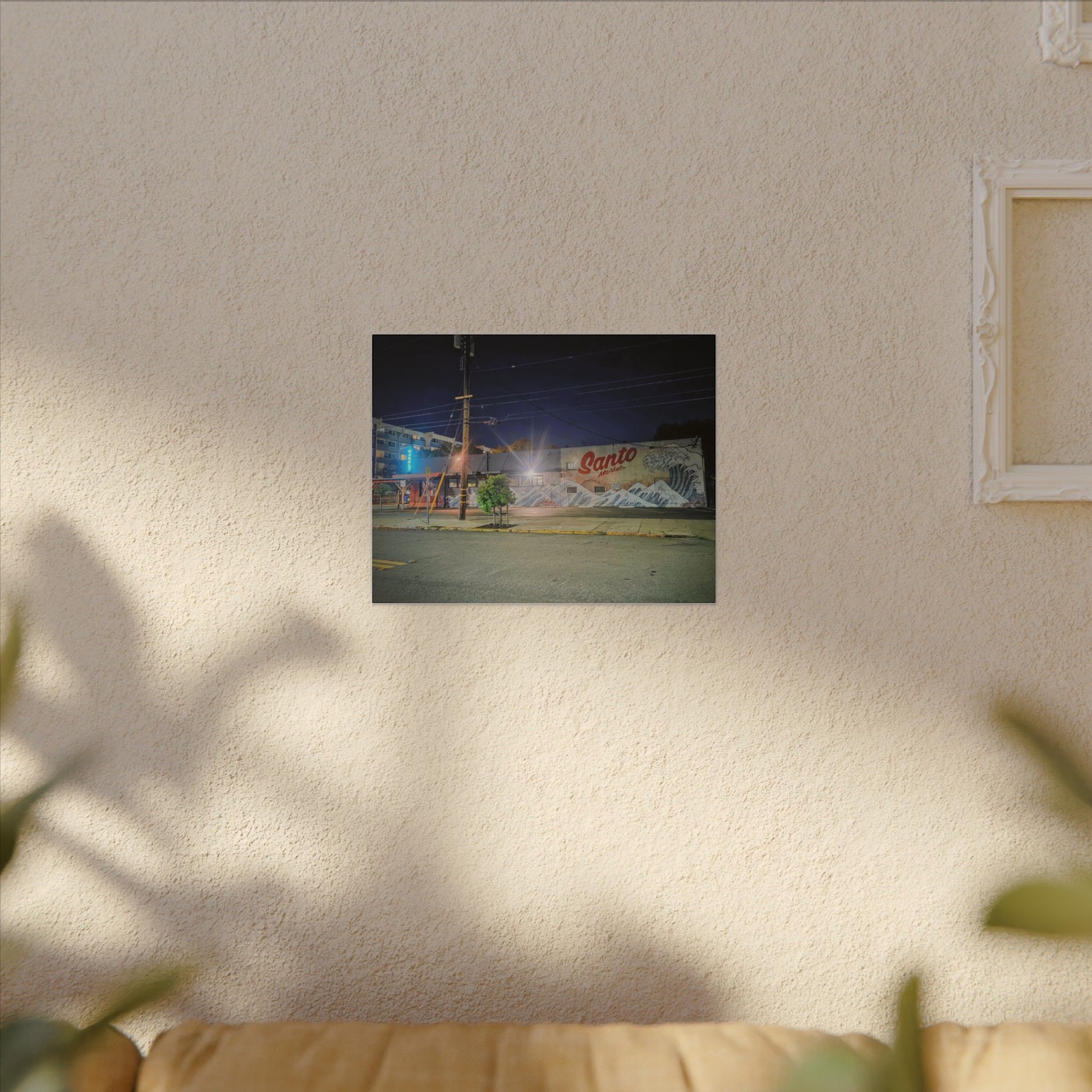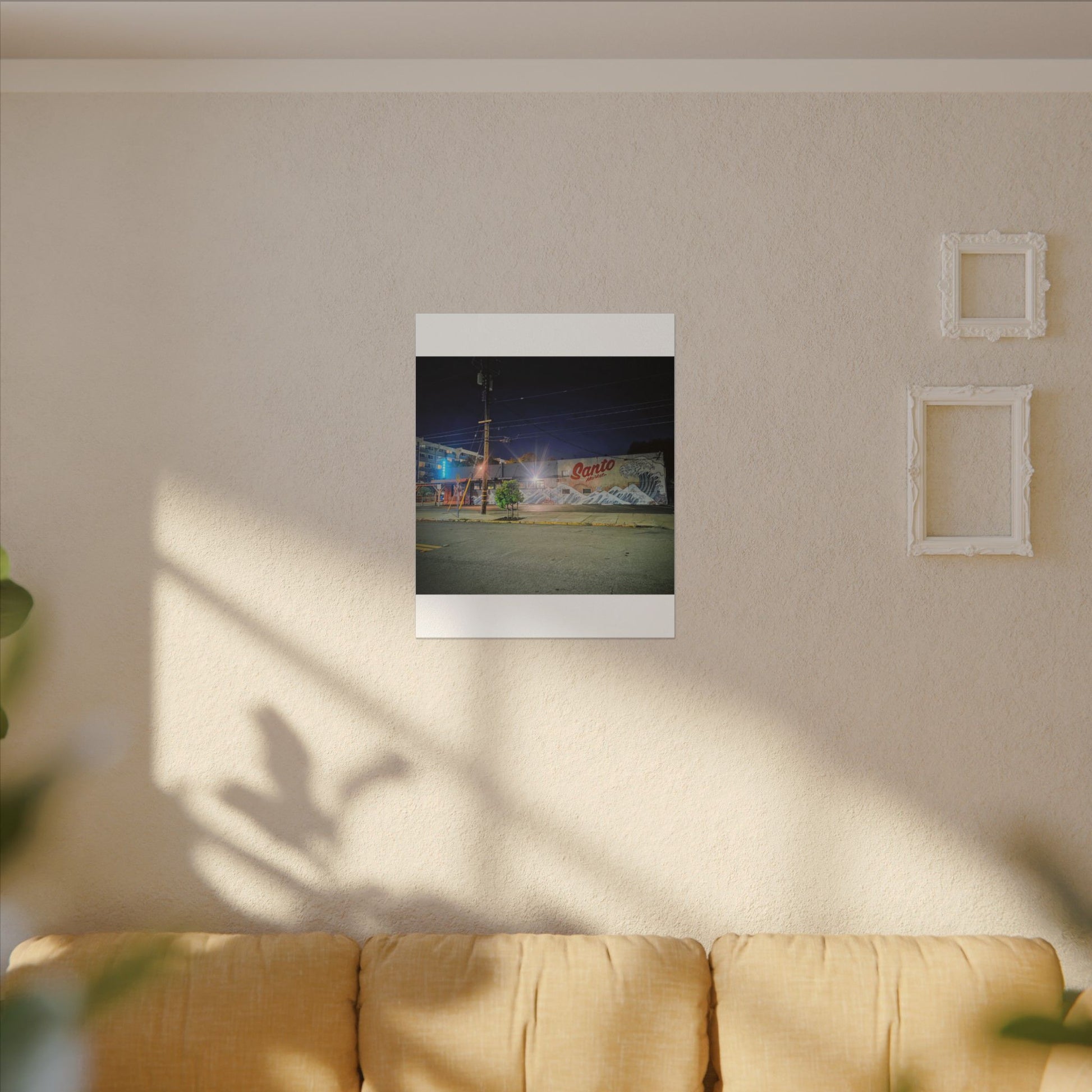 This stretched matte canvas brings a quiet-city-at-night mural into your space with rich, lasting color and a subtle textured finish. The photograph captures a nighttime street scene — neon glows, a mural reading “Santo,” and soft reflections across pavement — translated onto a high-quality cotton/poly canvas with a low-sheen matte coating. It hangs flush and steady on the wall, the slim 0.75" profile keeping the image front-and-center without bulk. Use it to ground a living room wall, add character to a studio, or create a moody focal point in an office. Each print is produced with eco-conscious materials and inks, so it looks vibrant while keeping sustainability in mind.
