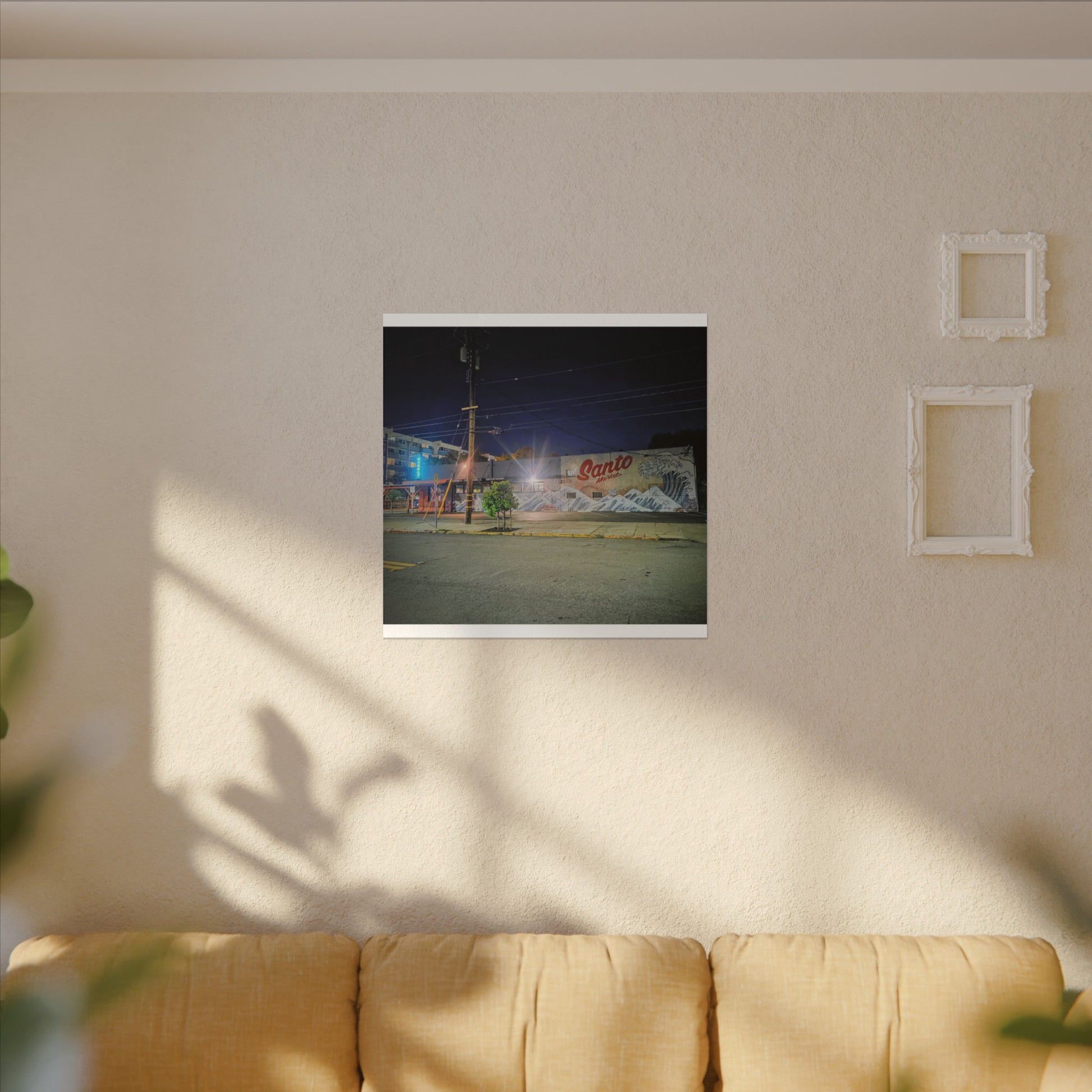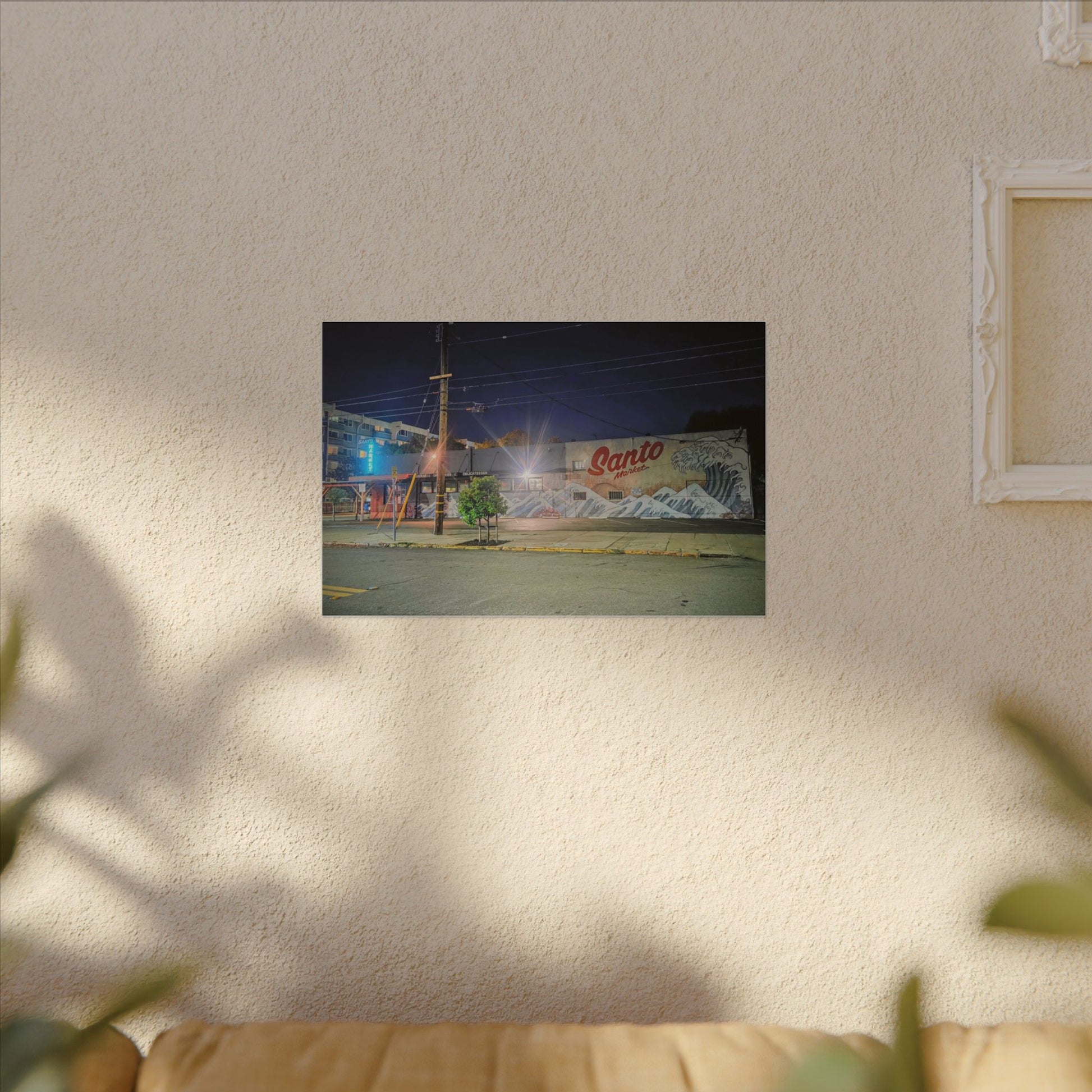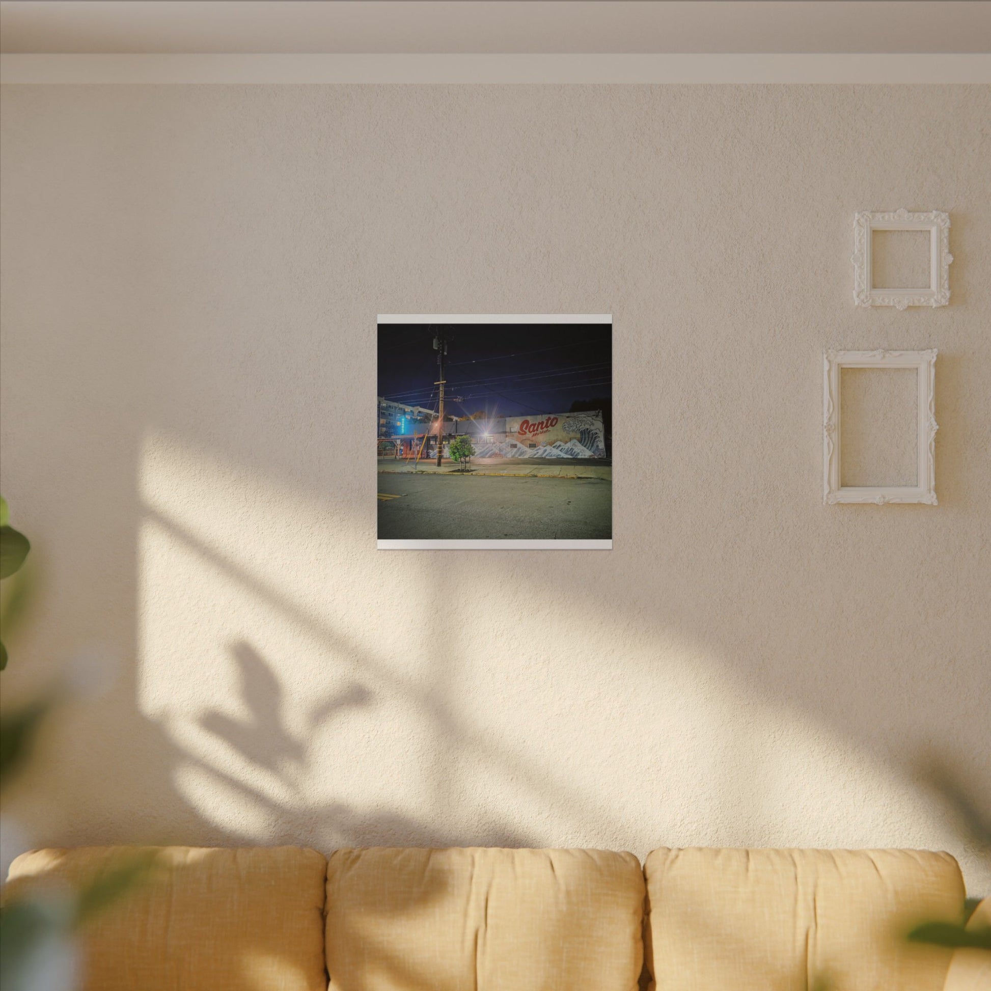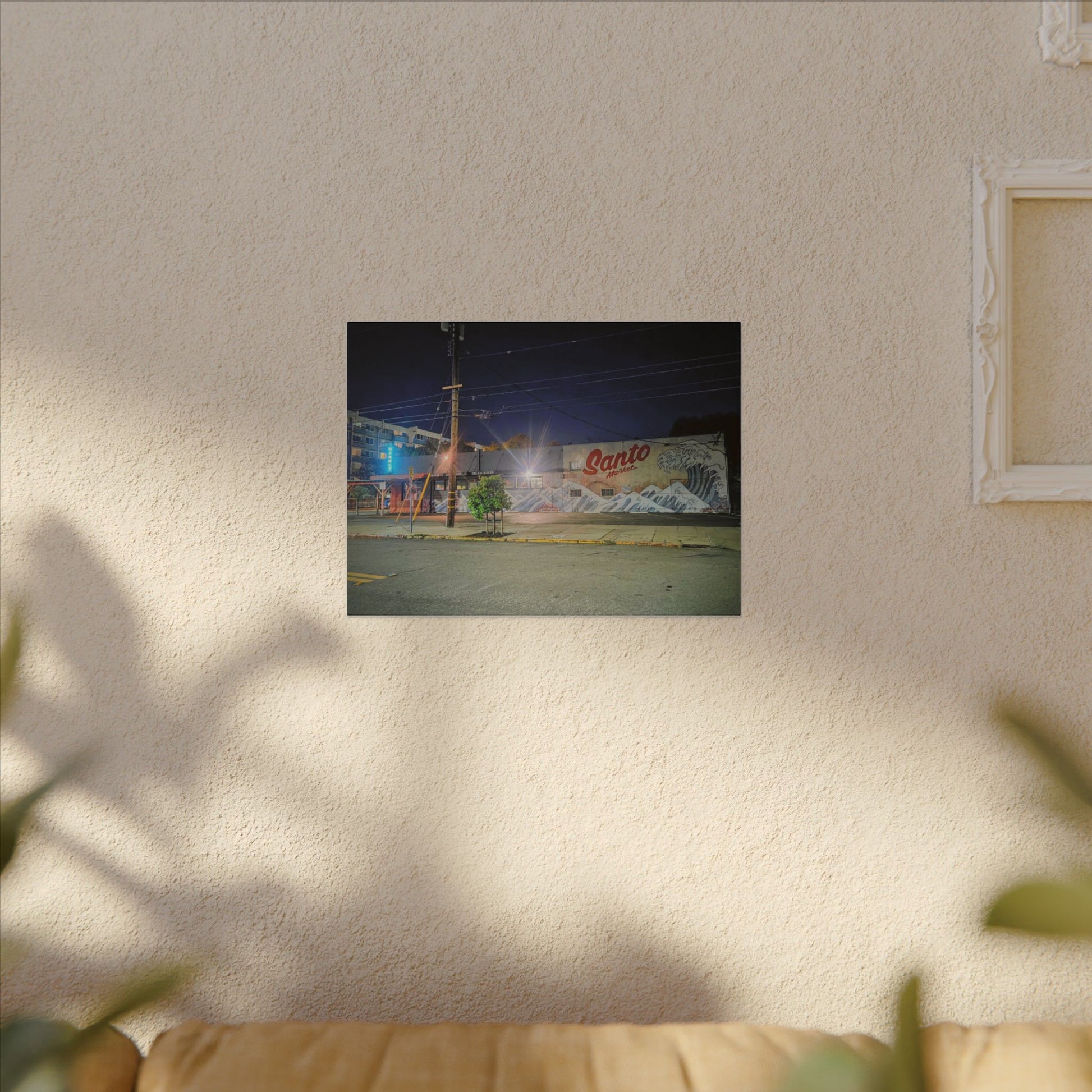 This stretched matte canvas brings a quiet-city-at-night mural into your space with rich, lasting color and a subtle textured finish. The photograph captures a nighttime street scene — neon glows, a mural reading “Santo,” and soft reflections across pavement — translated onto a high-quality cotton/poly canvas with a low-sheen matte coating. It hangs flush and steady on the wall, the slim 0.75" profile keeping the image front-and-center without bulk. Use it to ground a living room wall, add character to a studio, or create a moody focal point in an office. Each print is produced with eco-conscious materials and inks, so it looks vibrant while keeping sustainability in mind.