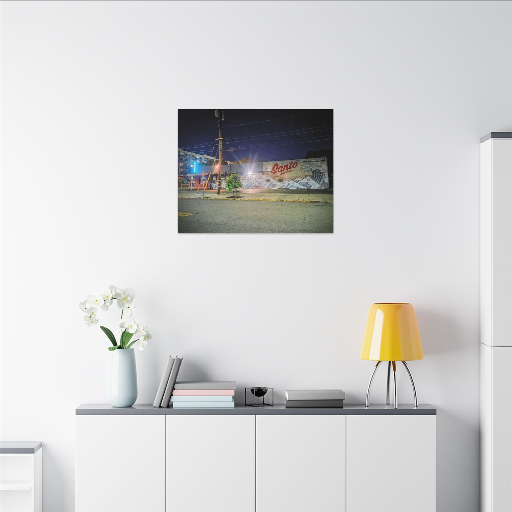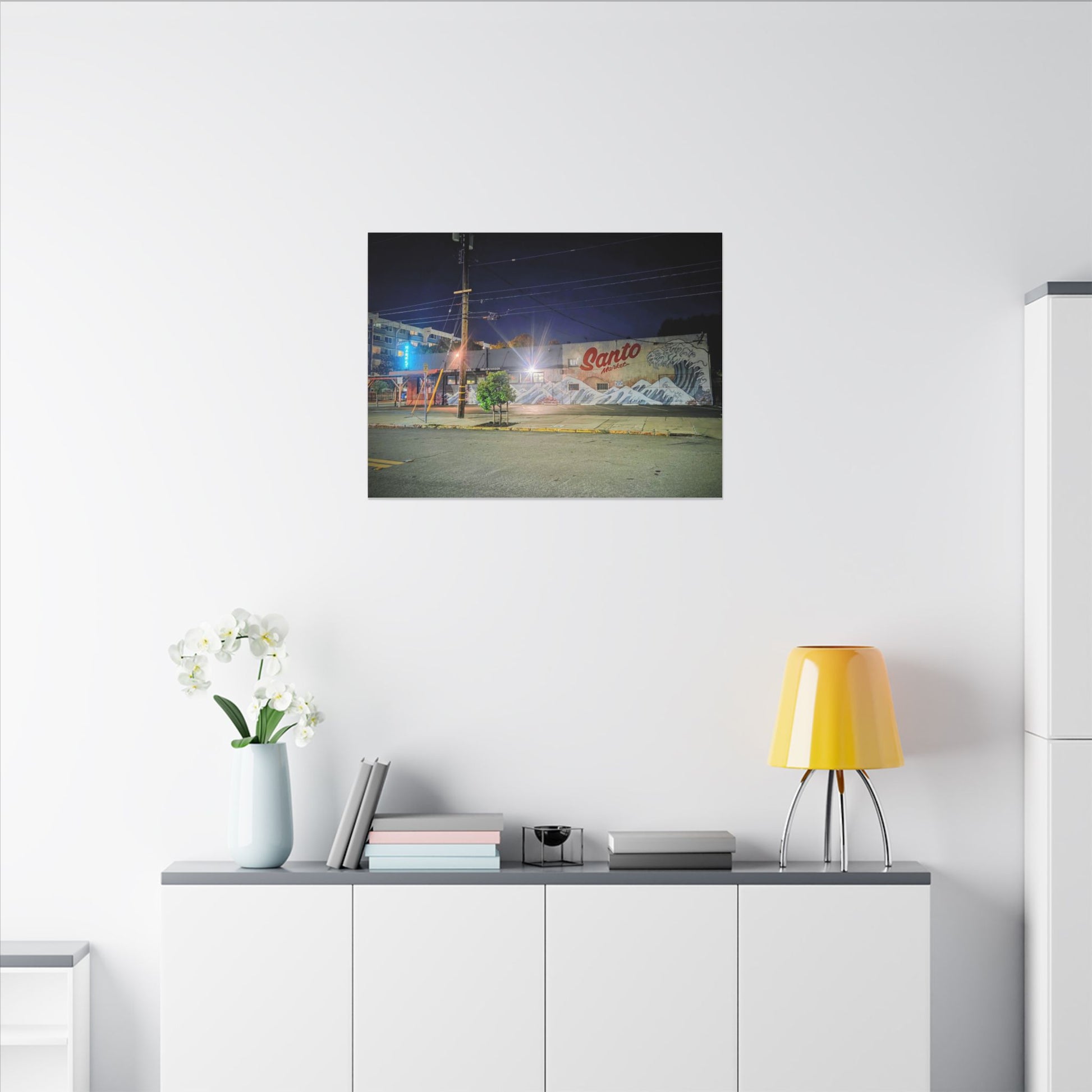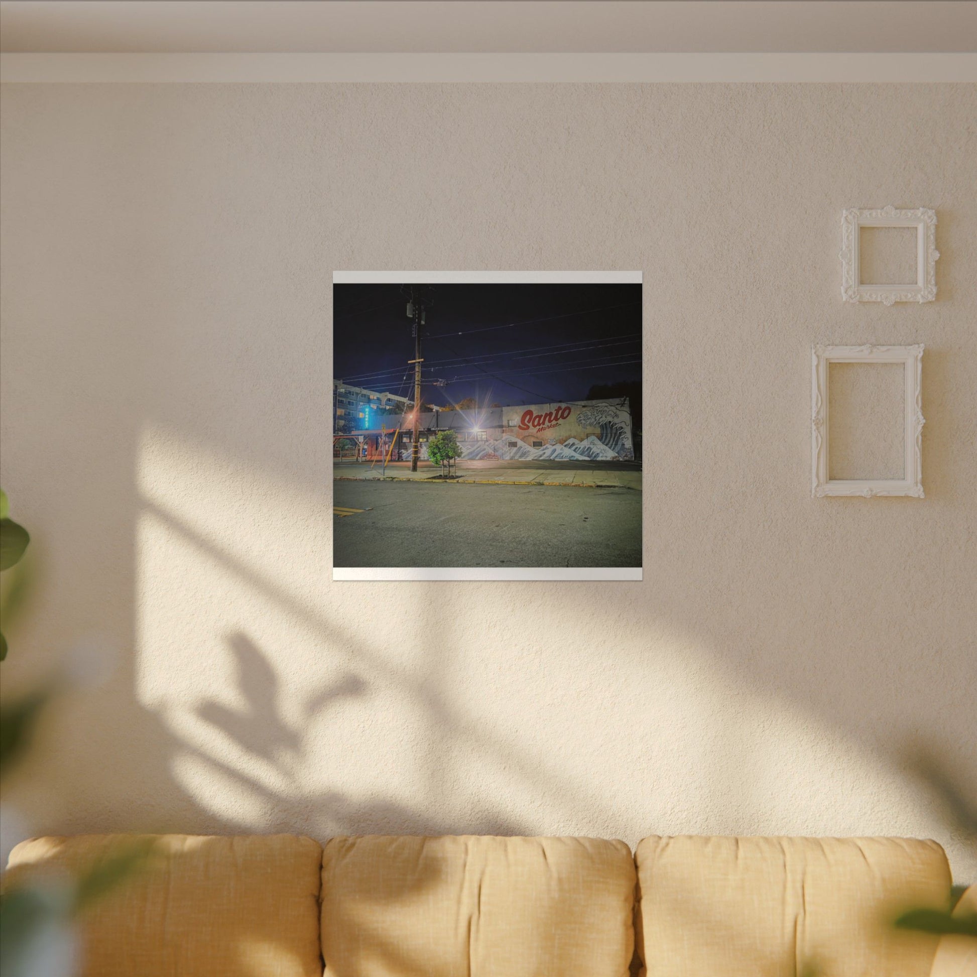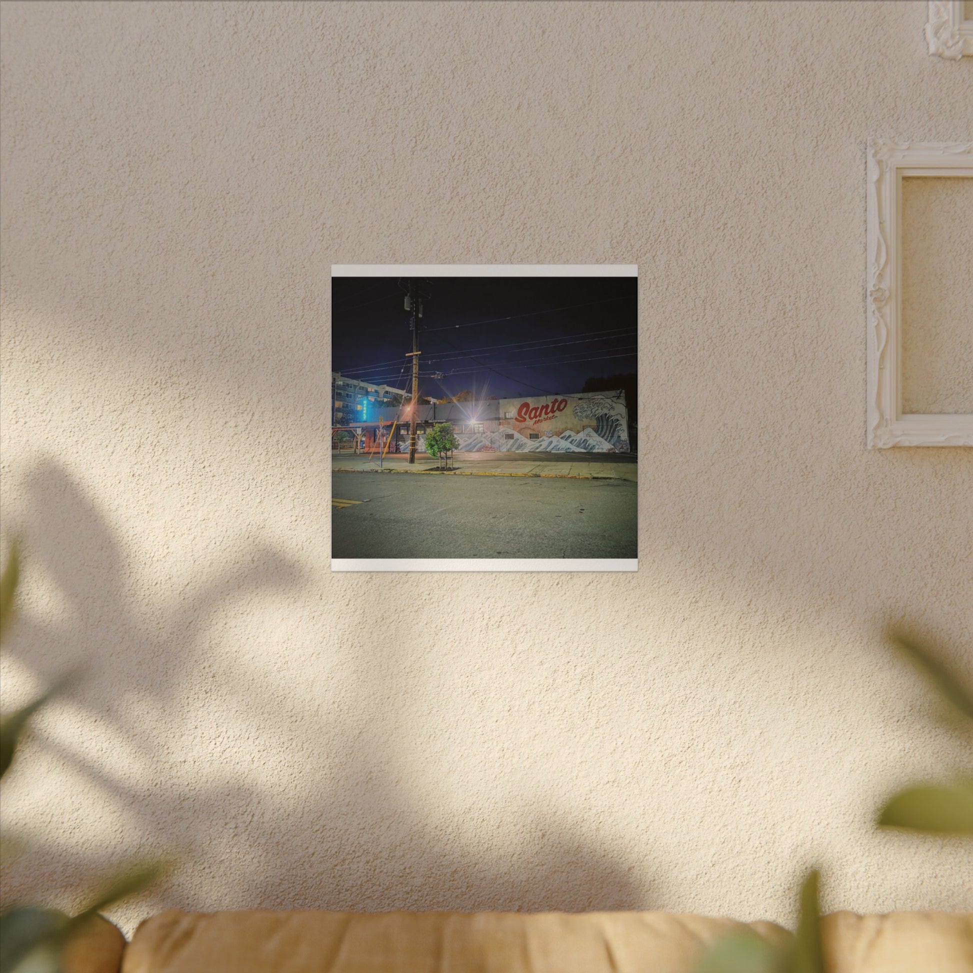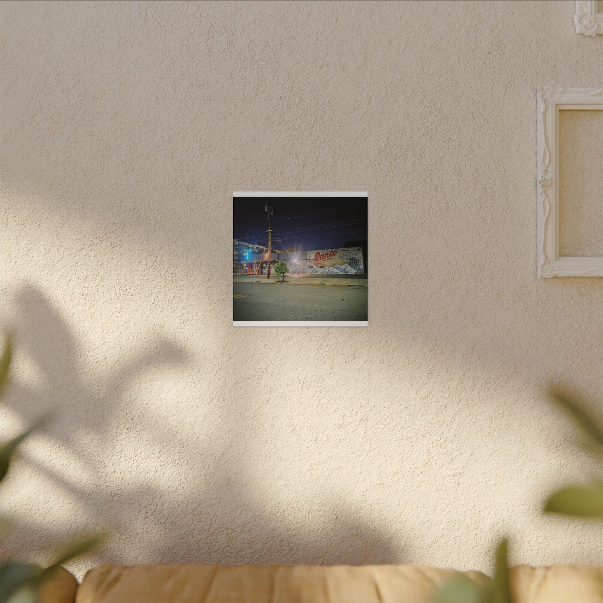 This stretched matte canvas brings a quiet-city-at-night mural into your space with rich, lasting color and a subtle textured finish. The photograph captures a nighttime street scene — neon glows, a mural reading “Santo,” and soft reflections across pavement — translated onto a high-quality cotton/poly canvas with a low-sheen matte coating. It hangs flush and steady on the wall, the slim 0.75" profile keeping the image front-and-center without bulk. Use it to ground a living room wall, add character to a studio, or create a moody focal point in an office. Each print is produced with eco-conscious materials and inks, so it looks vibrant while keeping sustainability in mind.