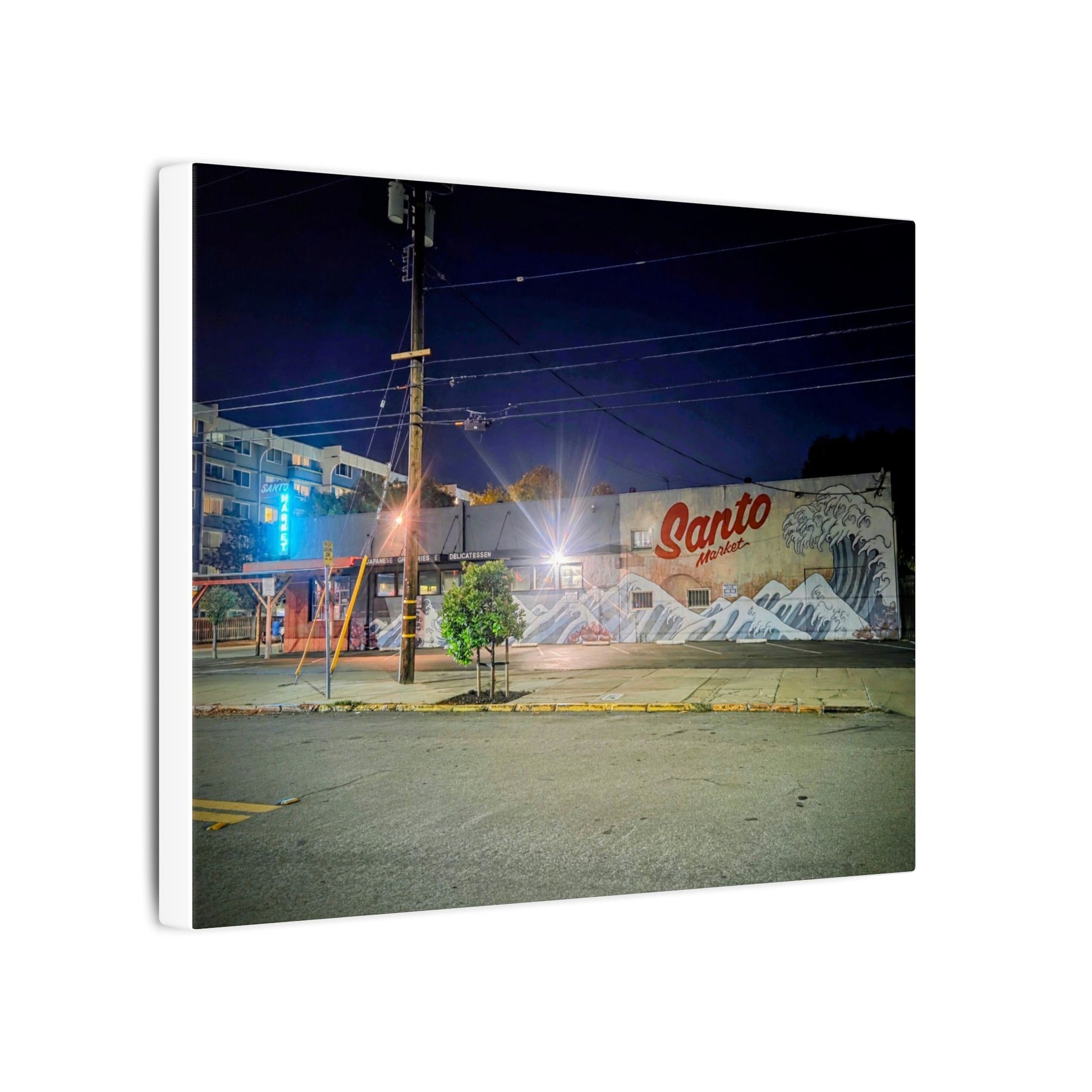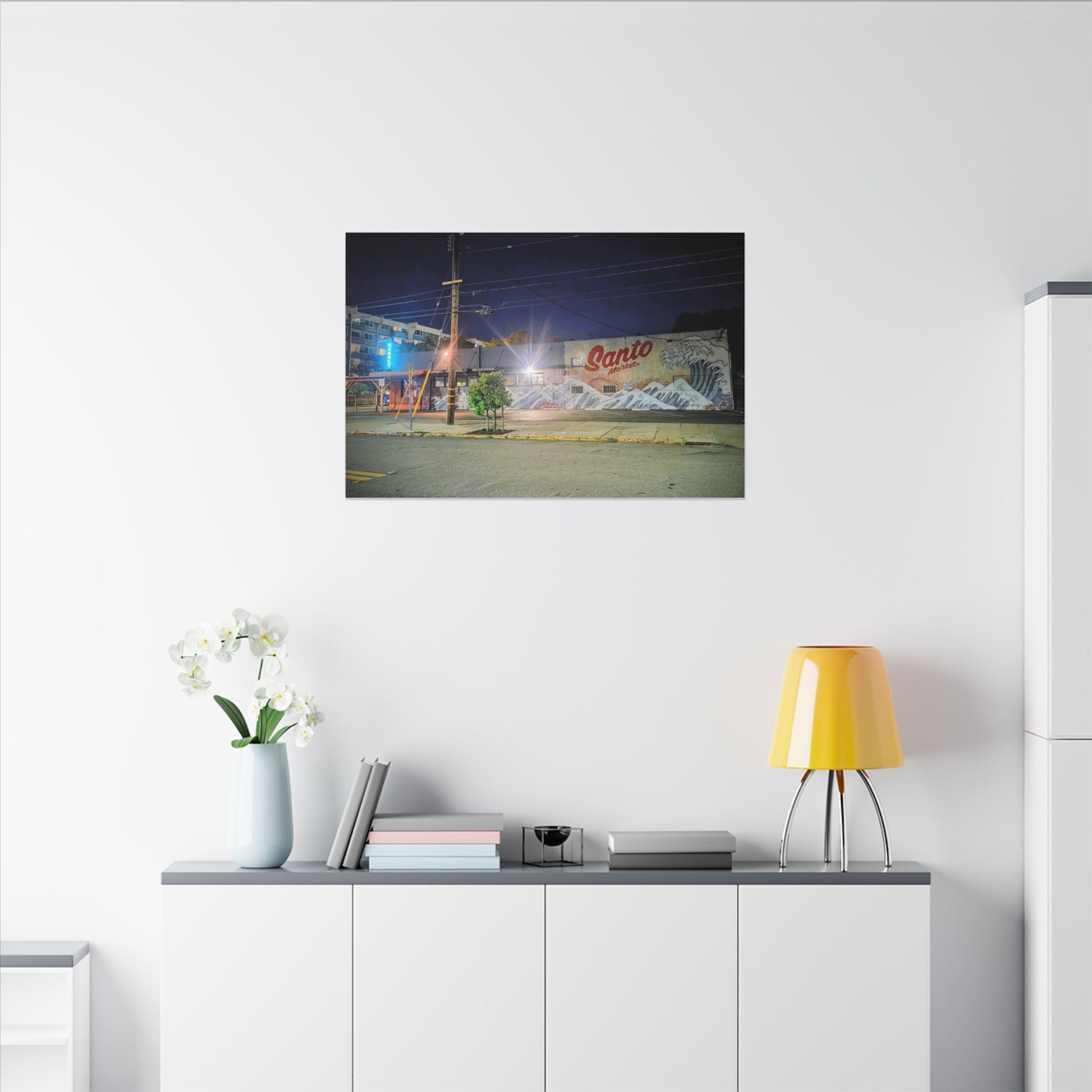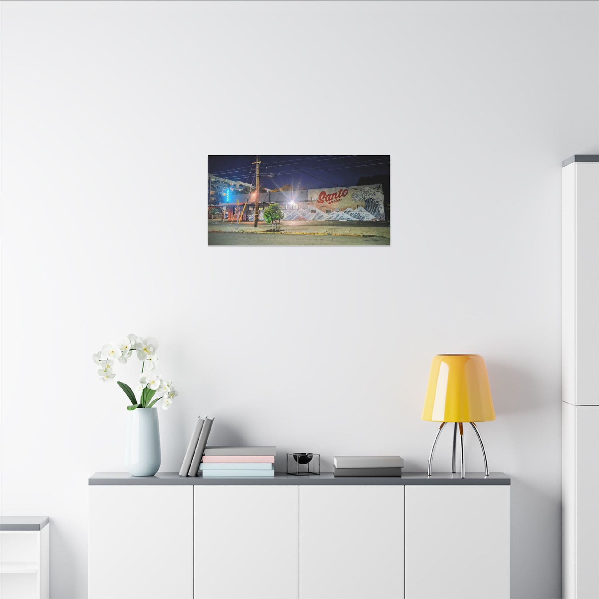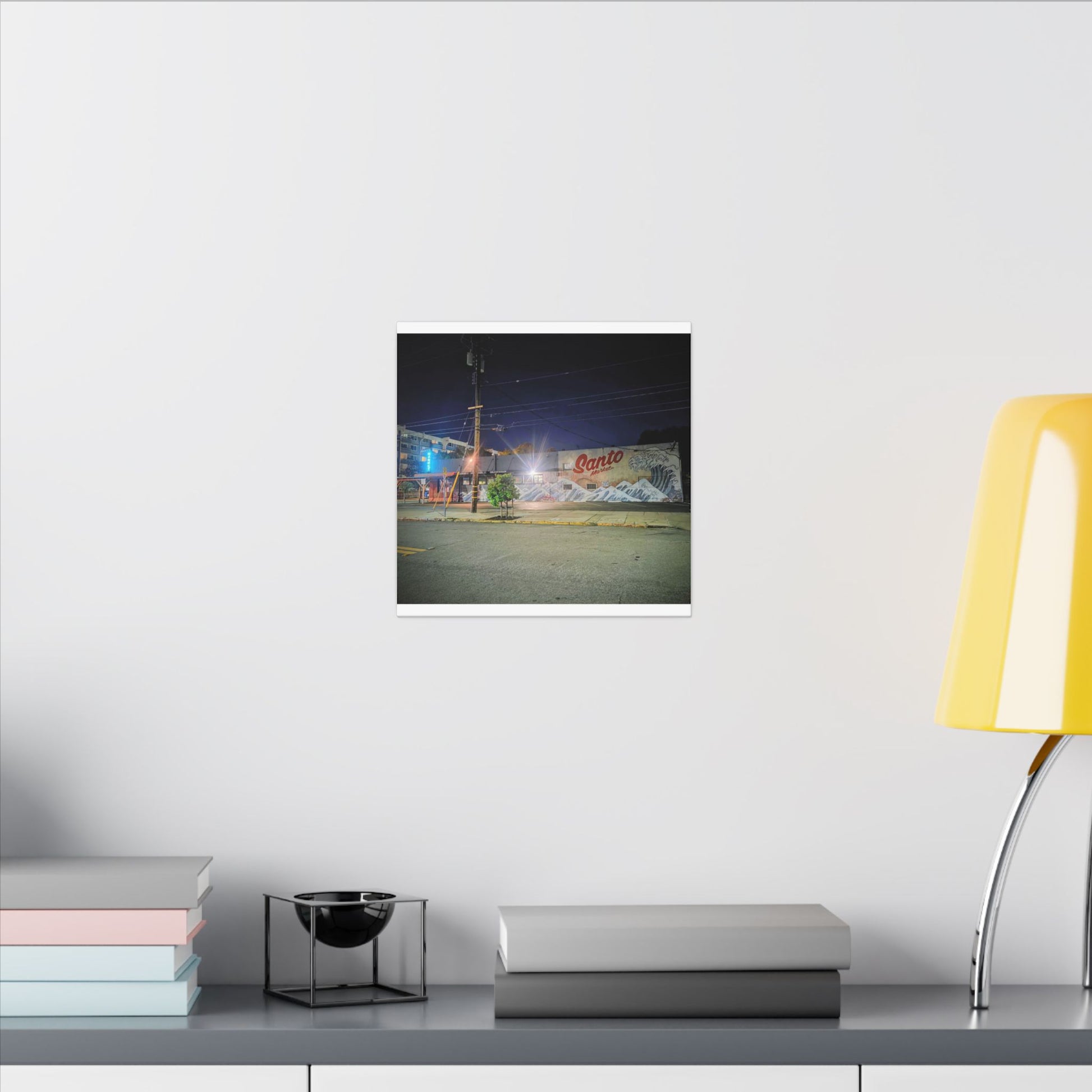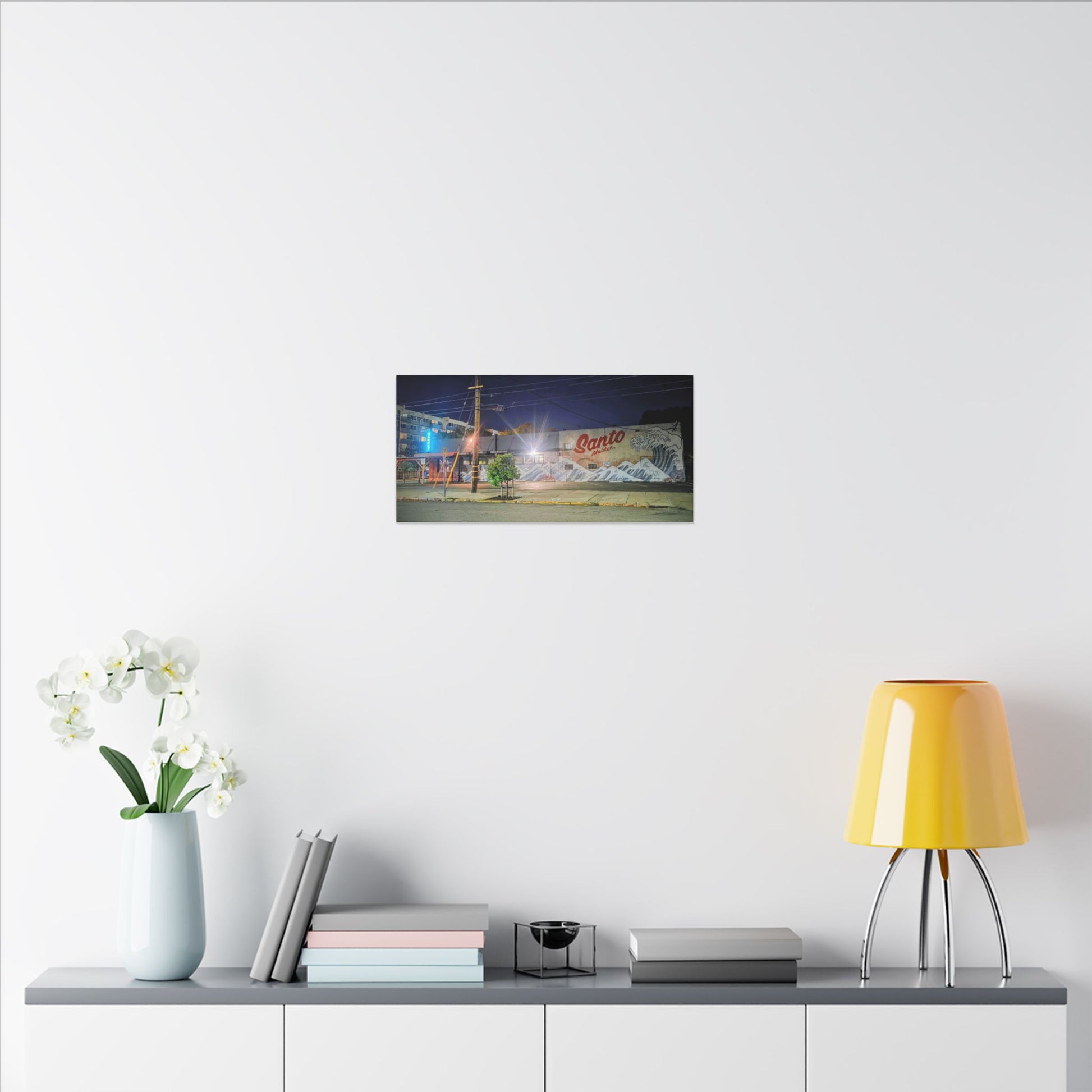 This stretched matte canvas brings a quiet-city-at-night mural into your space with rich, lasting color and a subtle textured finish. The photograph captures a nighttime street scene — neon glows, a mural reading “Santo,” and soft reflections across pavement — translated onto a high-quality cotton/poly canvas with a low-sheen matte coating. It hangs flush and steady on the wall, the slim 0.75" profile keeping the image front-and-center without bulk. Use it to ground a living room wall, add character to a studio, or create a moody focal point in an office. Each print is produced with eco-conscious materials and inks, so it looks vibrant while keeping sustainability in mind.