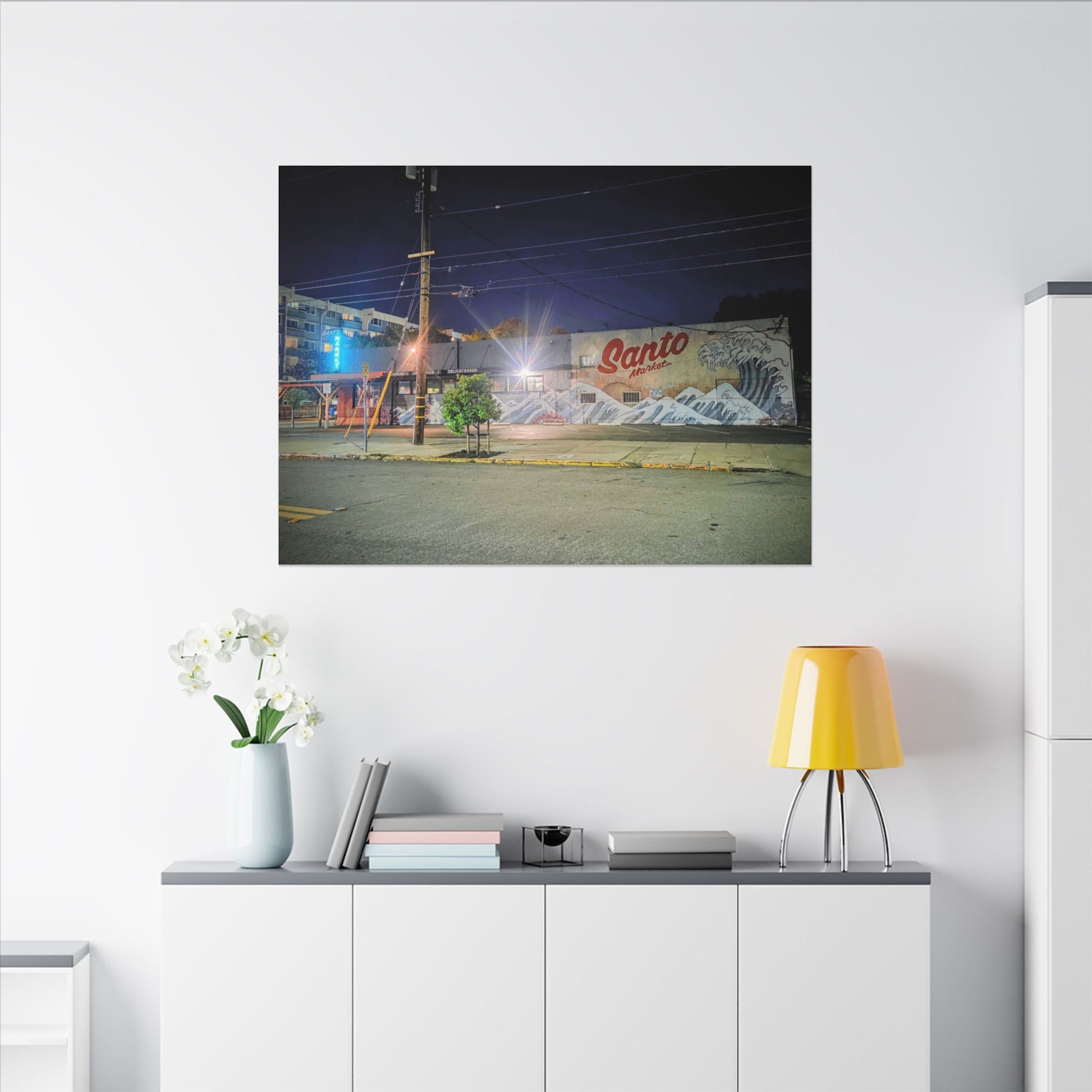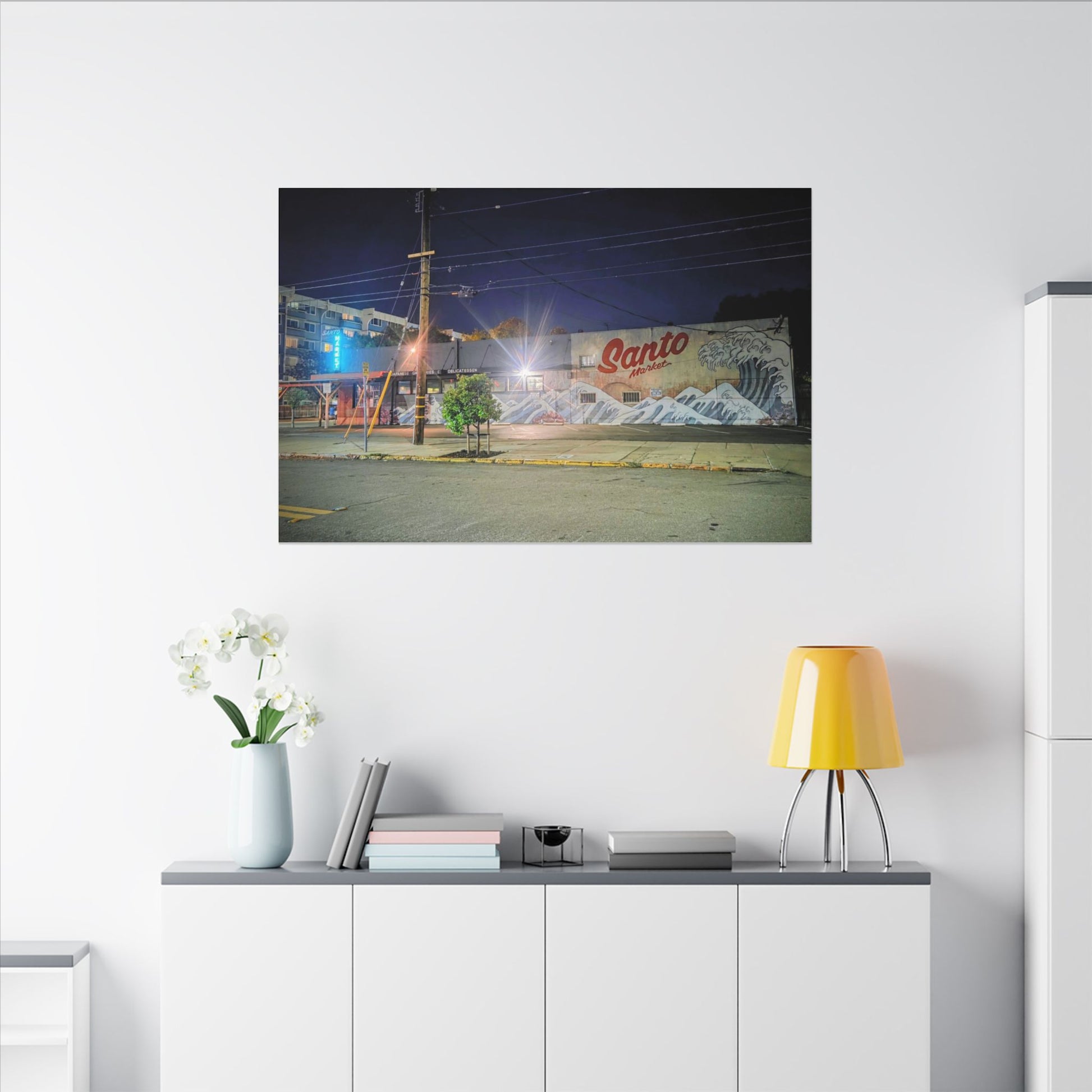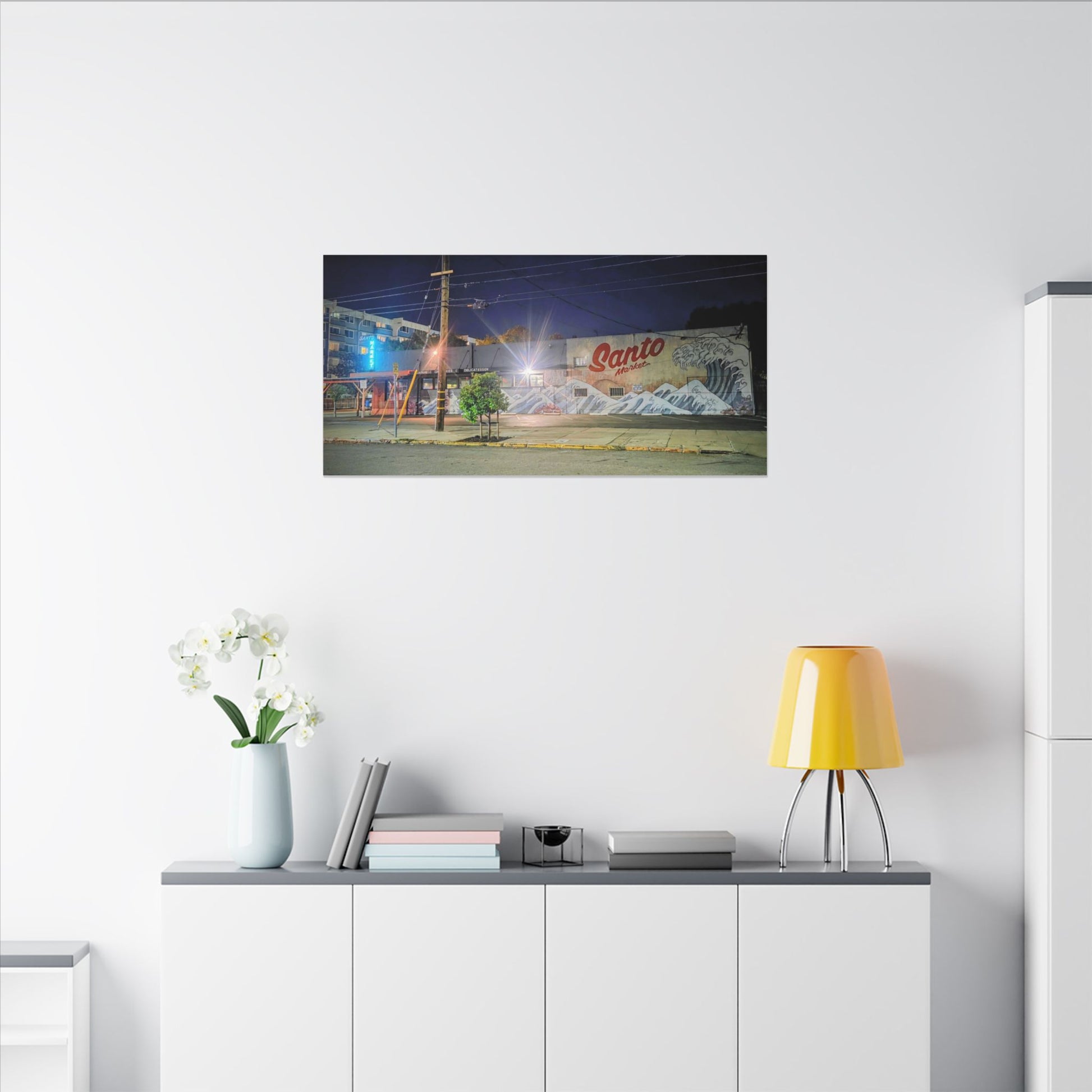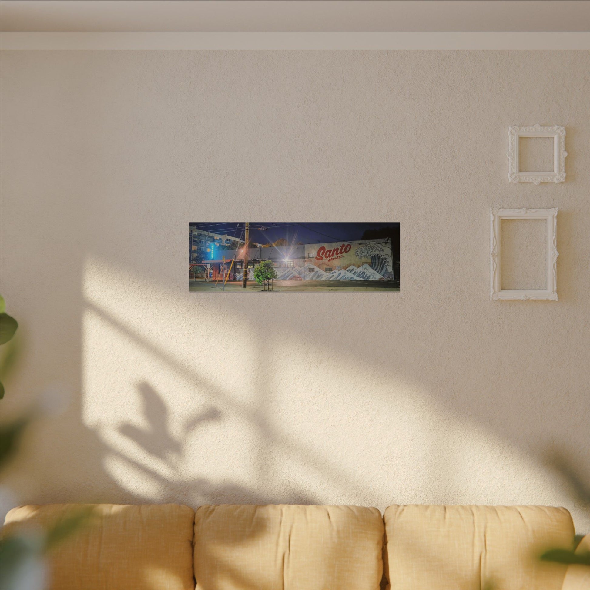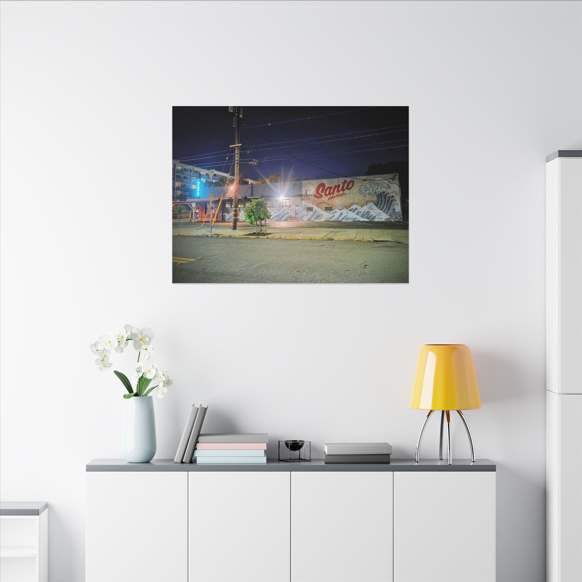 This stretched matte canvas brings a quiet-city-at-night mural into your space with rich, lasting color and a subtle textured finish. The photograph captures a nighttime street scene — neon glows, a mural reading “Santo,” and soft reflections across pavement — translated onto a high-quality cotton/poly canvas with a low-sheen matte coating. It hangs flush and steady on the wall, the slim 0.75" profile keeping the image front-and-center without bulk. Use it to ground a living room wall, add character to a studio, or create a moody focal point in an office. Each print is produced with eco-conscious materials and inks, so it looks vibrant while keeping sustainability in mind.