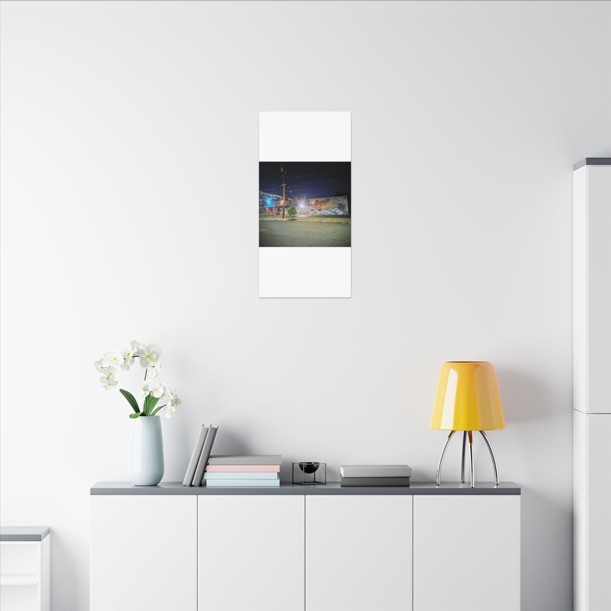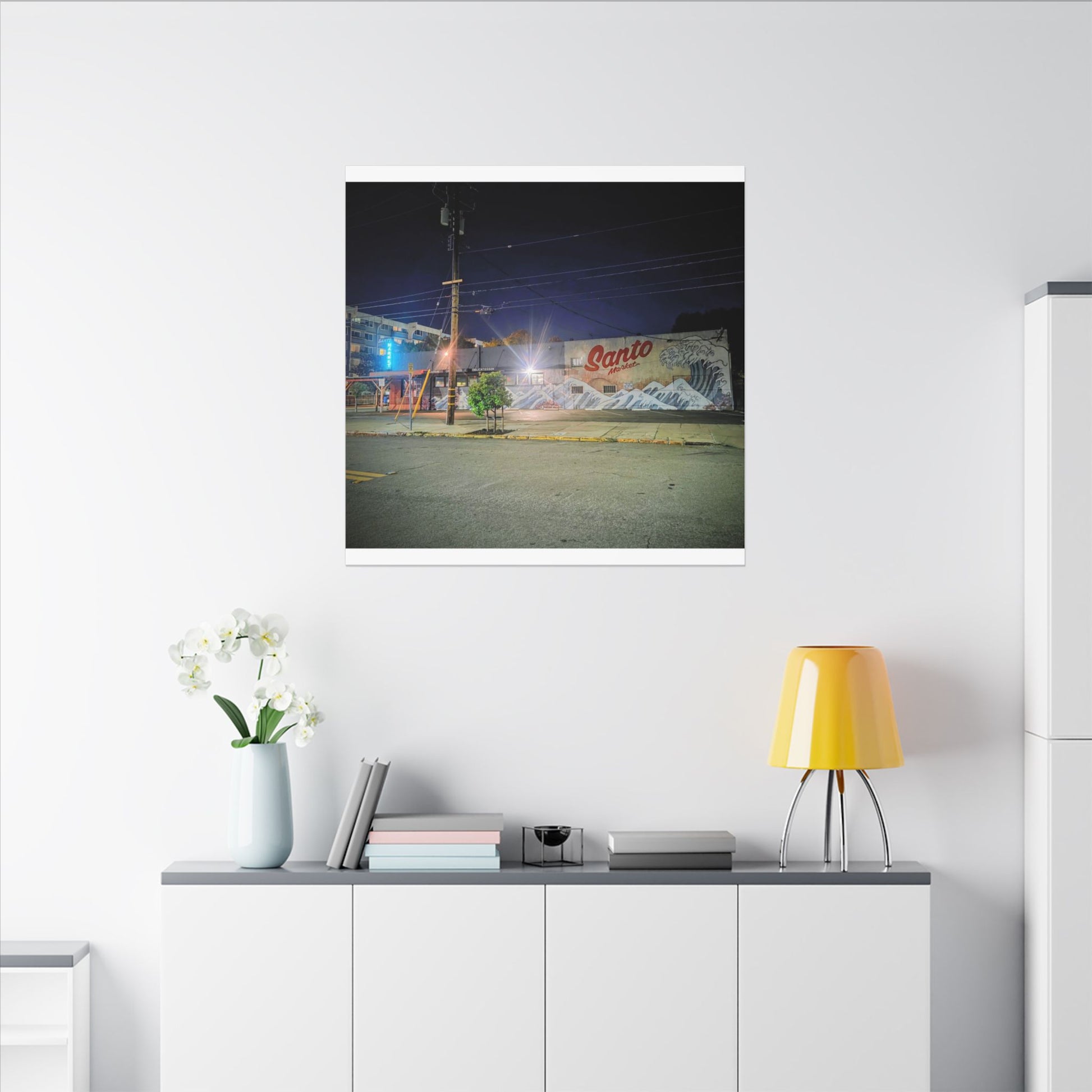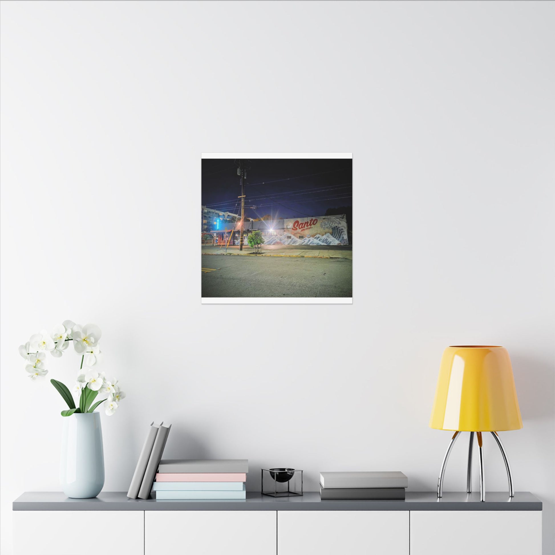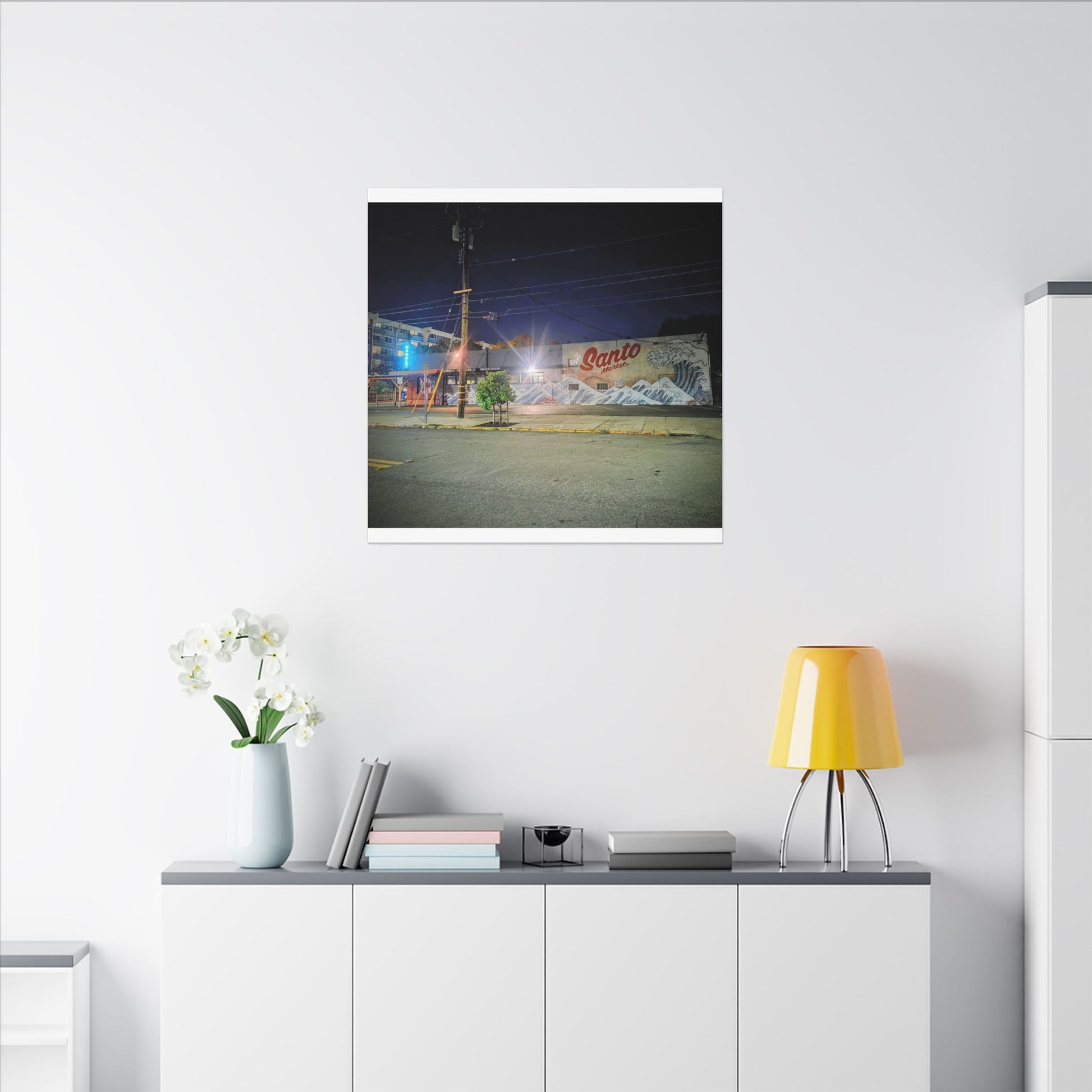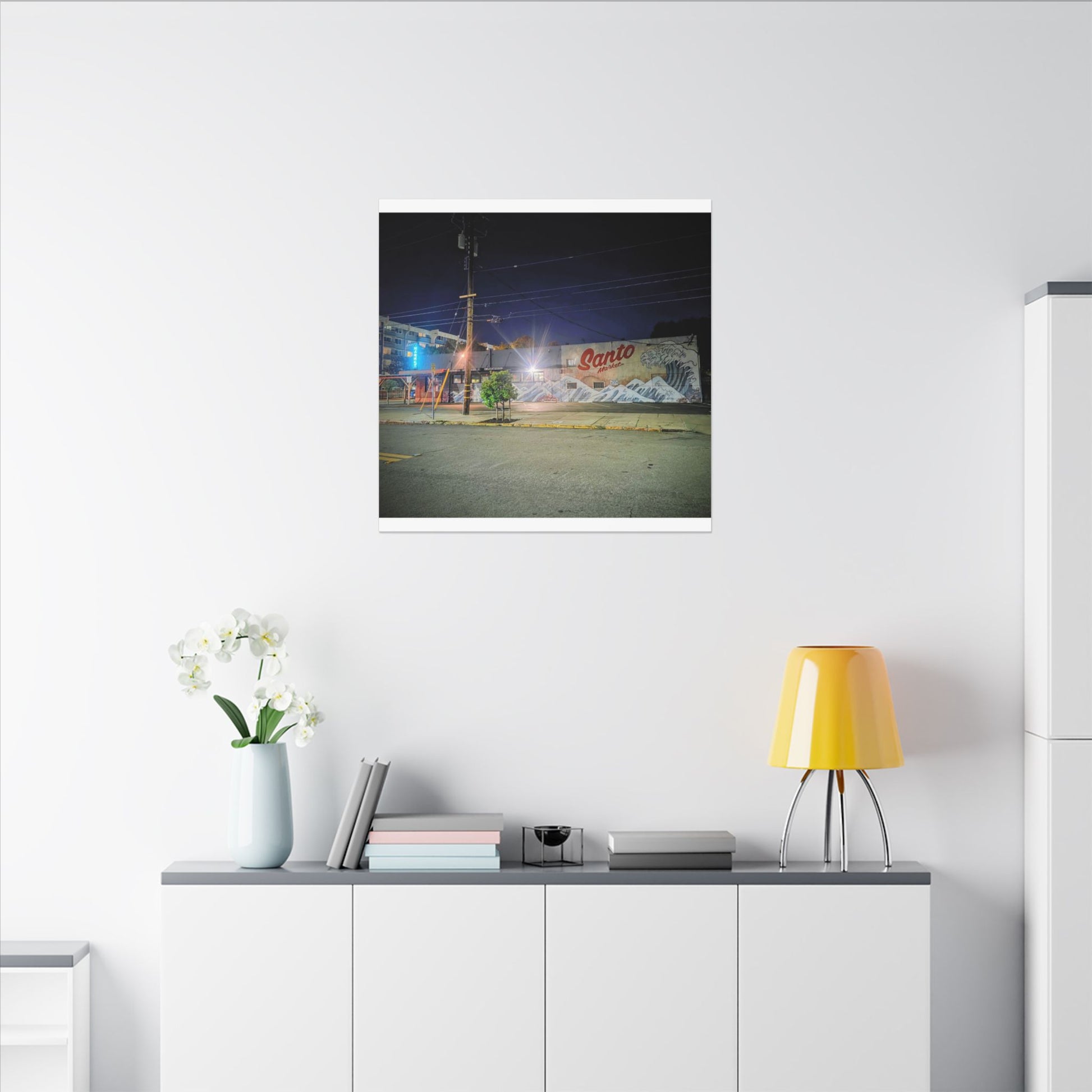 This stretched matte canvas brings a quiet-city-at-night mural into your space with rich, lasting color and a subtle textured finish. The photograph captures a nighttime street scene — neon glows, a mural reading “Santo,” and soft reflections across pavement — translated onto a high-quality cotton/poly canvas with a low-sheen matte coating. It hangs flush and steady on the wall, the slim 0.75" profile keeping the image front-and-center without bulk. Use it to ground a living room wall, add character to a studio, or create a moody focal point in an office. Each print is produced with eco-conscious materials and inks, so it looks vibrant while keeping sustainability in mind.