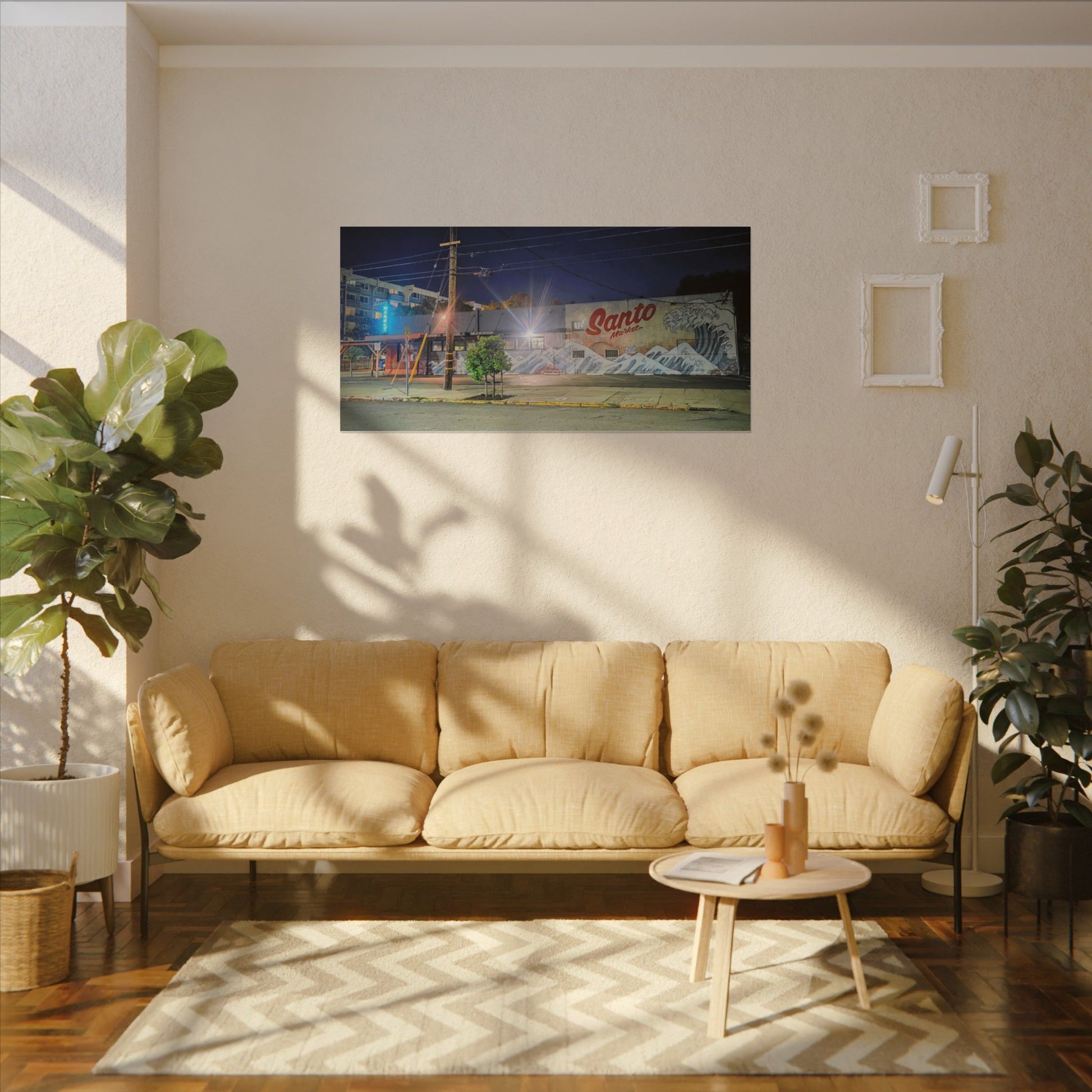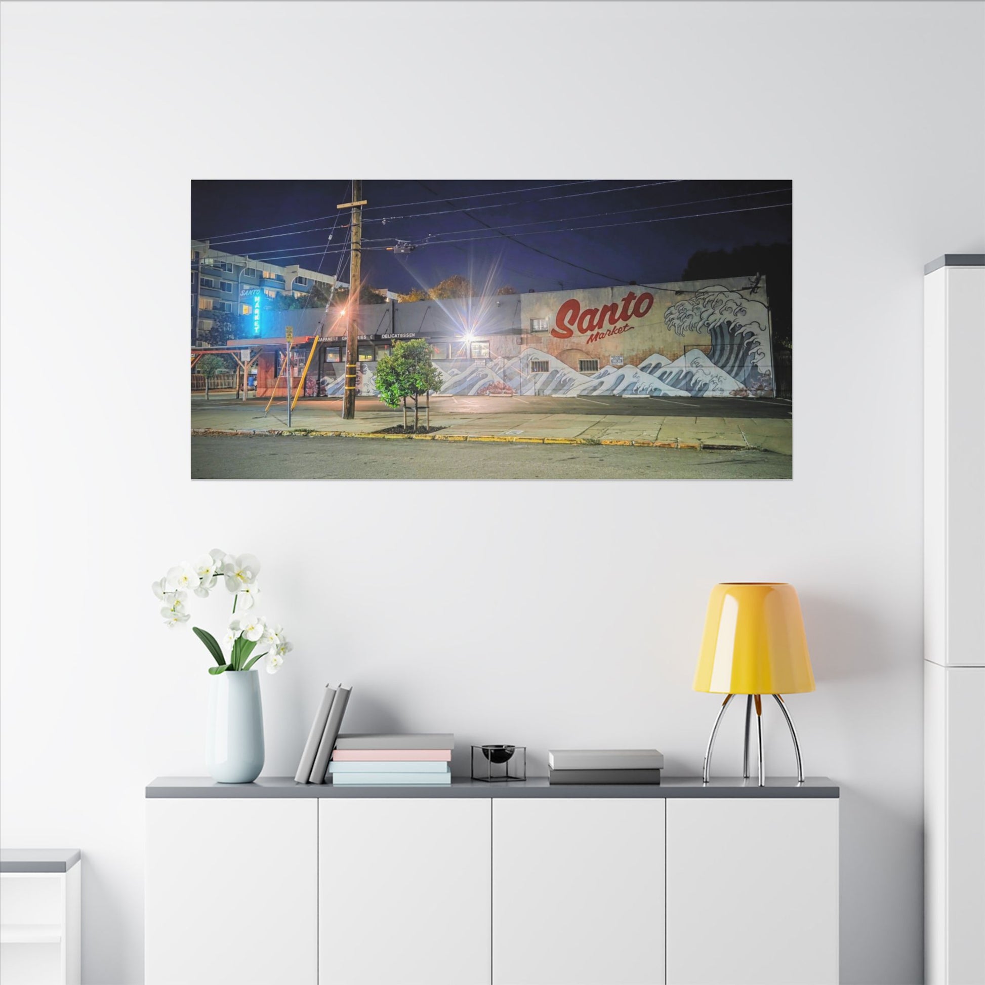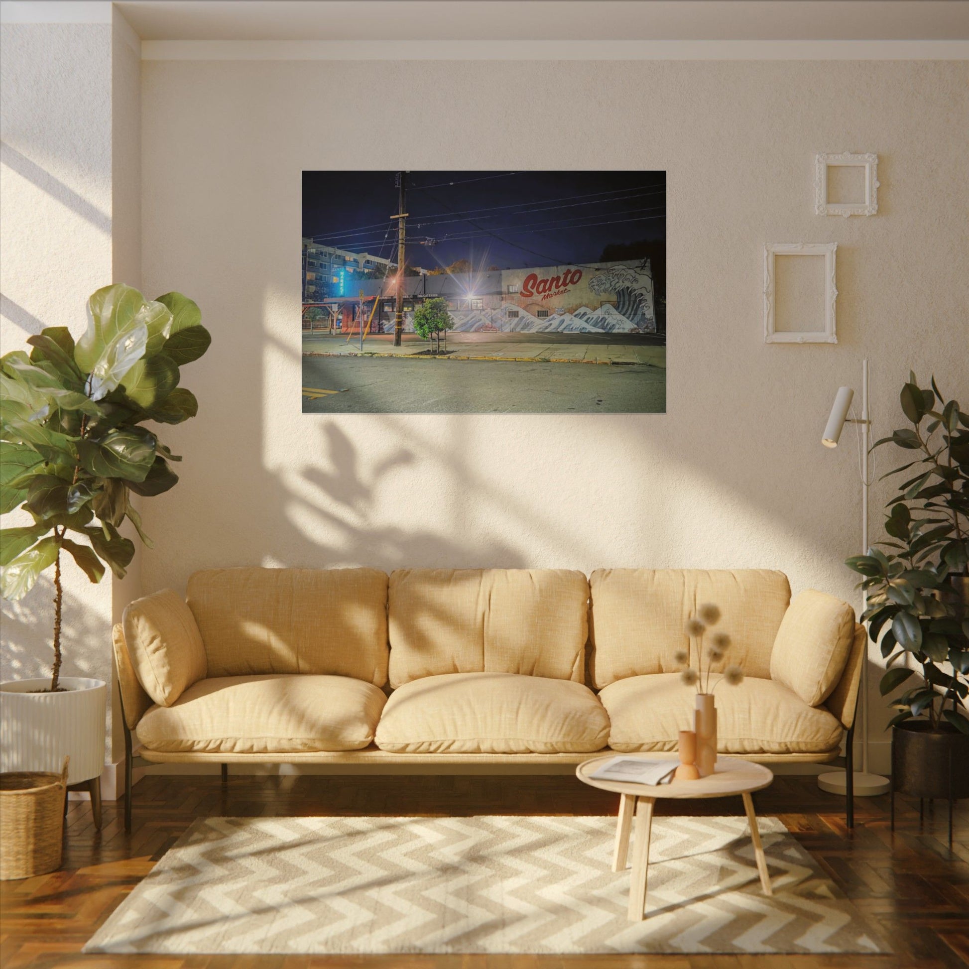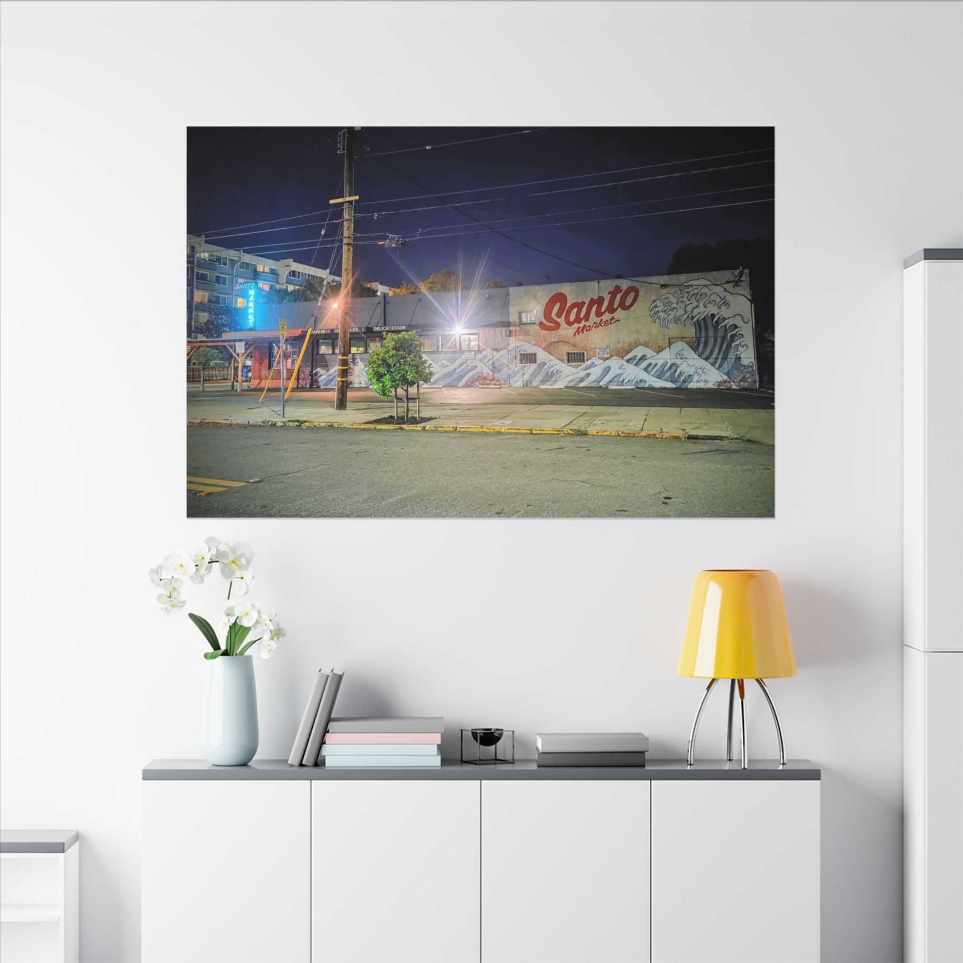 This stretched matte canvas brings a quiet-city-at-night mural into your space with rich, lasting color and a subtle textured finish. The photograph captures a nighttime street scene — neon glows, a mural reading “Santo,” and soft reflections across pavement — translated onto a high-quality cotton/poly canvas with a low-sheen matte coating. It hangs flush and steady on the wall, the slim 0.75" profile keeping the image front-and-center without bulk. Use it to ground a living room wall, add character to a studio, or create a moody focal point in an office. Each print is produced with eco-conscious materials and inks, so it looks vibrant while keeping sustainability in mind.