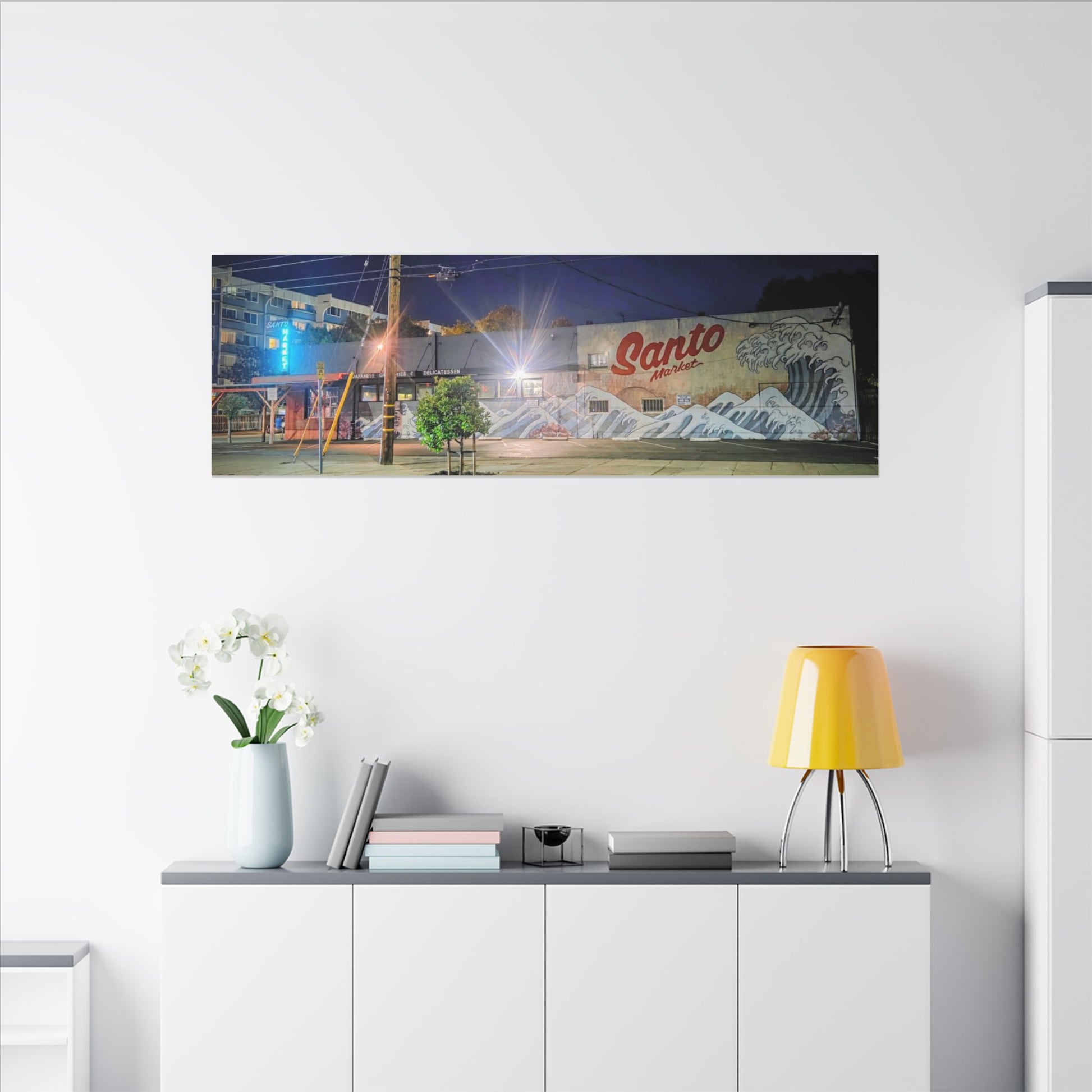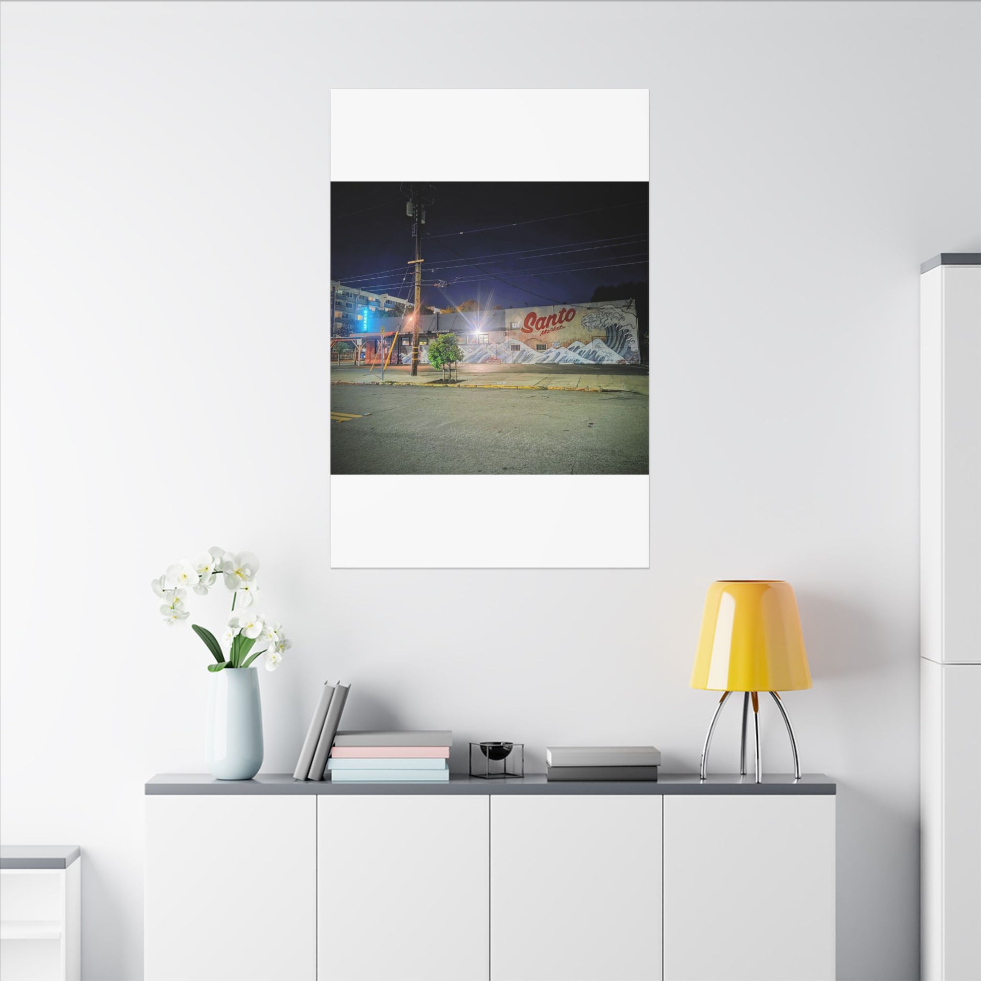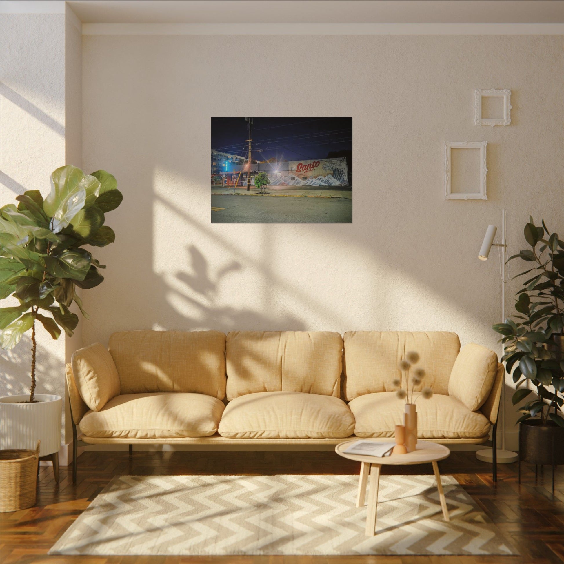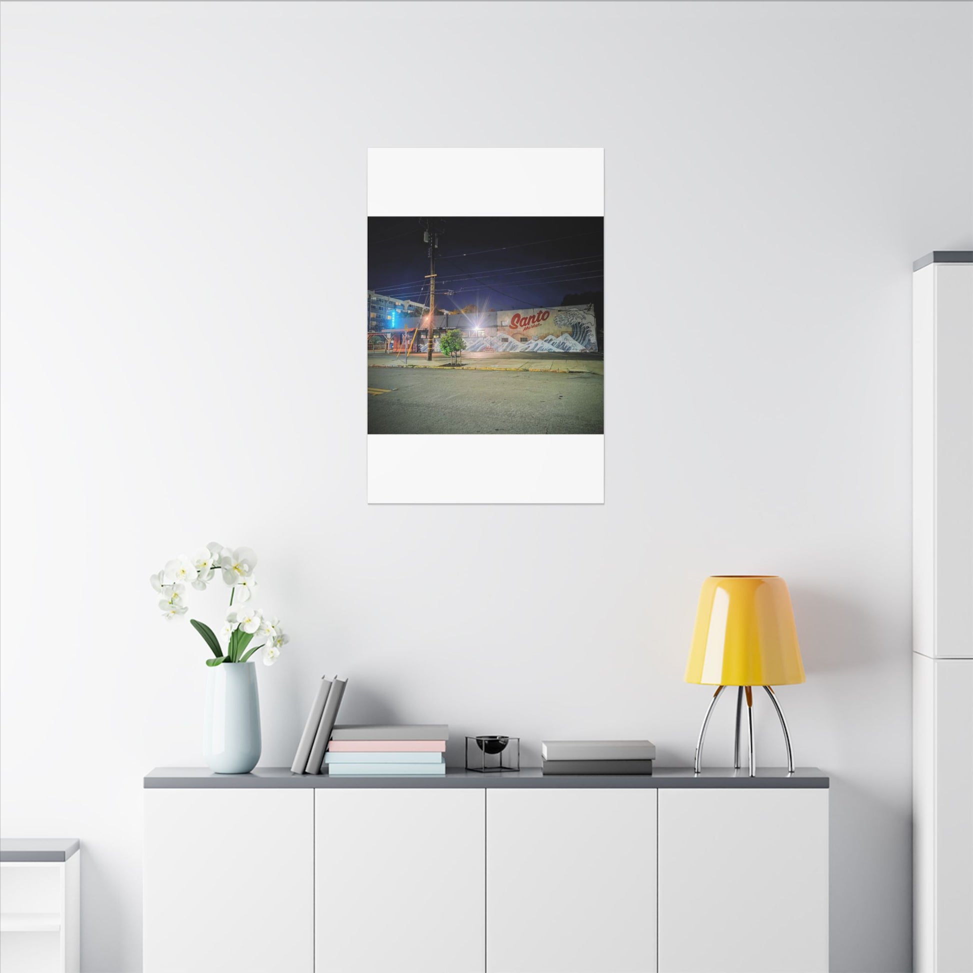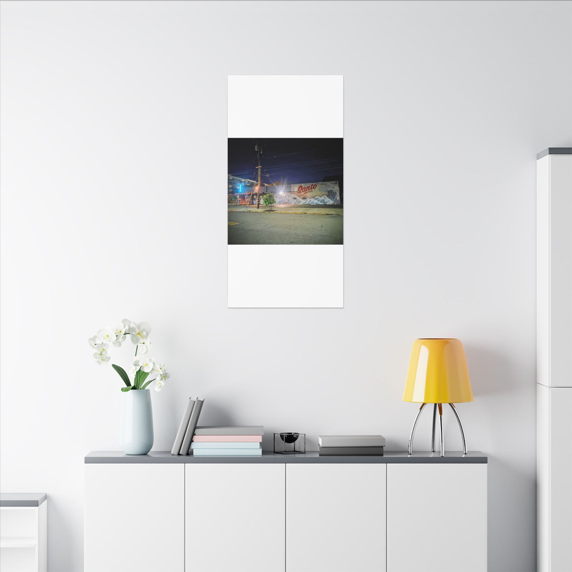 This stretched matte canvas brings a quiet-city-at-night mural into your space with rich, lasting color and a subtle textured finish. The photograph captures a nighttime street scene — neon glows, a mural reading “Santo,” and soft reflections across pavement — translated onto a high-quality cotton/poly canvas with a low-sheen matte coating. It hangs flush and steady on the wall, the slim 0.75" profile keeping the image front-and-center without bulk. Use it to ground a living room wall, add character to a studio, or create a moody focal point in an office. Each print is produced with eco-conscious materials and inks, so it looks vibrant while keeping sustainability in mind.