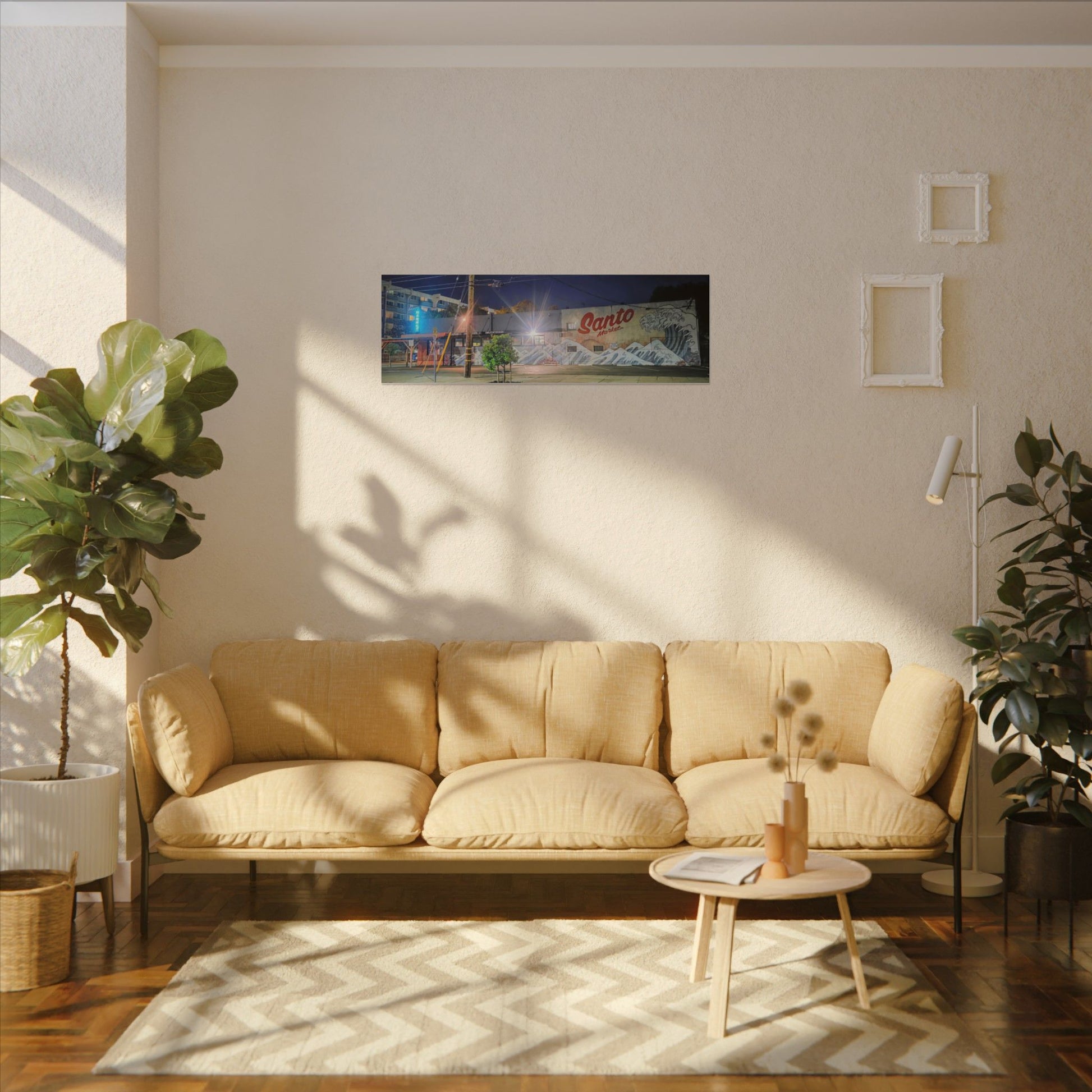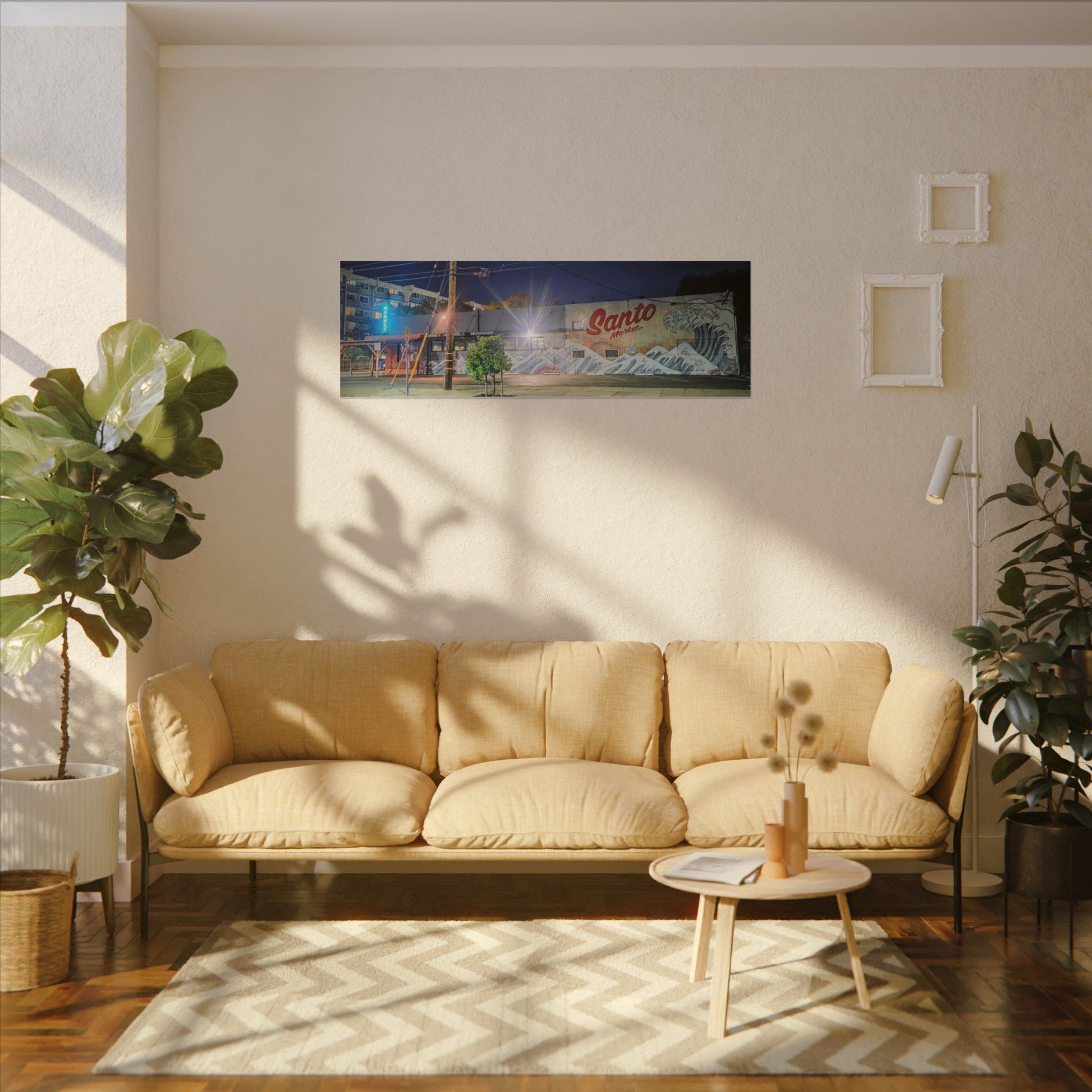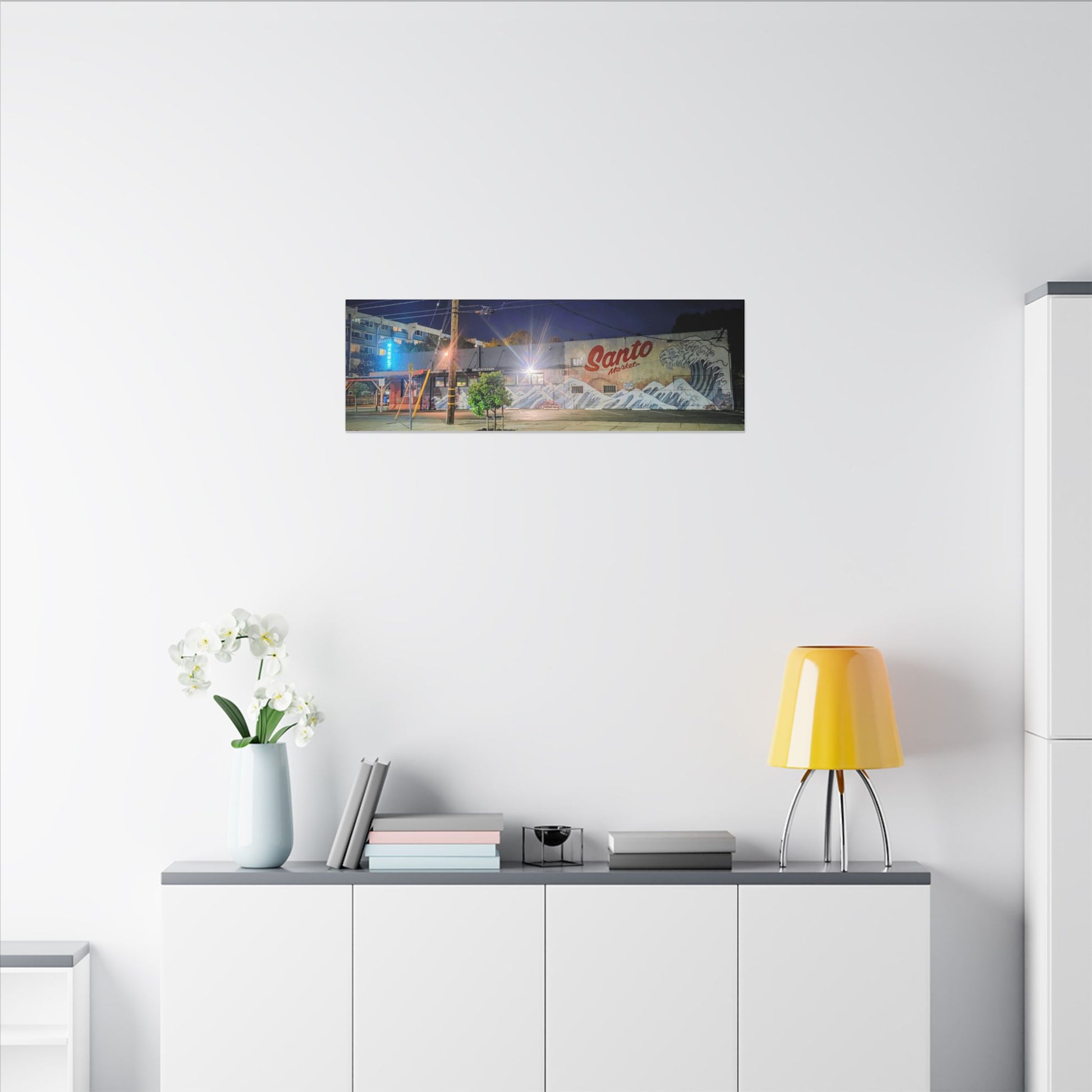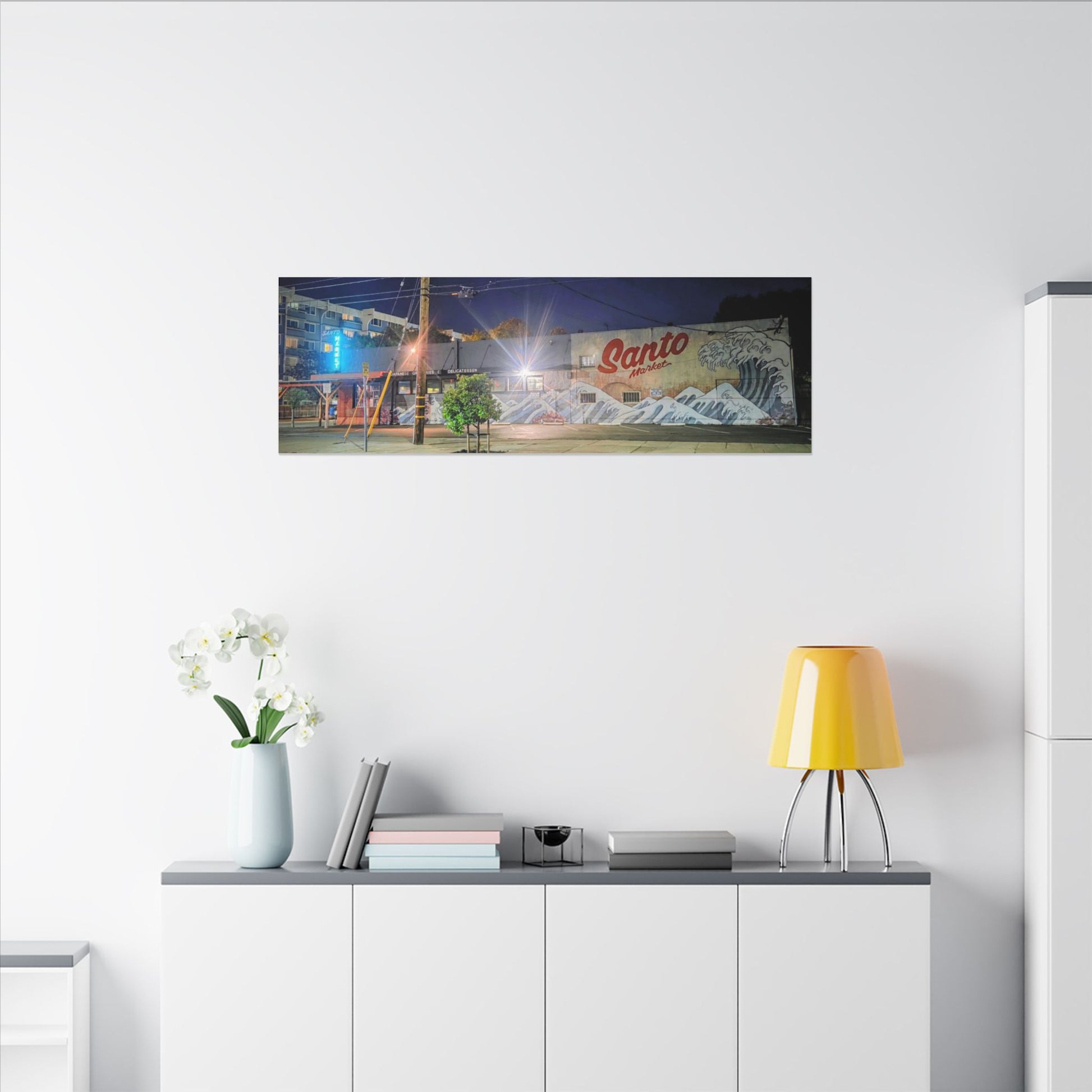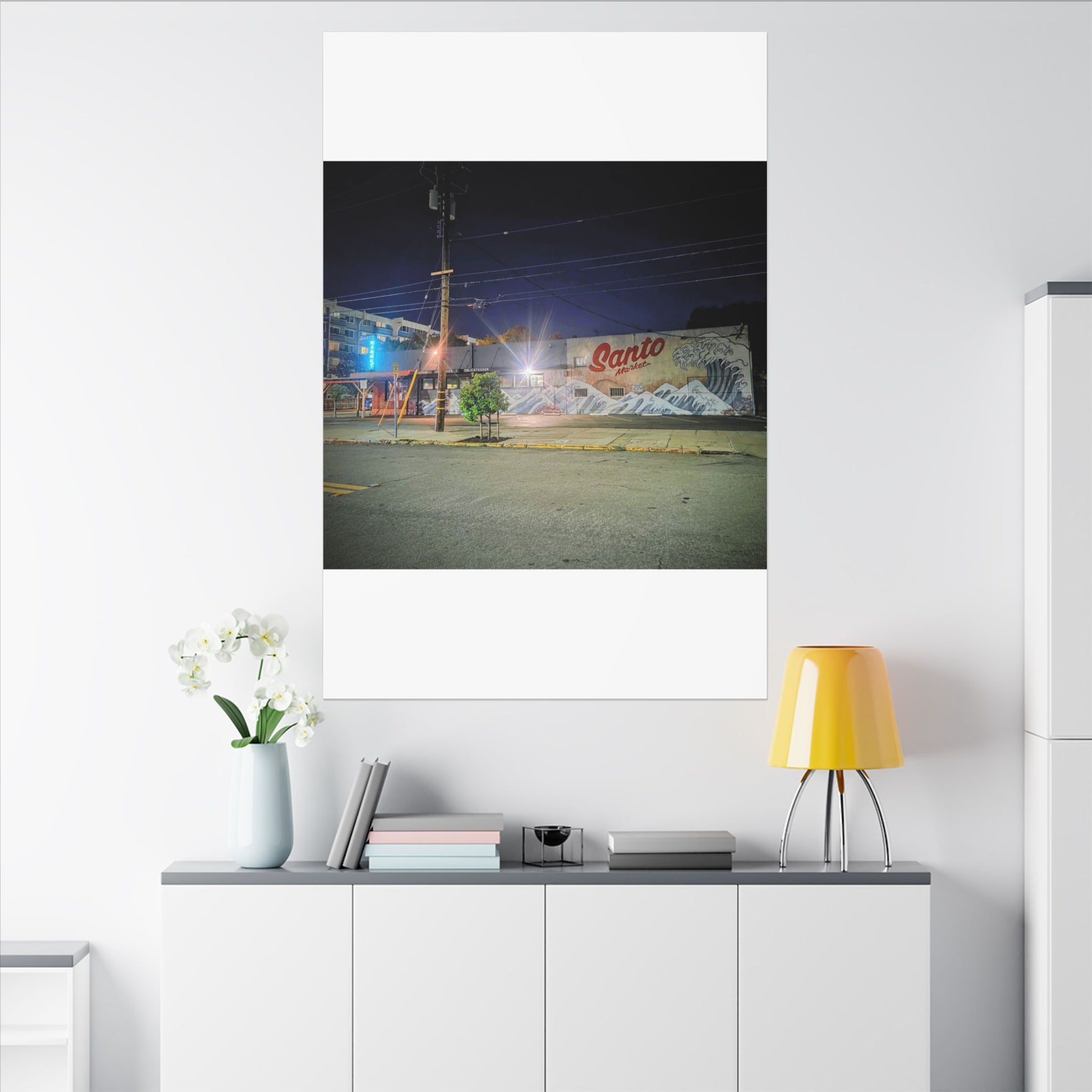 This stretched matte canvas brings a quiet-city-at-night mural into your space with rich, lasting color and a subtle textured finish. The photograph captures a nighttime street scene — neon glows, a mural reading “Santo,” and soft reflections across pavement — translated onto a high-quality cotton/poly canvas with a low-sheen matte coating. It hangs flush and steady on the wall, the slim 0.75" profile keeping the image front-and-center without bulk. Use it to ground a living room wall, add character to a studio, or create a moody focal point in an office. Each print is produced with eco-conscious materials and inks, so it looks vibrant while keeping sustainability in mind.