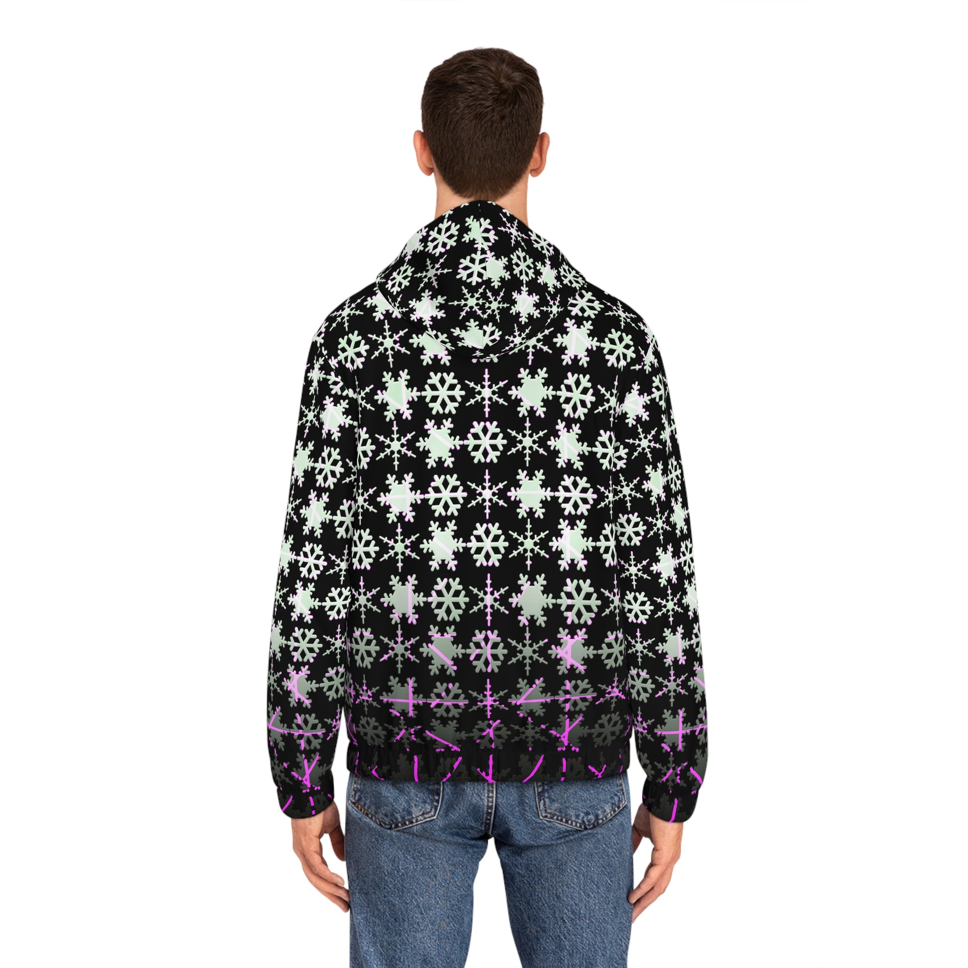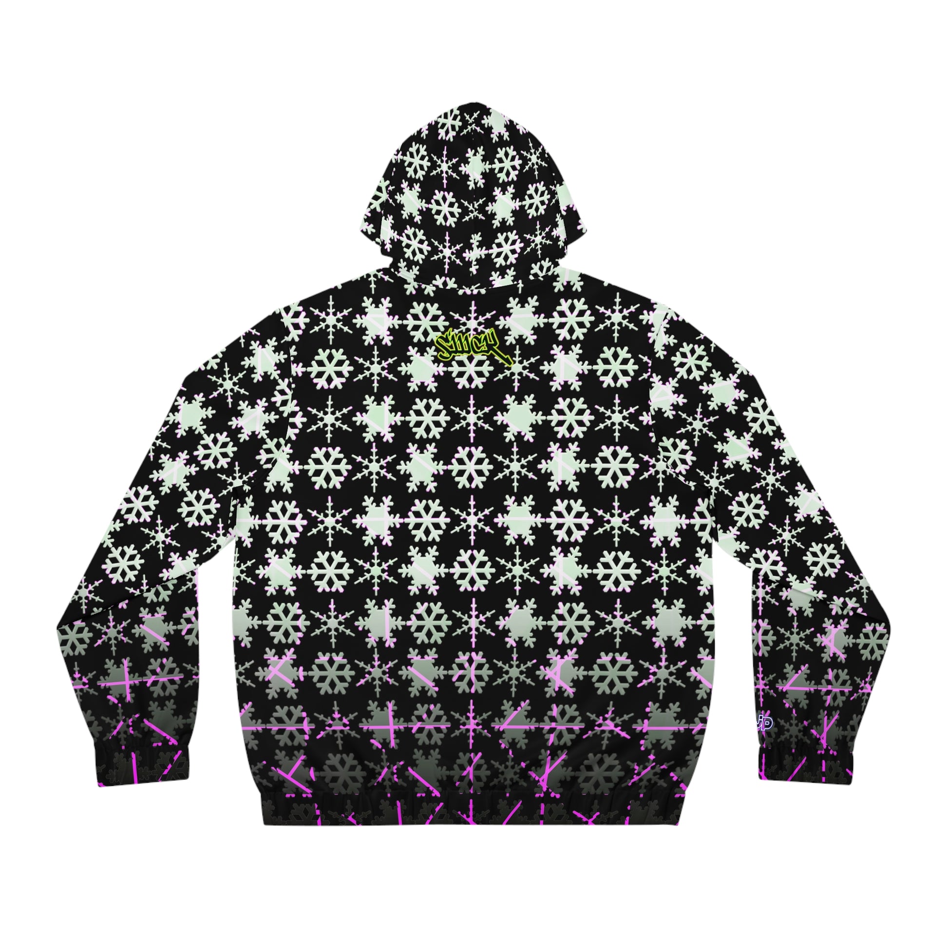 A cozy, full-zip hoodie wrapped in a striking snowflake motif that fades into soft violet crosses along the hem. The all-over print sits on a deep black background so the pale, minty snowflakes really pop — like a clear winter night lit by distant city lights. Lightweight and stretchy, it moves with you from brisk morning walks to late-night coffee runs. The gold-toned metal zipper and woven drawcords add an urban, slightly luxe edge while the elastic cuffs and hem keep the silhouette tidy. This is a hoodie for people who want winter-inspired style without the bulk: layered, versatile, and visually bold when you step out into cold air or gather with friends at seasonal nights out.